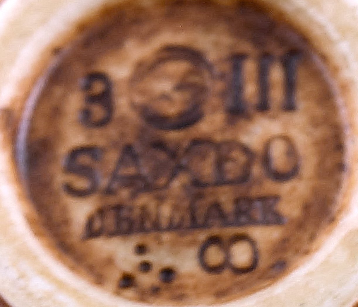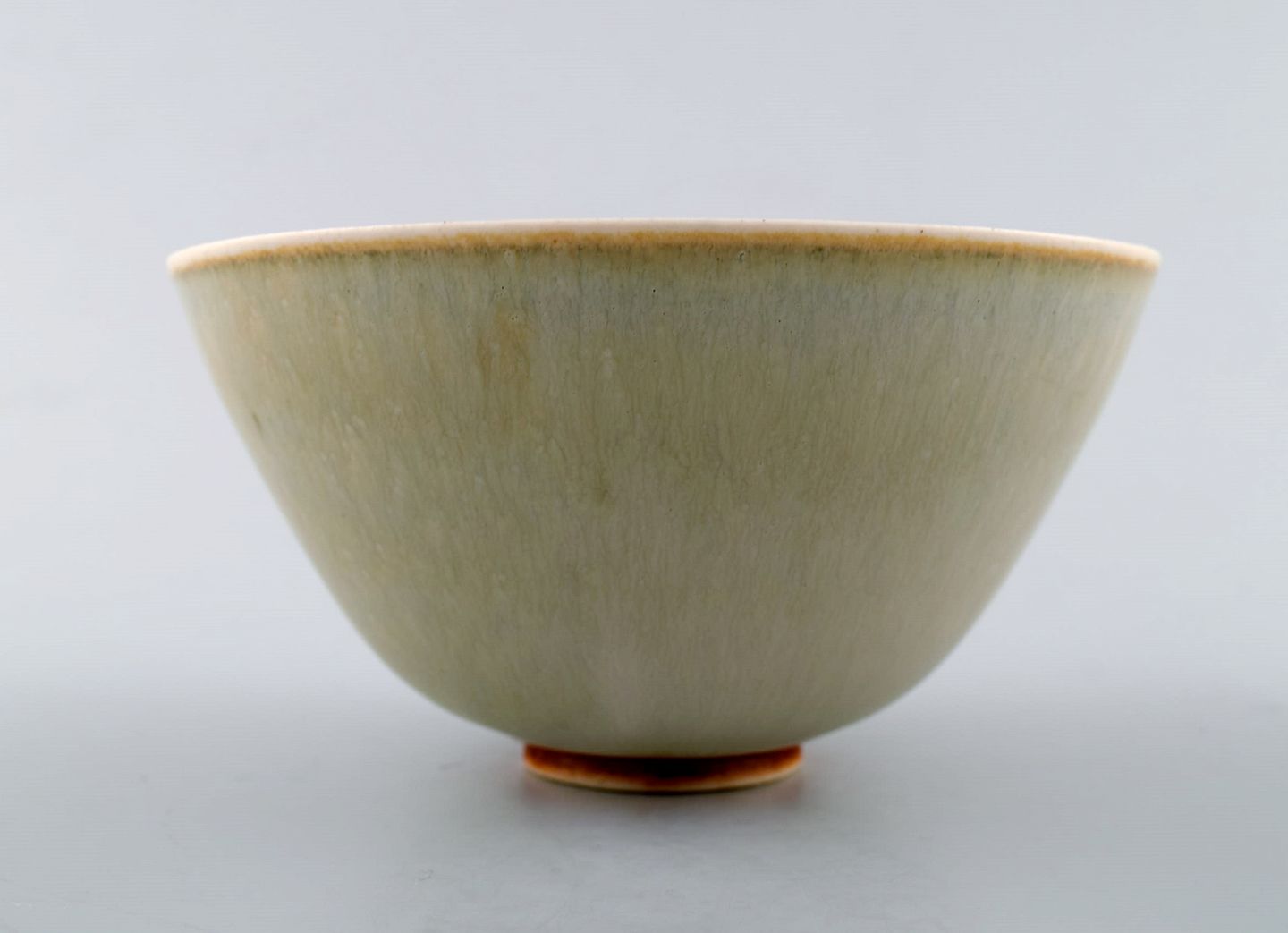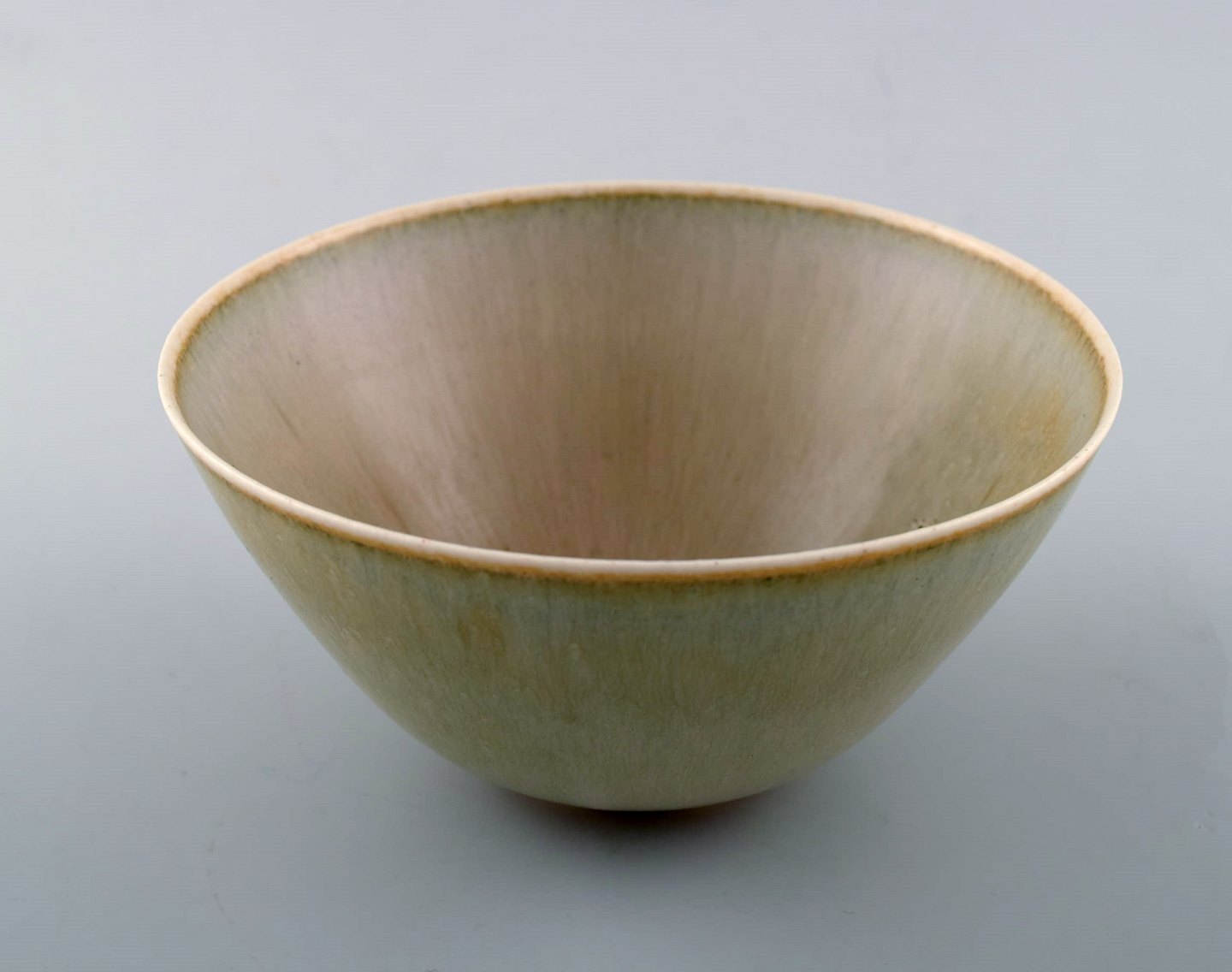 Saxbo skål af stentøj dekoreret med smuk æggeskalsglasur. Stemplet Saxbo. Måler 12 cm. x 6,5 cm. I perfekt stand.