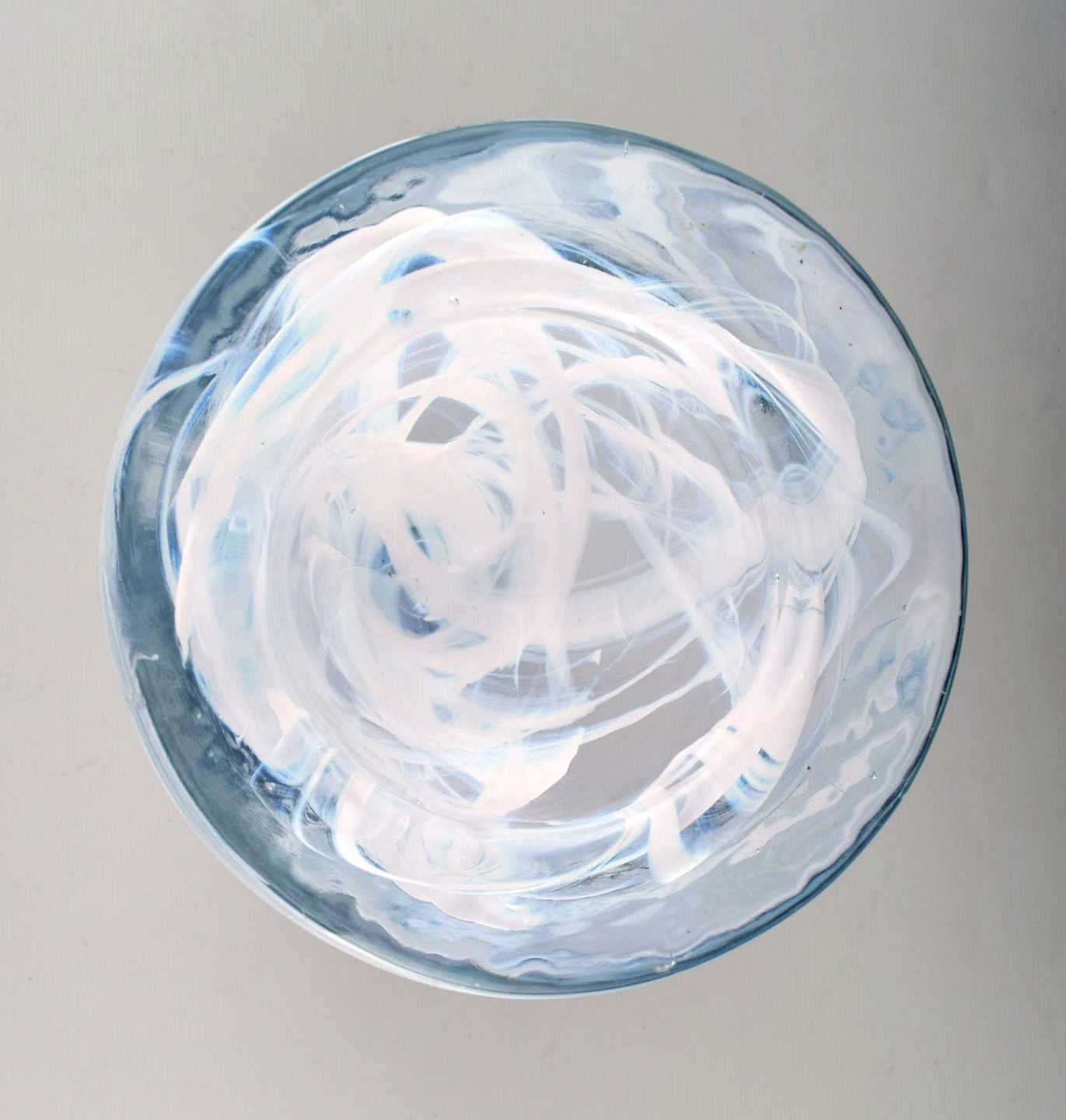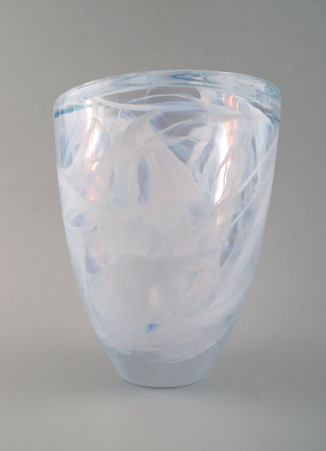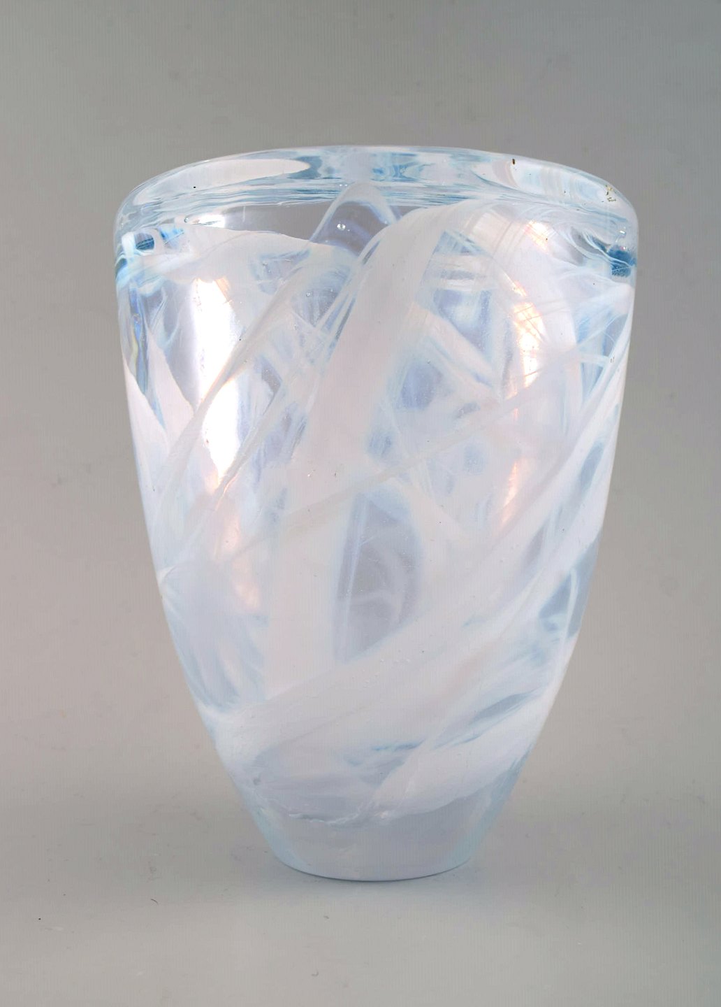 Svensk kunstglasvase i klart glas. Formgivet i 1970/80´erne. Højde 19 cm. Diameter 15 cm. I perfekt stand. Usigneret.