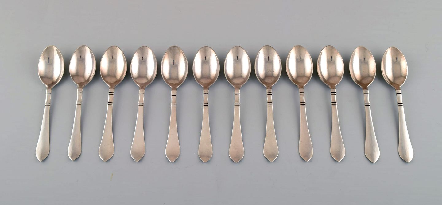 Georg Jensen Continental, 12 child spoons/ large tea spoons, silver cutlery, hand hammered. The cutlery is designed by Georg Jensen in 1906. In perfect condition. Measures: 15.5 cm.