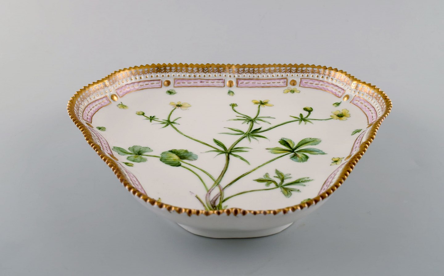 Royal Copenhagen Flora Danica tresidet fad af porcelæn, dekoreret i farver og guld med blomst.