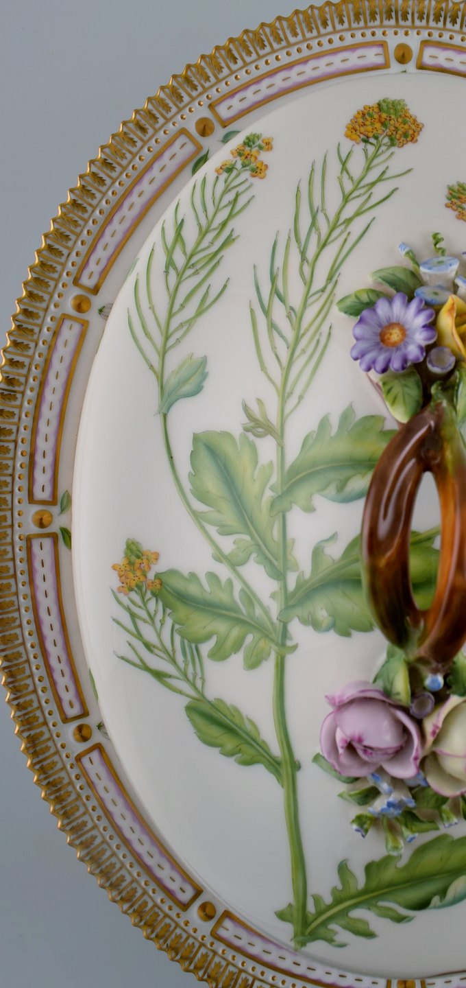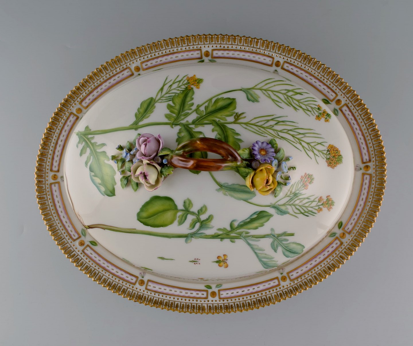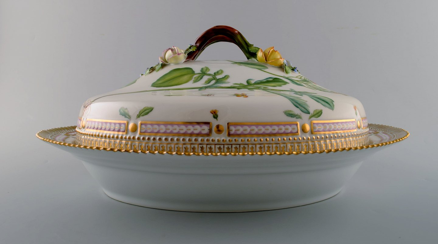 Royal Copenhagen Flora Danica large tureen / lidded bowl, branch-shaped handle, repousse flowers. Dessin No. 20/3567. Length 40 cm. Height 17 cm. 1st. factory quality. In perfect condition.
