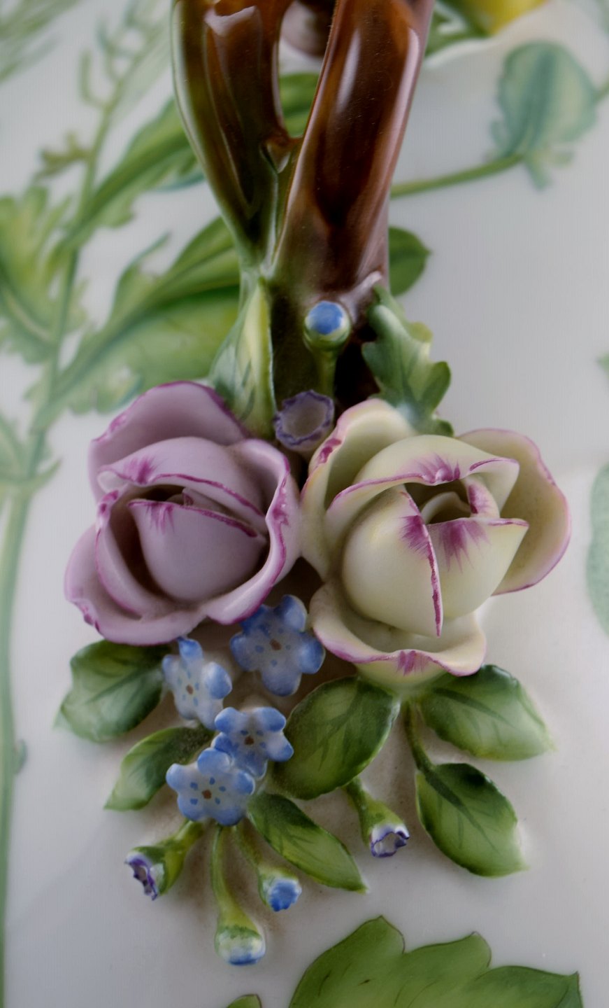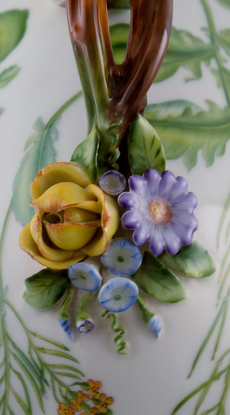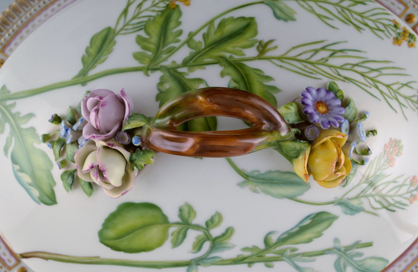 Royal Copenhagen Flora Danica large tureen / lidded bowl, branch-shaped handle, repousse flowers. Dessin No. 20/3567. Length 40 cm. Height 17 cm. 1st. factory quality. In perfect condition.