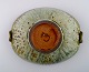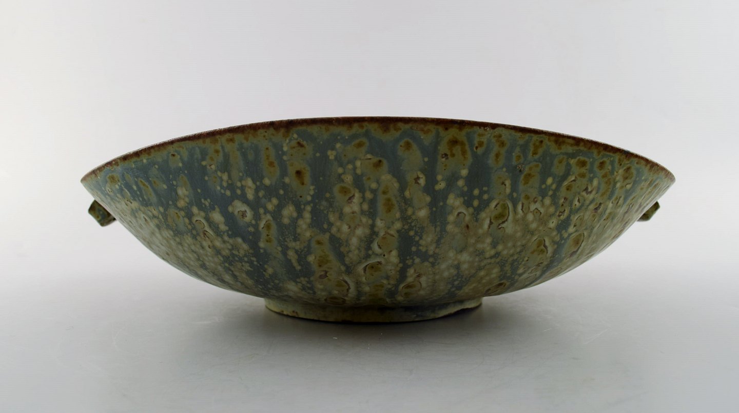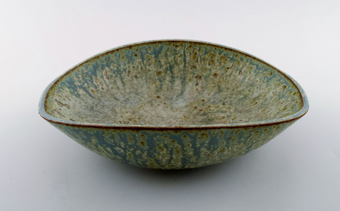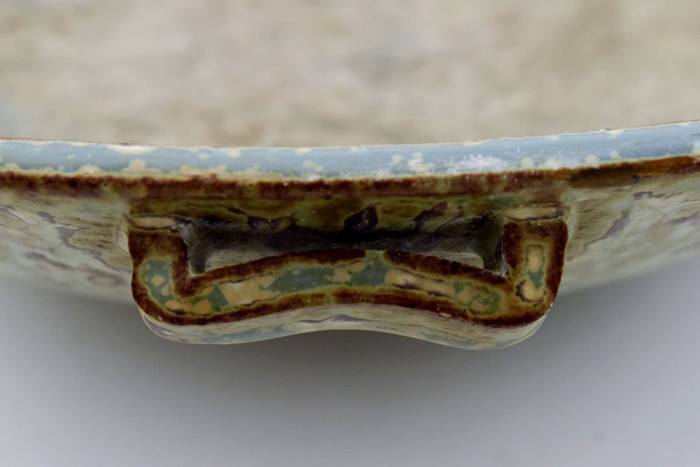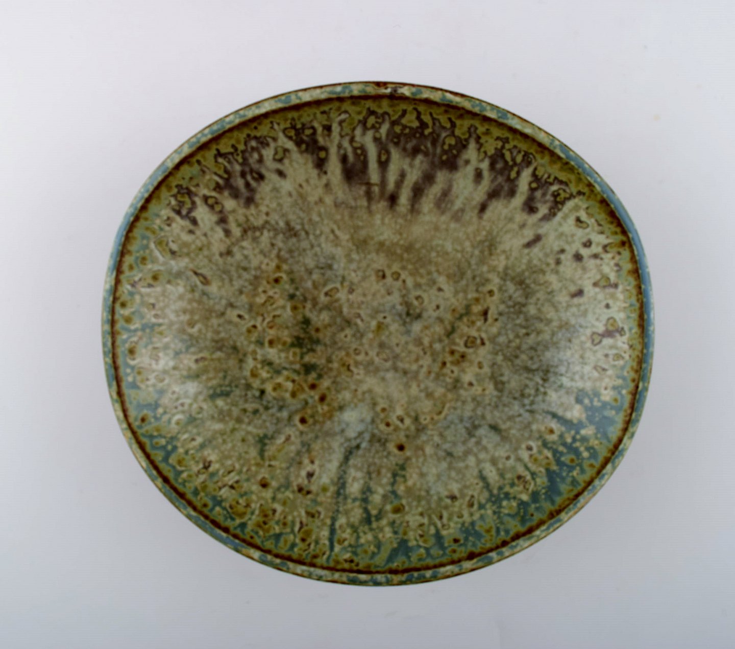 Stor Arne Bang keramikskål. Glasur i blå og grønne nuancer. Stemplet AB. I perfekt stand. Måler: 22 x 7 cm.