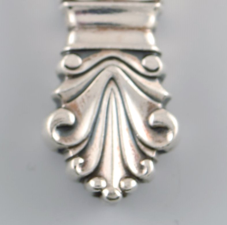 6 Georg Jensen Dronning Sterling Sølv, 6 middagsknive med langt skaft. Måler 22,5 cm. Stemplet. I flot stand.