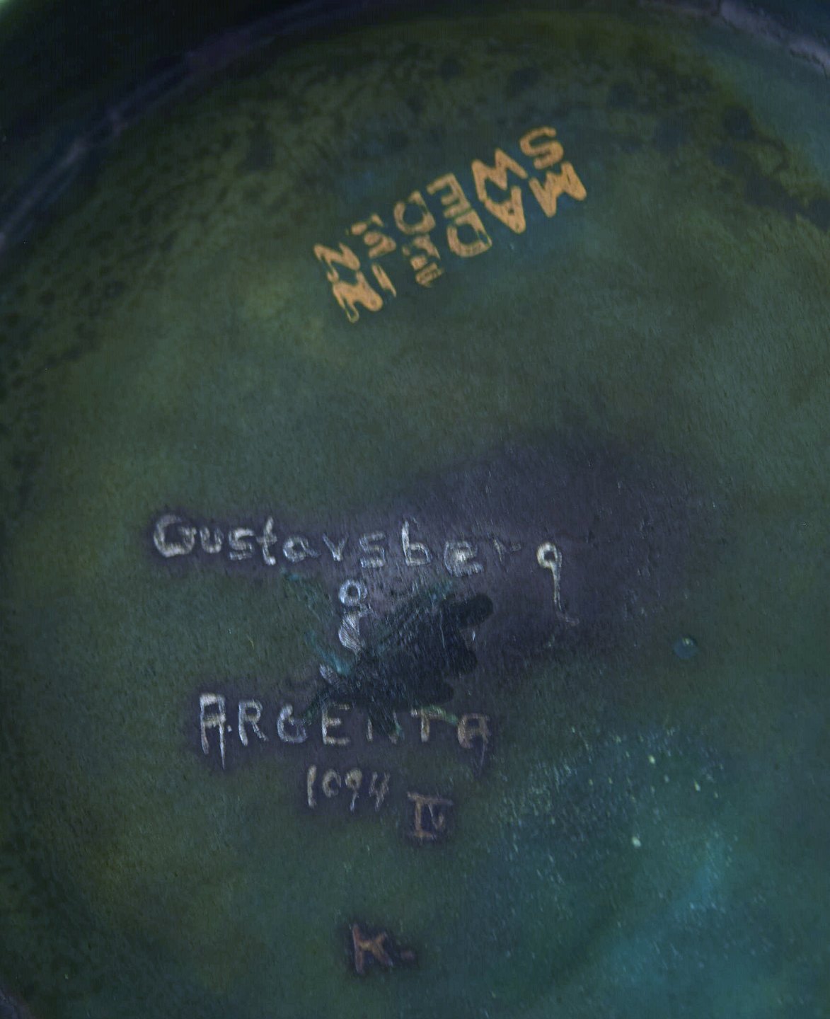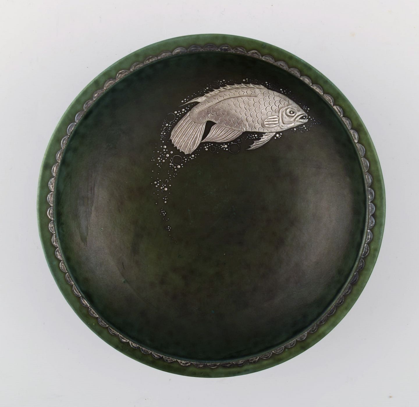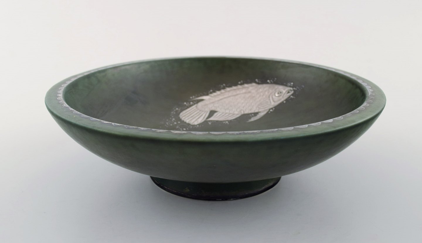 Wilhelm Kåge, Gustavsberg, Argenta Art deco skål dekoreret med fisk. Måler 18 x 5,5 cm. Stemplet Gustavsberg, Argenta. I perfekt stand.