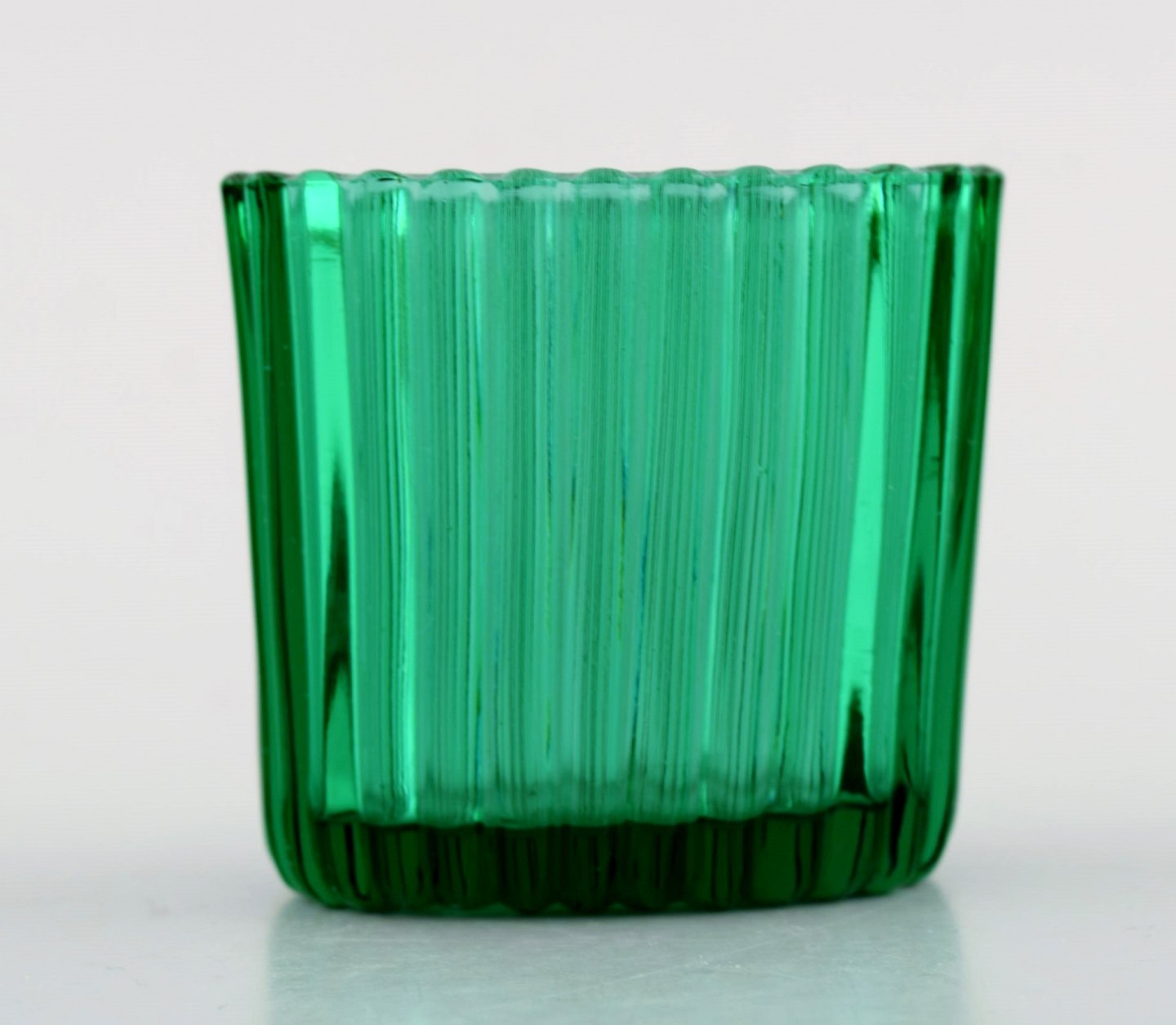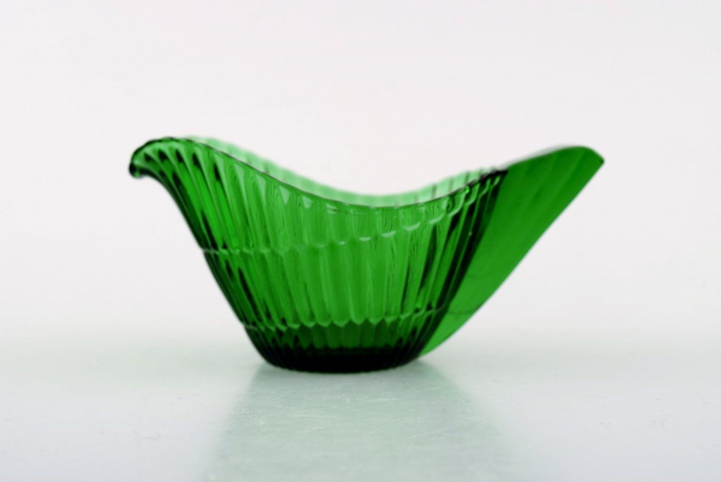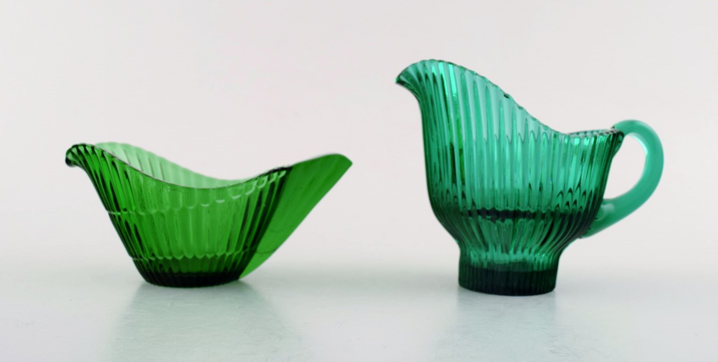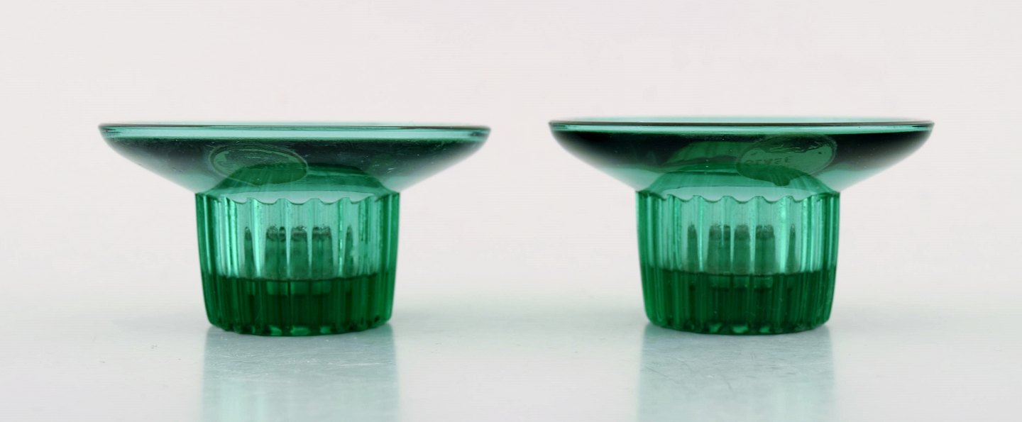 Arthur Percy for Nybro Sweden. Collection of green art glass. 9 pieces, 2 pairs of candle sticks, creamers, etc. In perfect condition. Measures: Large creamer: 11 x 9 cm. Sticker.
