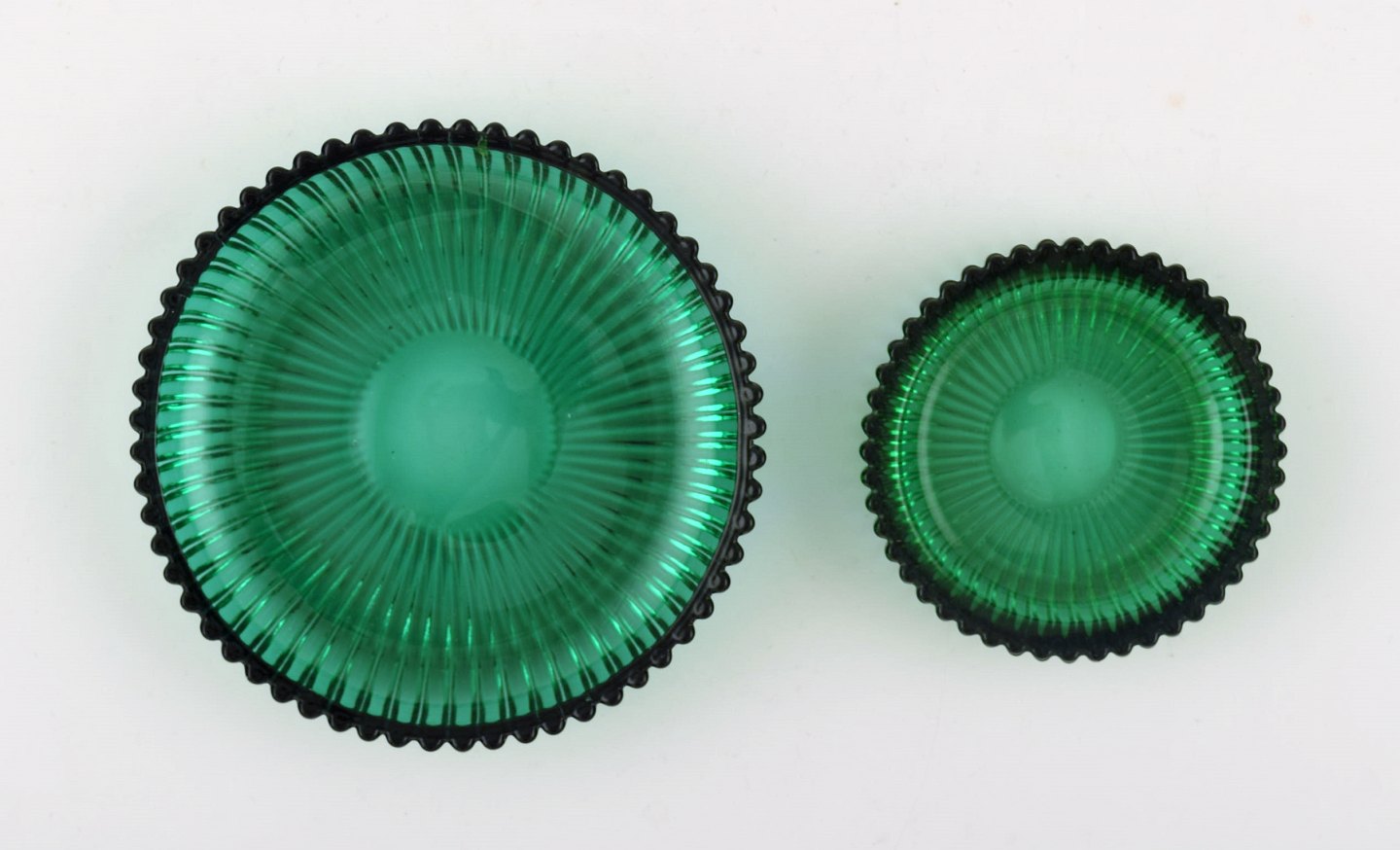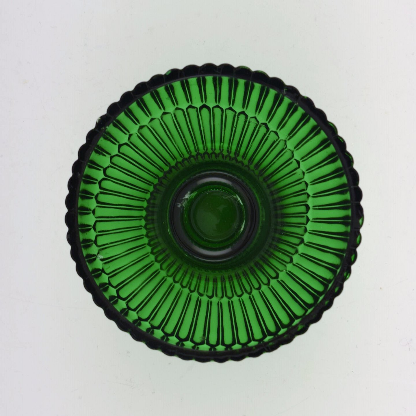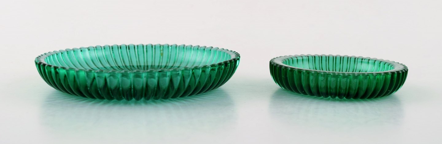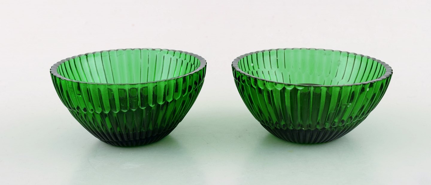 Arthur Percy for Nybro Sweden. Collection of green art glass. 9 pieces, 2 pairs of candle sticks, creamers, etc. In perfect condition. Measures: Large creamer: 11 x 9 cm. Sticker.