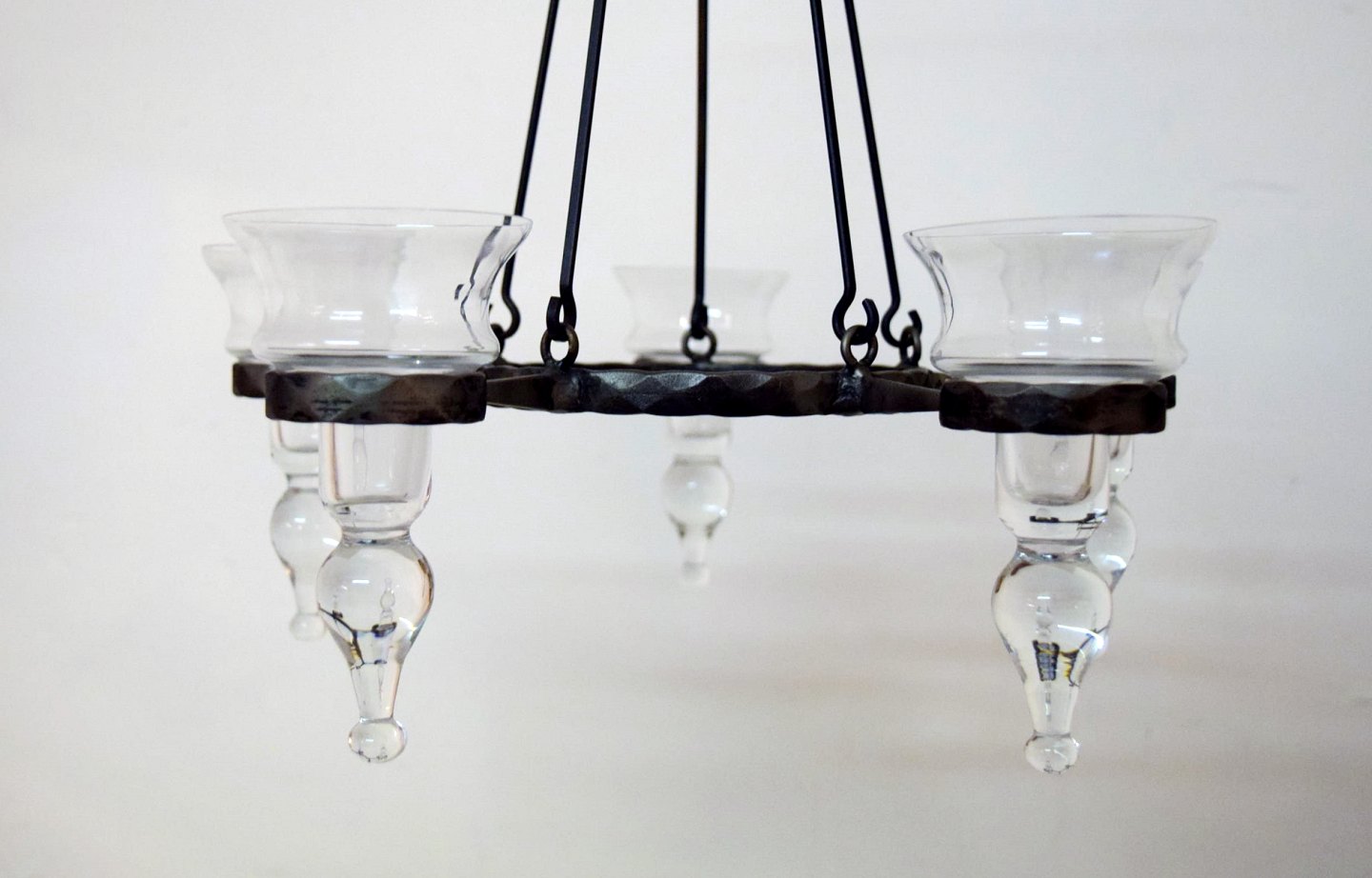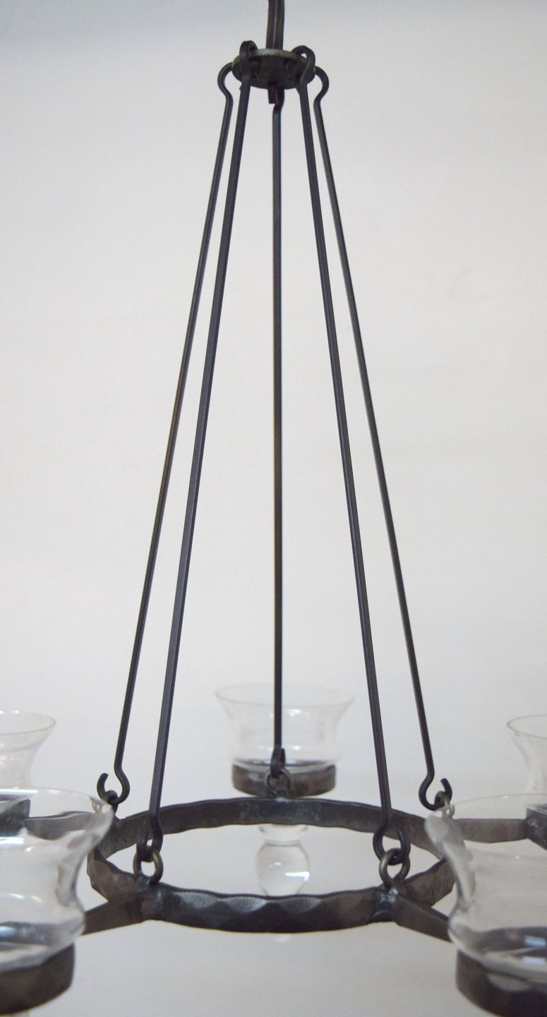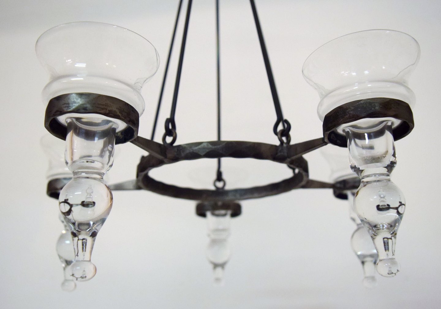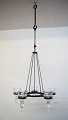 Erik Höglund for Kosta Boda. Sweden 60 / 70 s. 5-armed chandelier in cast iron with mouth-blown art glass. Measures: Diameter: 33 cm. Total height: 131 cm. In perfect condition.