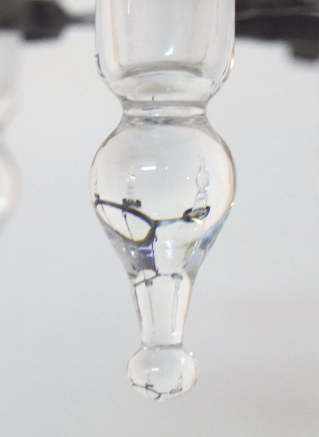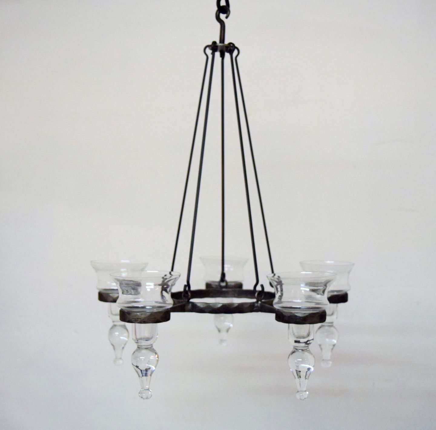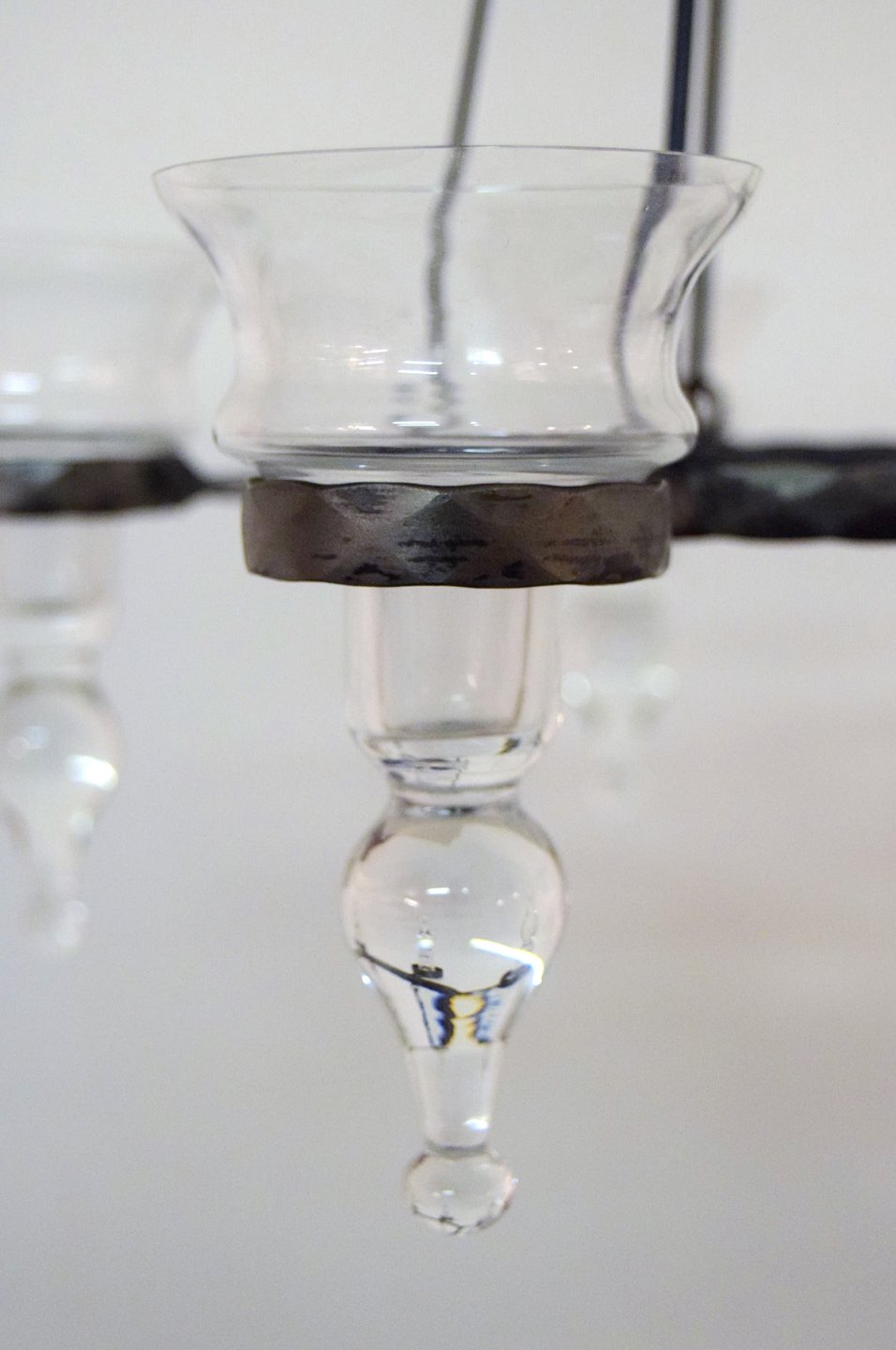 Erik Höglund for Kosta Boda. Sweden 60 / 70 s. 5-armed chandelier in cast iron with mouth-blown art glass. Measures: Diameter: 33 cm. Total height: 131 cm. In perfect condition.
