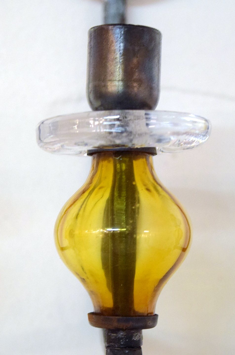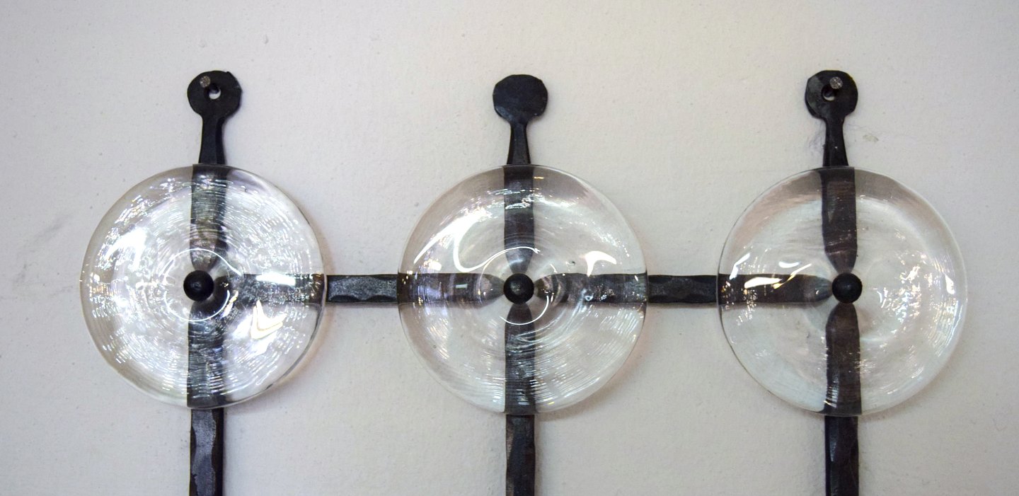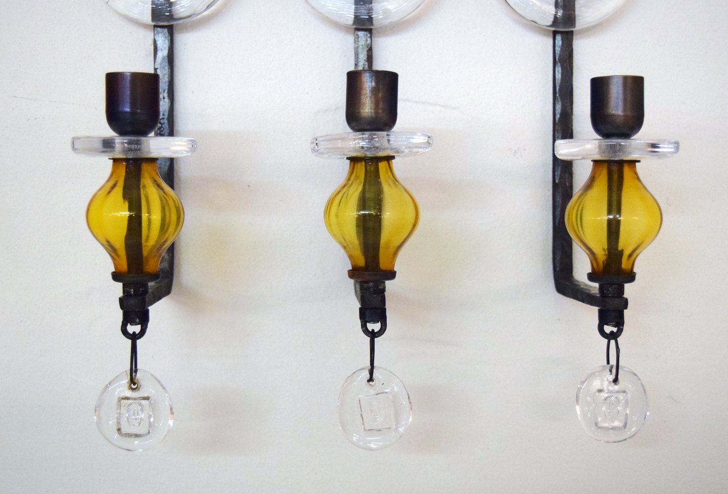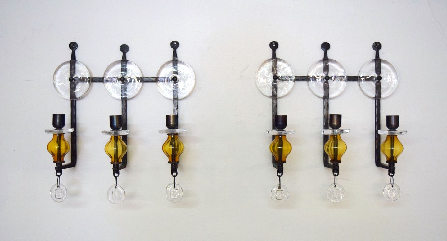 Erik Höglund for Kosta Boda. A pair of 3-armed wall candle holders in cast iron with mouth blown glass. In very good condition. Measures 36 cm x 30 cm.
