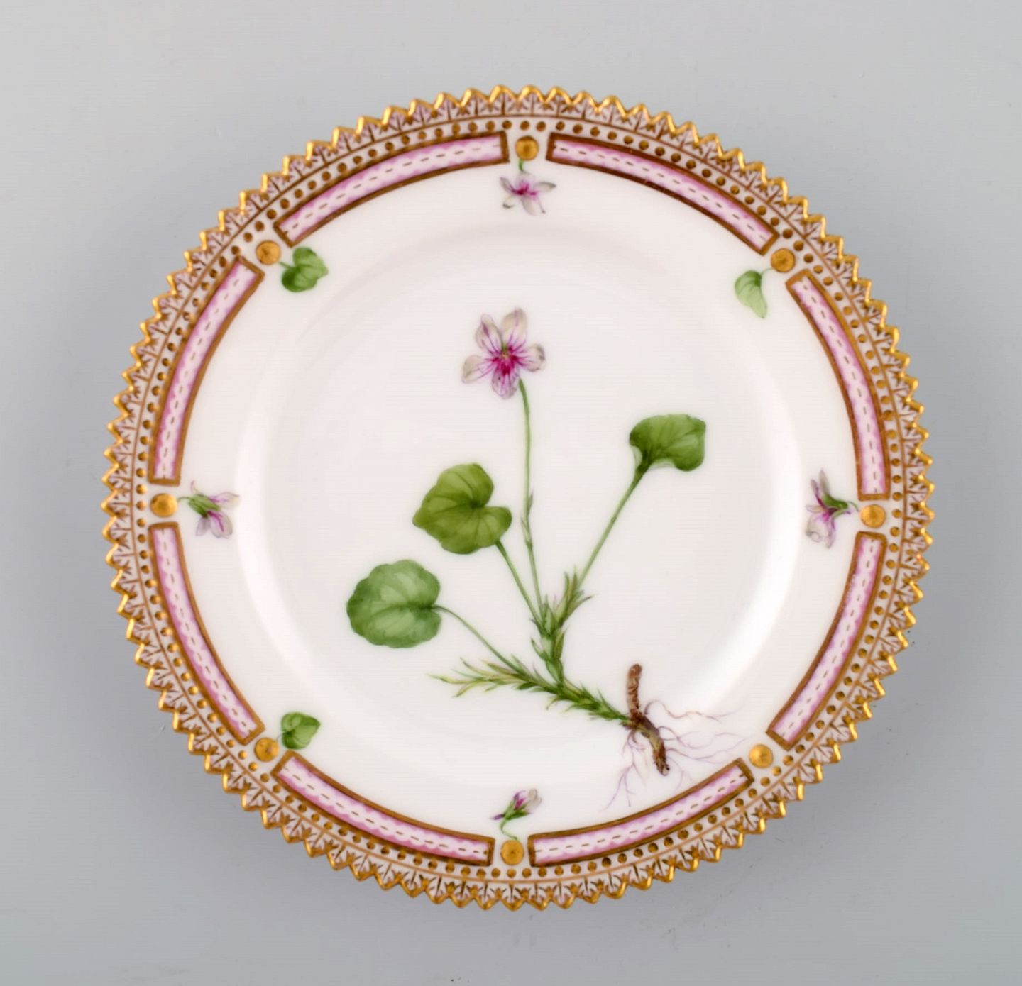 Early Royal Copenhagen. 'Flora Danica' plate, decorated with flowers in color and gold. Late 1800. Diameter 14.2 cm. 1st factory quality. In perfect condition.