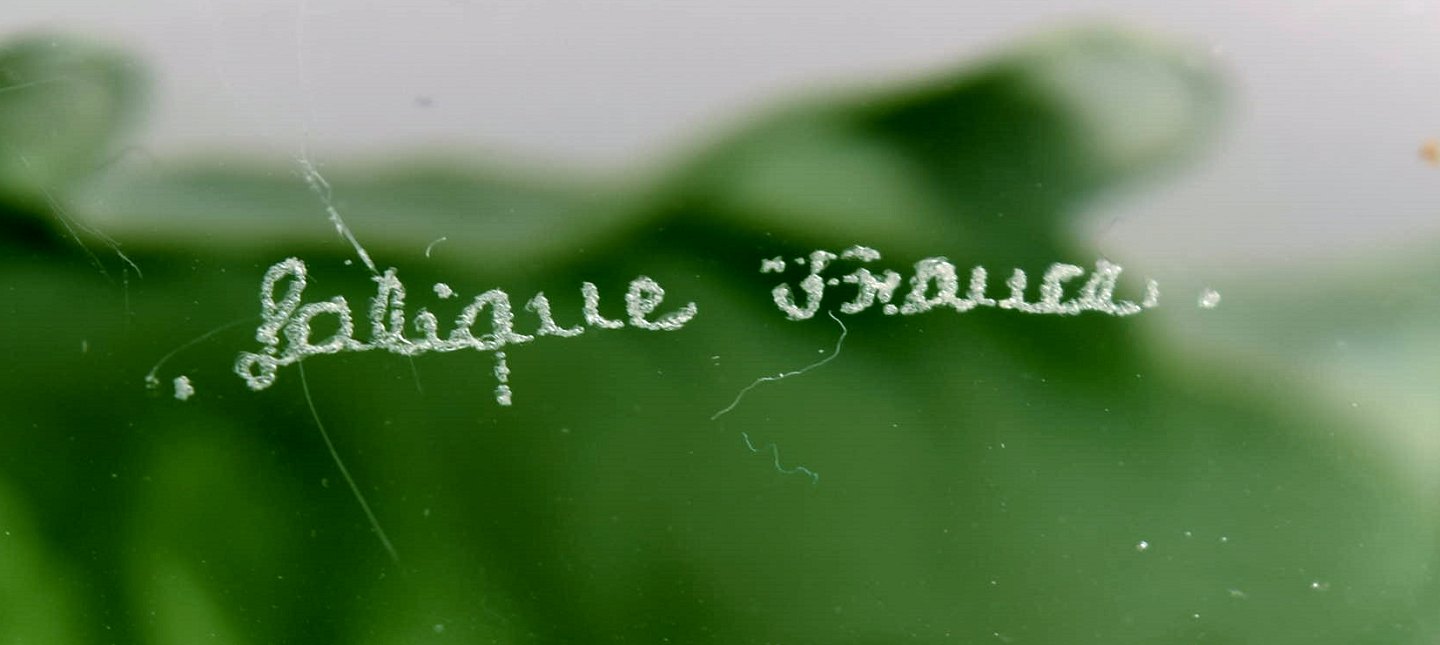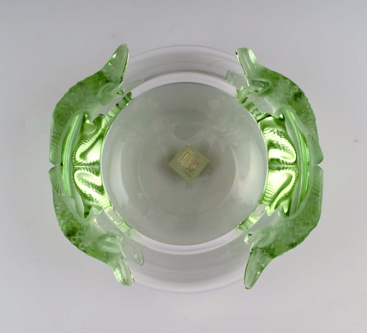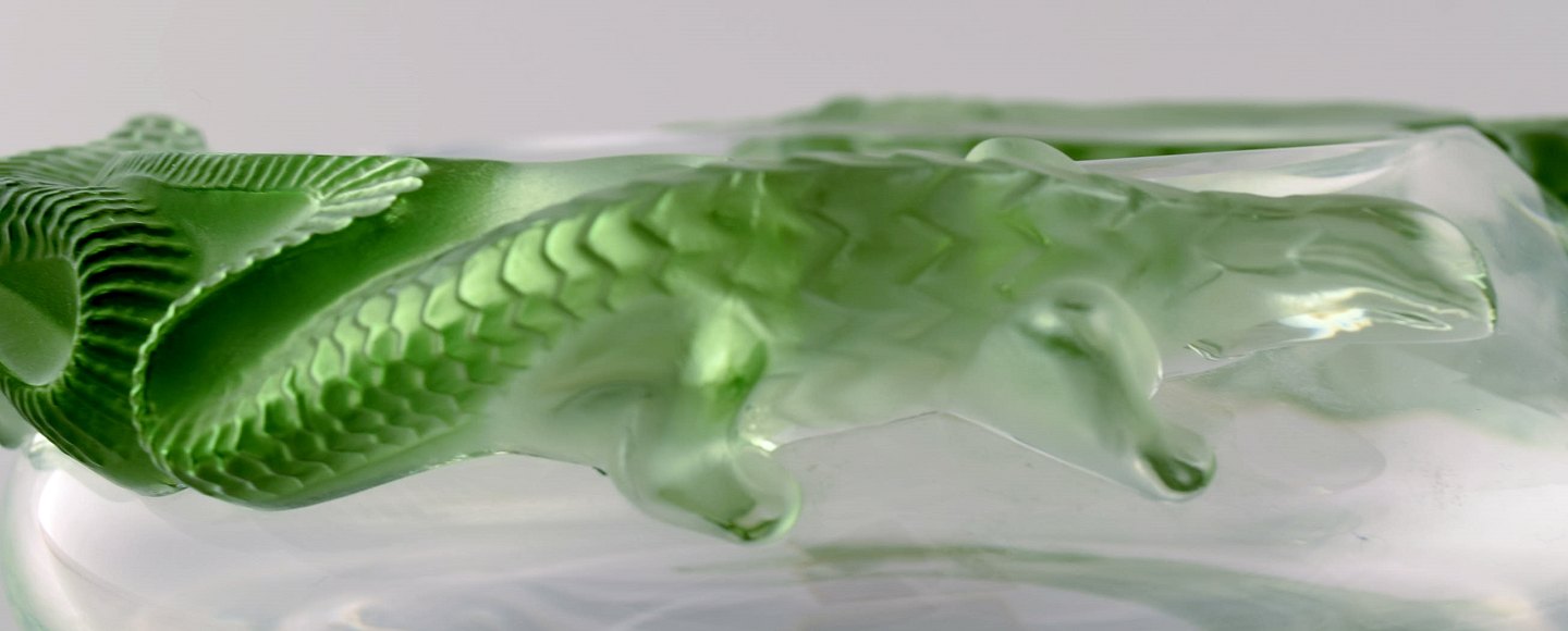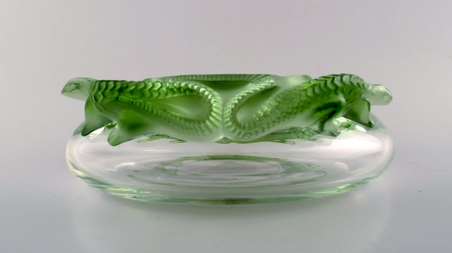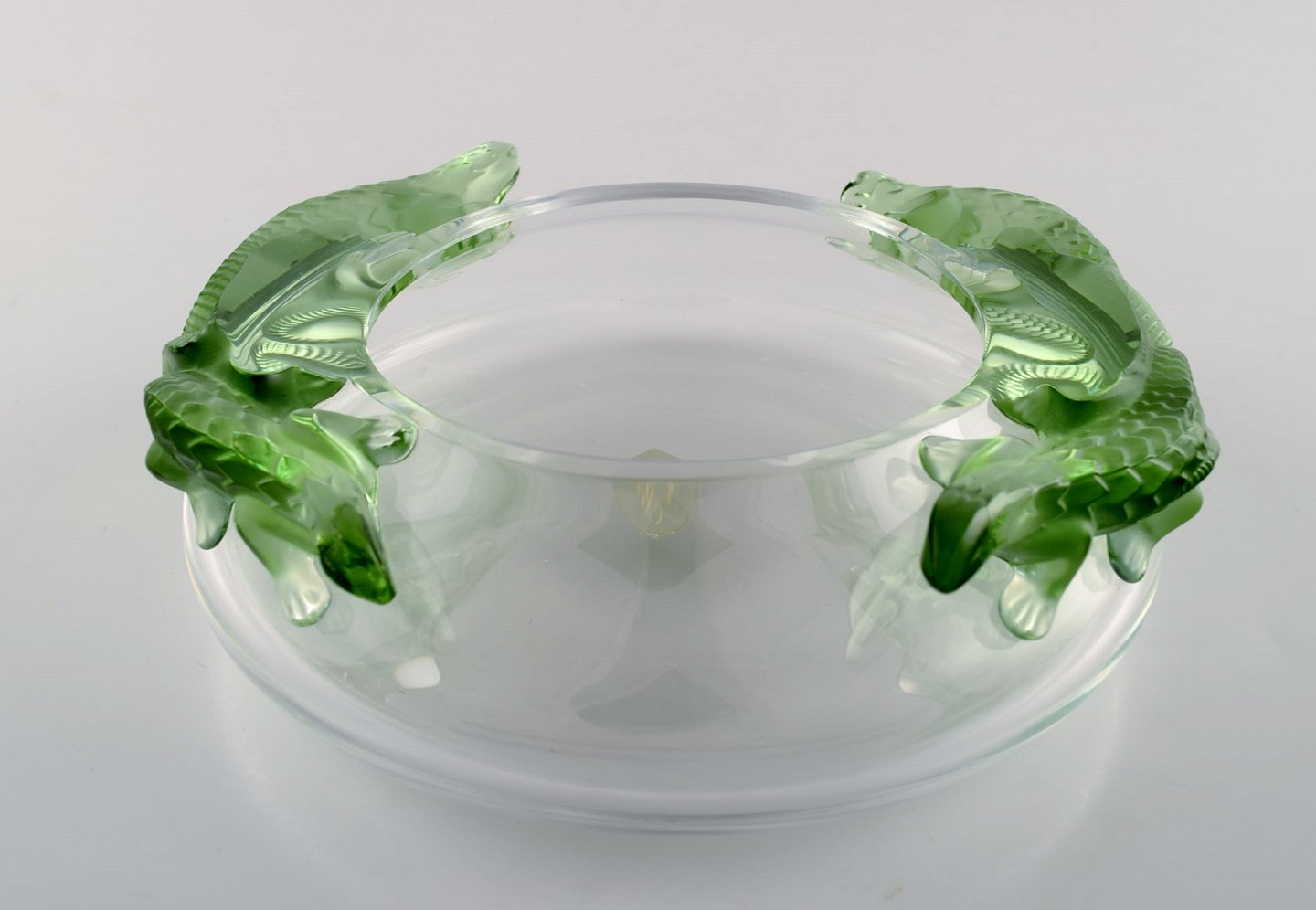 Lalique skål af klart glas dekoreret med grønne Salamandere 'Bamako'.