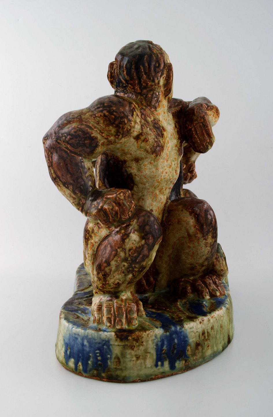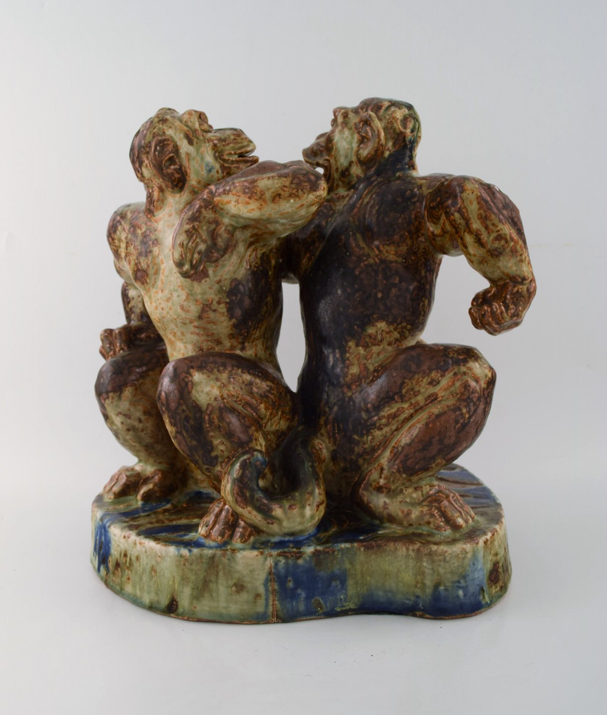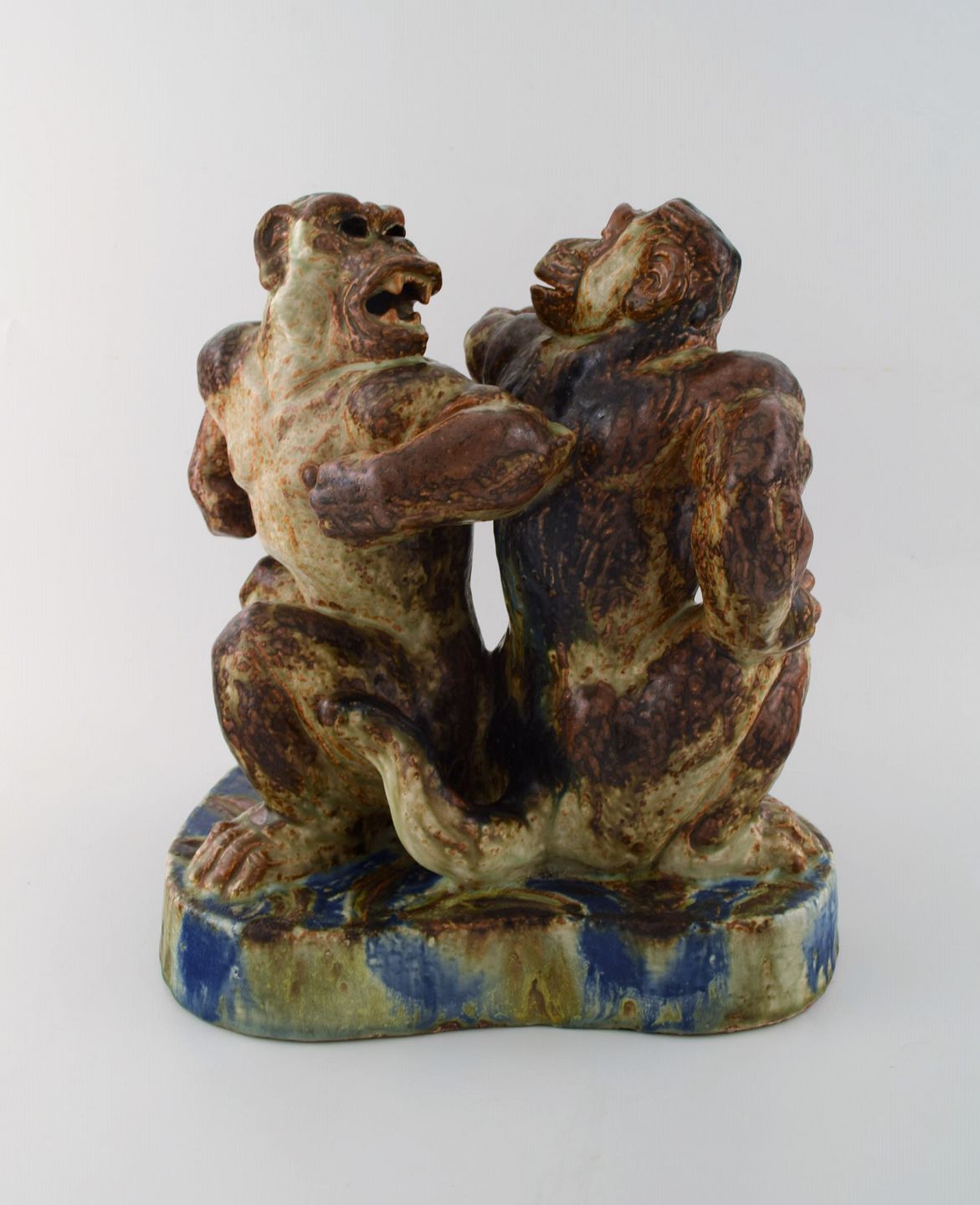 Knud Kyhn 1880-1969 for Royal Copehagen. Meget stor og sjælden figur af stentøj i form af to hanaber, dekoreret med sungglasur med blå strejf.