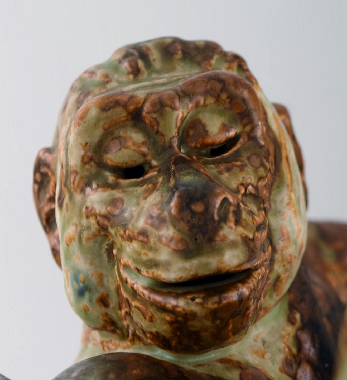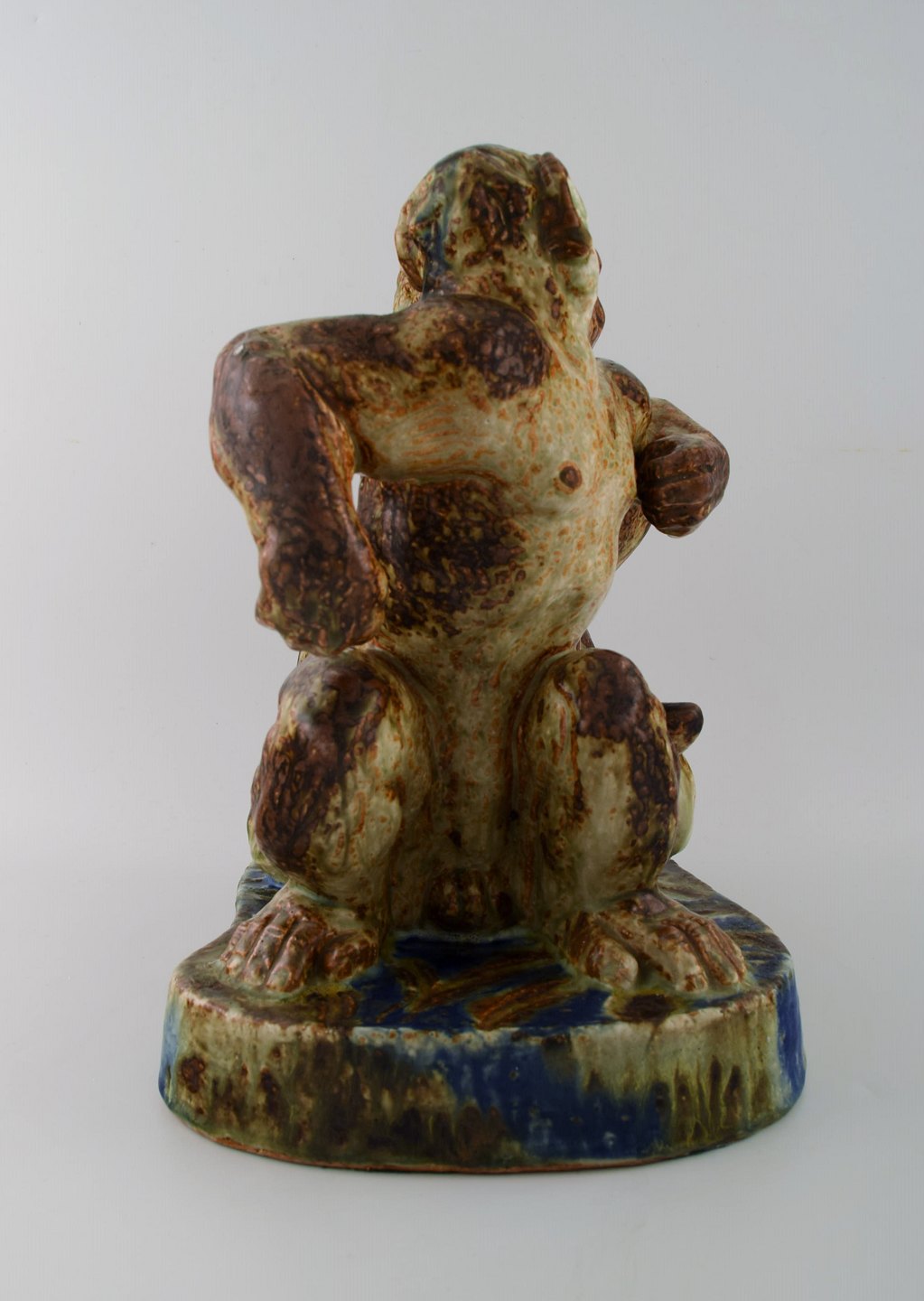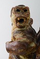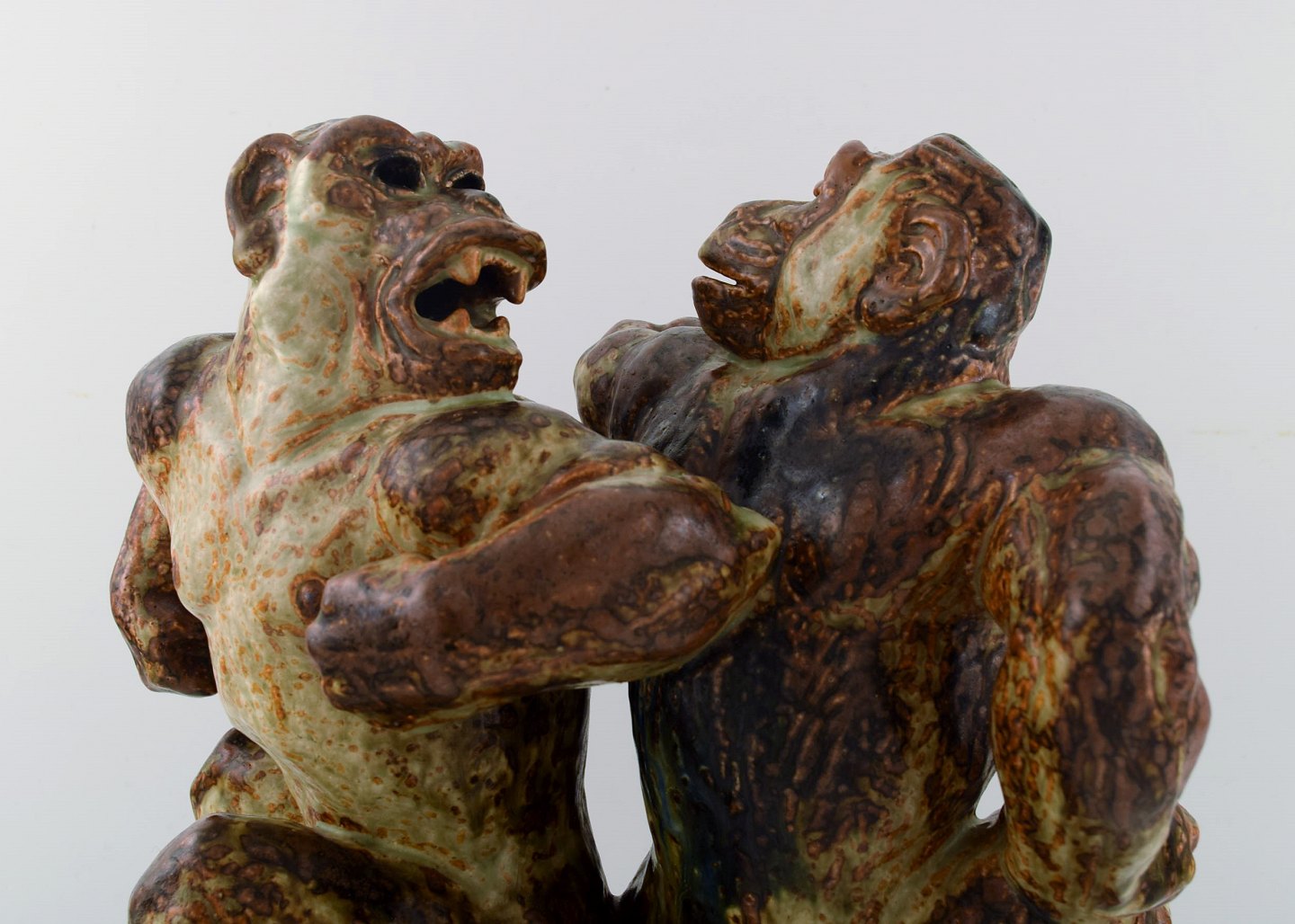 Knud Kyhn 1880-1969 for Royal Copehagen. Meget stor og sjælden figur af stentøj i form af to hanaber, dekoreret med sungglasur med blå strejf.