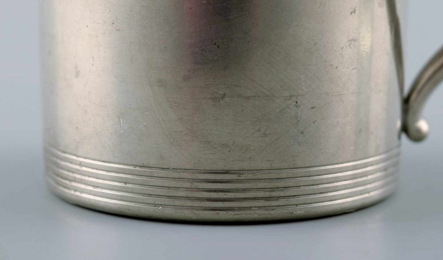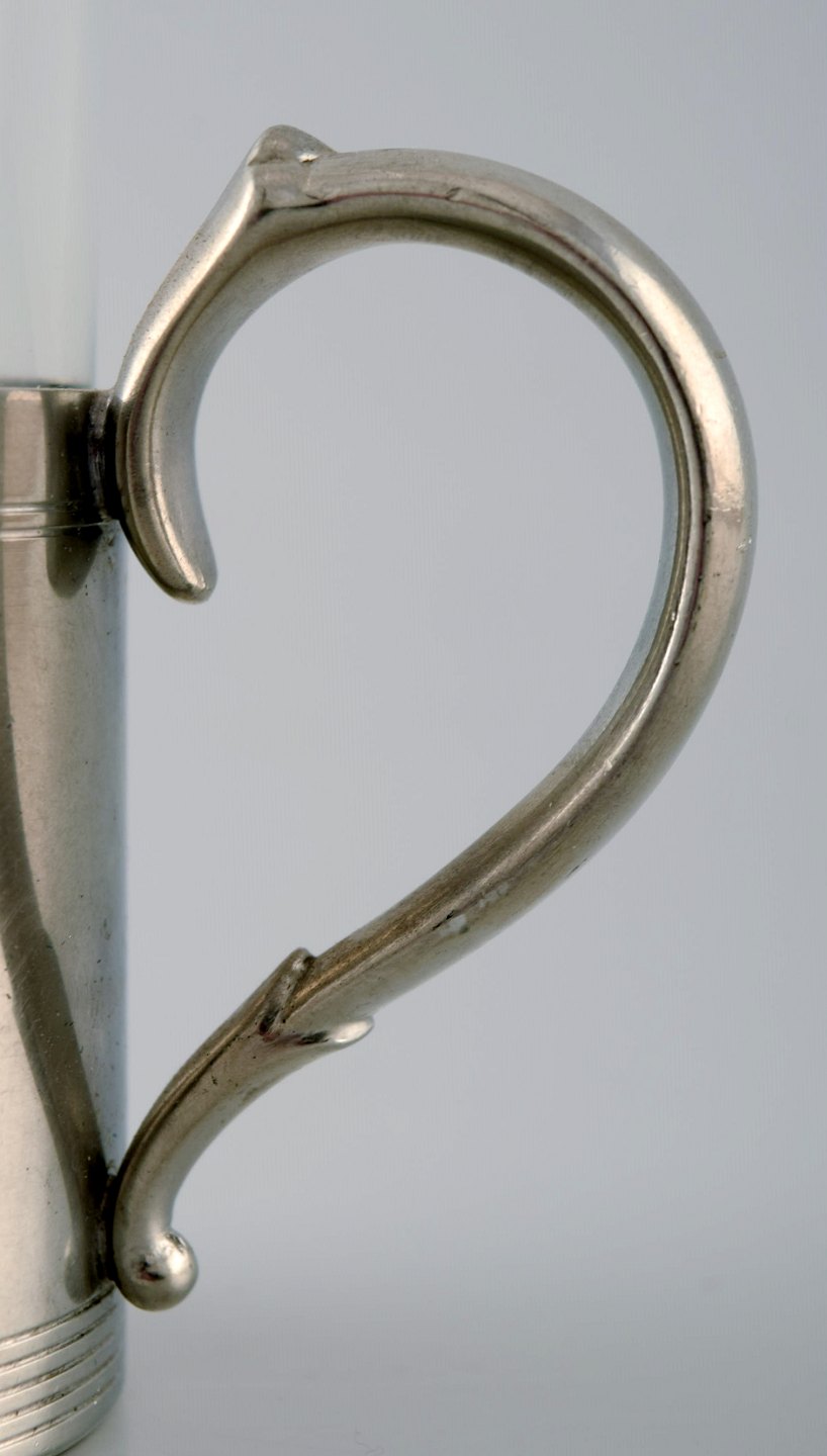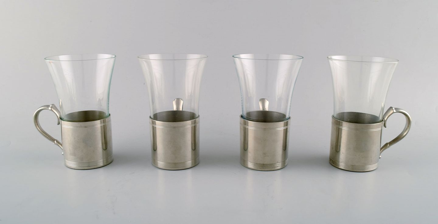 4 pcs of Just Andersen Art Deco pewter mugs with loose glass. Hunting set. Liquor set. Irish Coffee. Denmark 1940 s. Stamped. In very good condition. Measures: 13 cm x 10 cm.