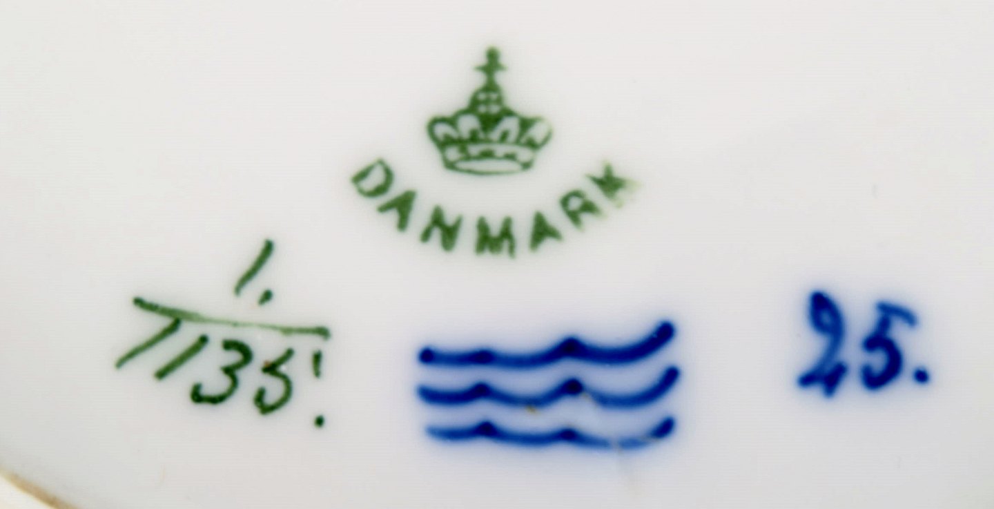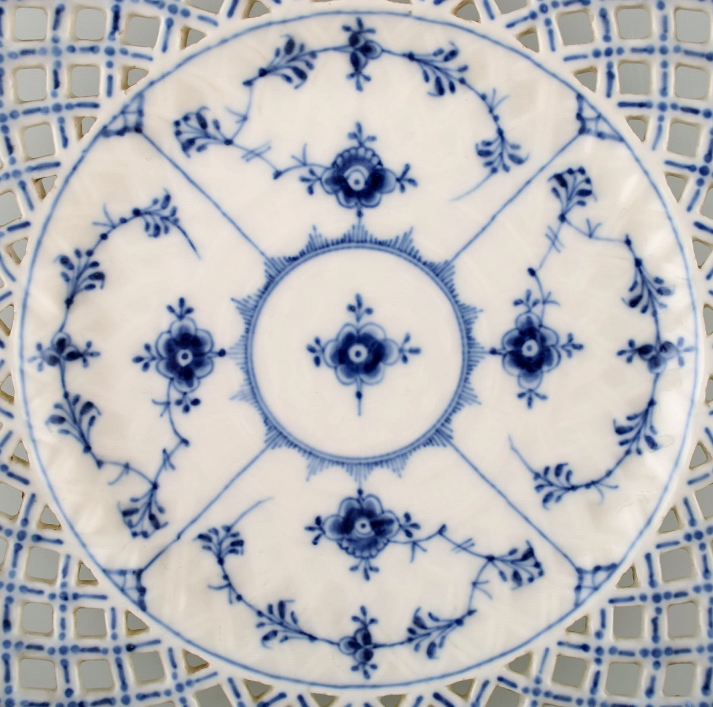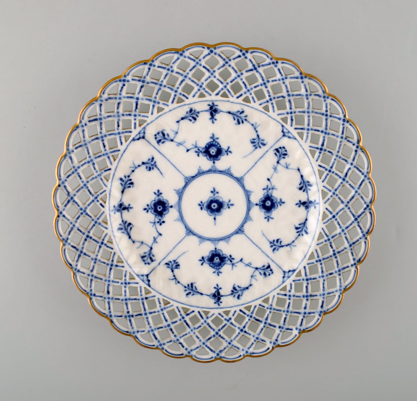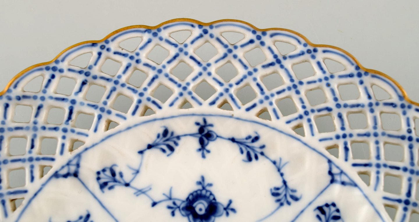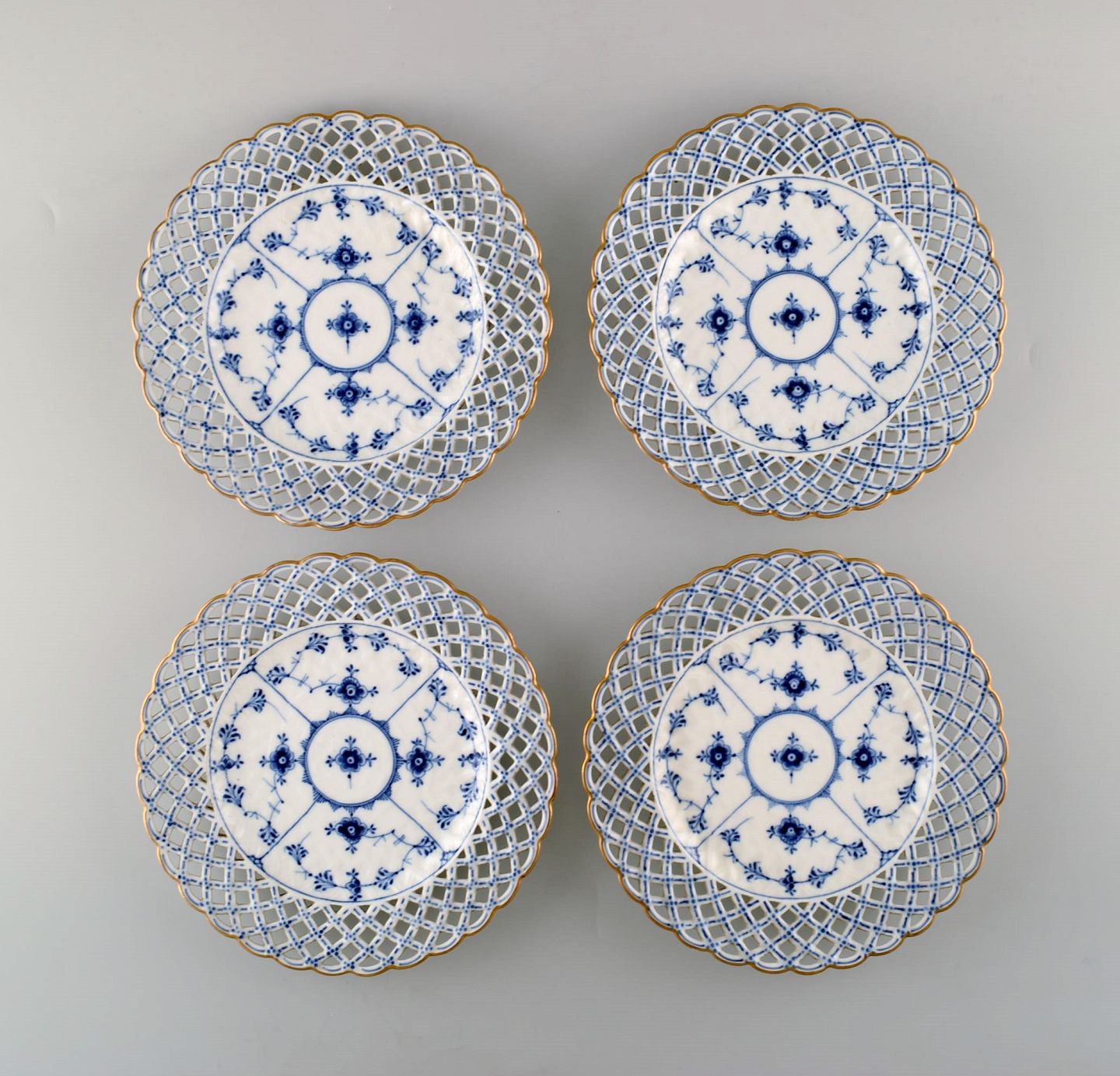 A set of 4 antique Royal Copenhagen Blue Fluted full lace plates with gold rim.