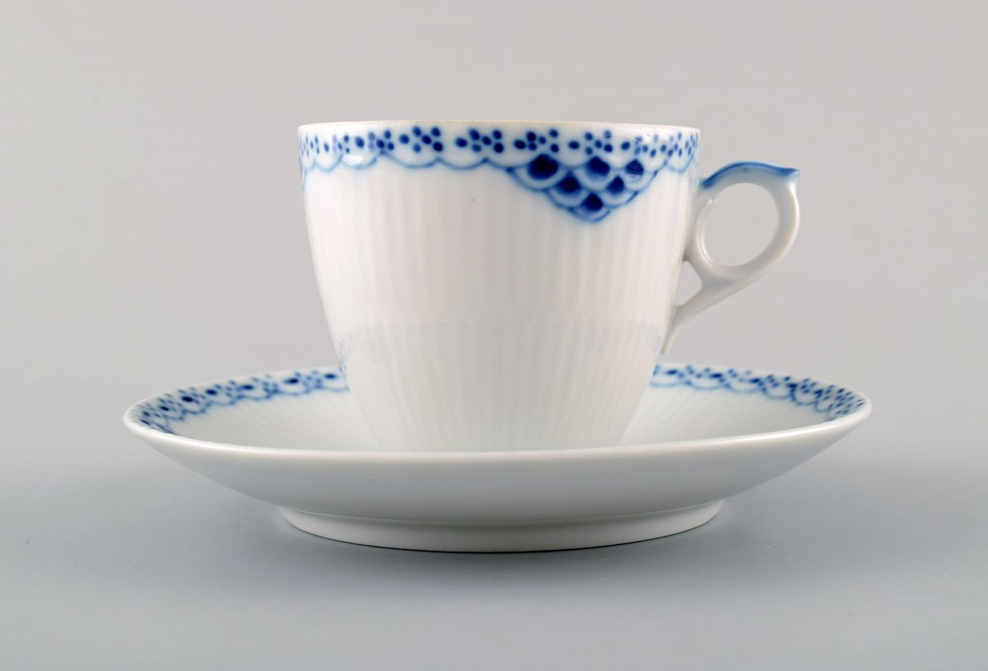 Royal Copenhagen "Prinsesse" kaffekop med underkop. 10 sæt. Modelnummer 073 og 069. 3. sortering. I perfekt stand. Kop måler: 7 cm x 6,5 cm. Underkop måler: 13 cm. 10 sæt haves.