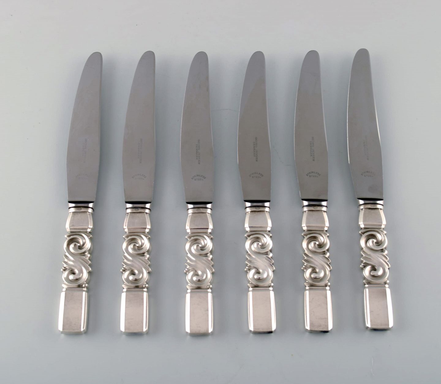 Georg Jensen. Cutlery, Scroll no. 22, hammered Sterling Silver consisting of: 6 dinner knives. In perfect condition. Stamped. Measures: 23 cm.