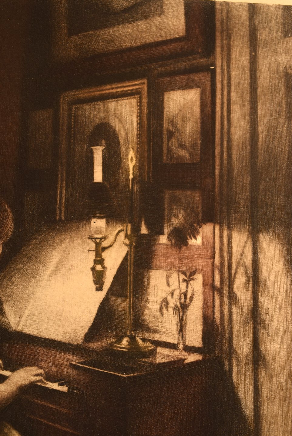 Peter Ilsted: Interiør med to piger ved klaveret. Signeret Peter Ilsted. Farvemezzotinte. Pladestørrelse 23,5 cm. x 21,5 cm. I god stand.