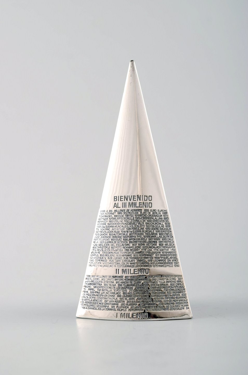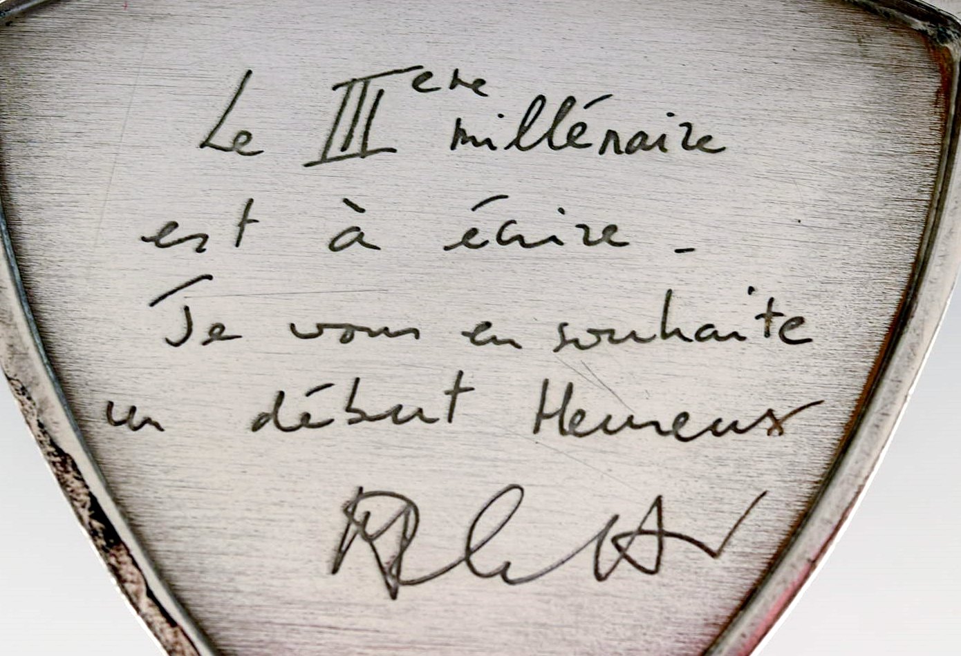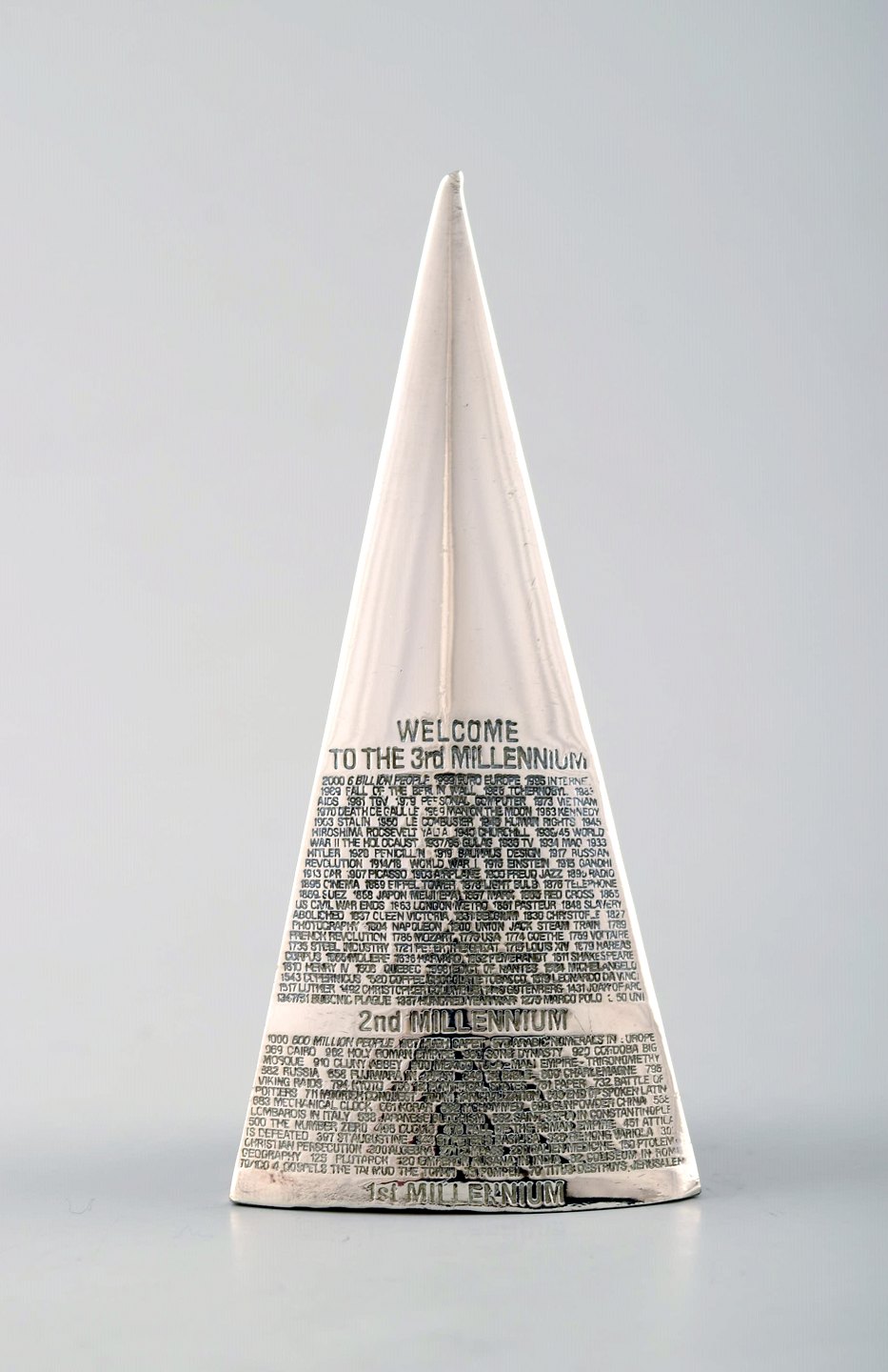 Rare Claude Picasso for Christofle. "Welcome to the 3rd Millennium". Cone-shaped sculpture / paper weight in silver plated bronze.
