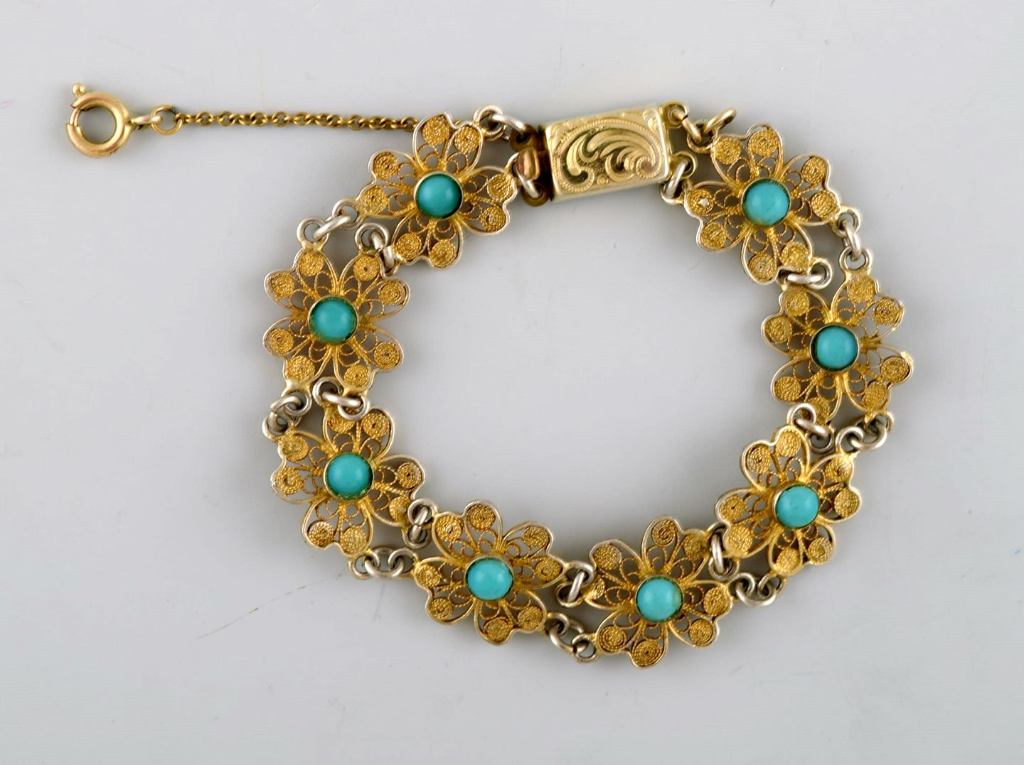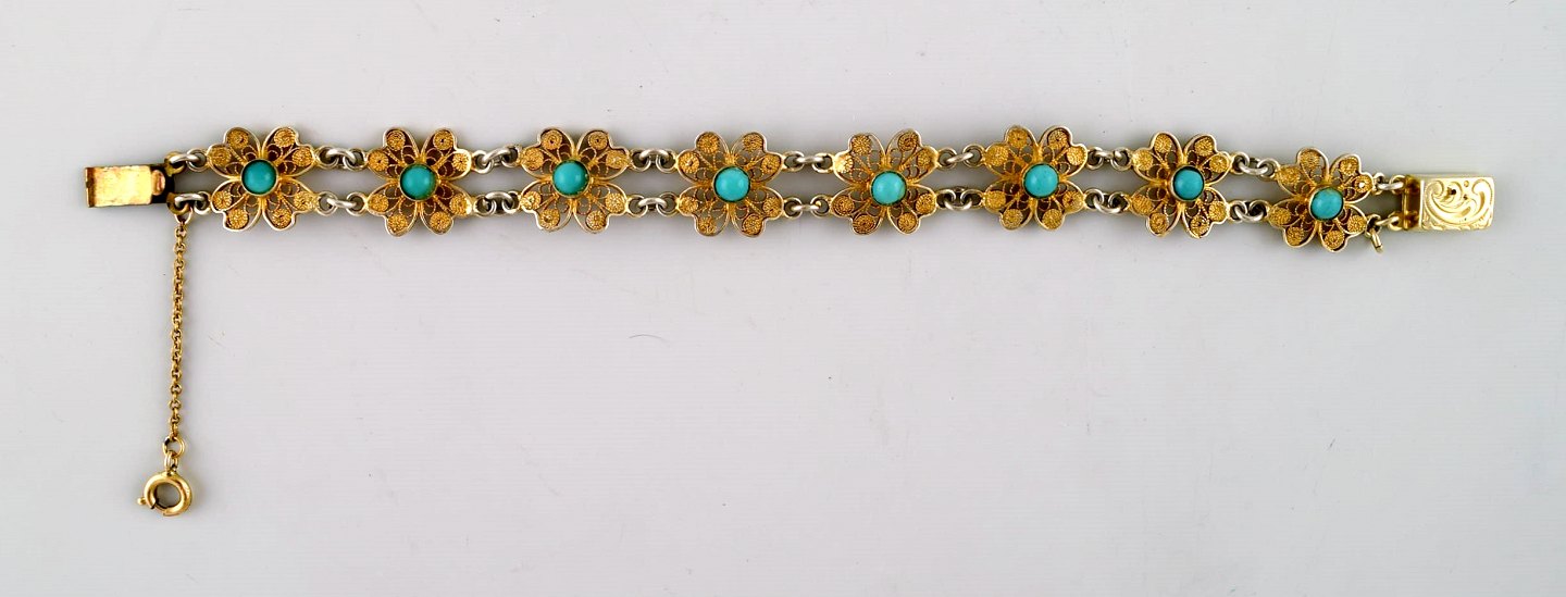 Armbånd i sterlingsølv, delvist forgyldt, turkise sten. Klassisk armbånd, ca. 1960. I flot stand Total længde: 17,5 cm. Bredde: 1,5 cm. Stemplet.
