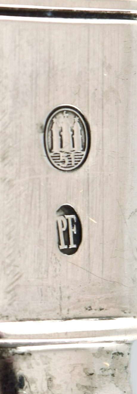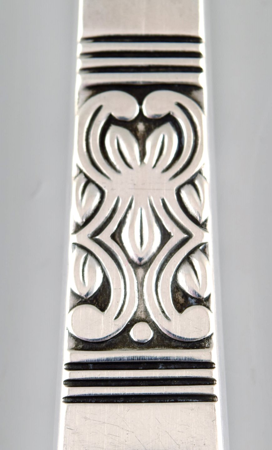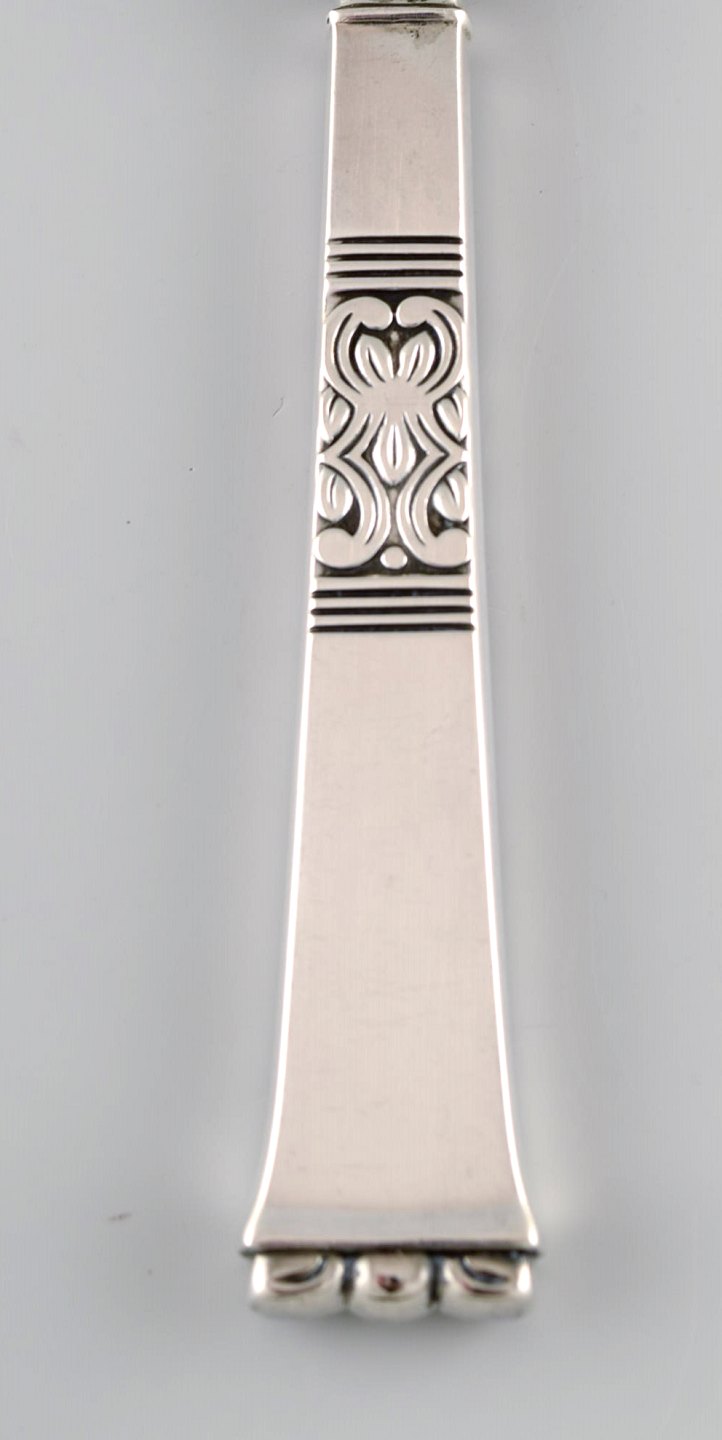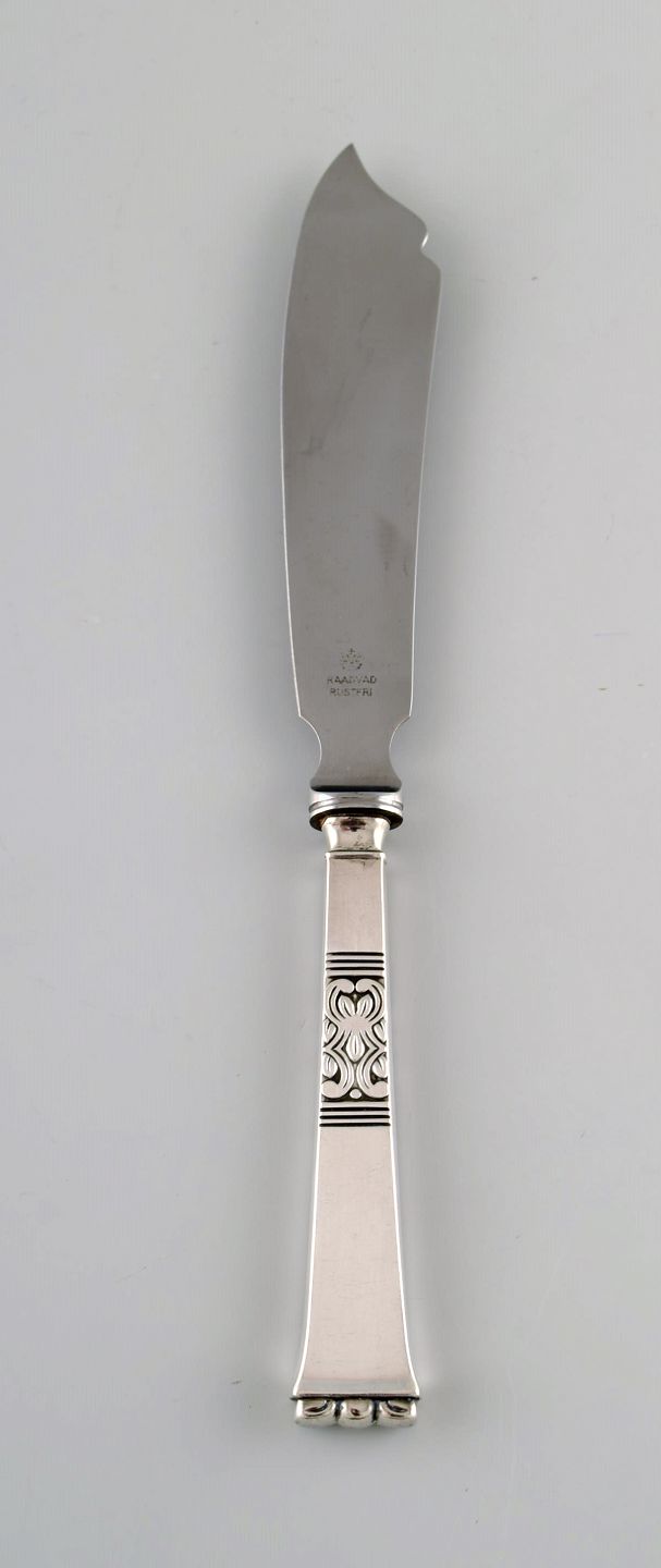 Poul Frigast, dansk sølvsmed. Rigsmønstret lagkagekniv i tretårnet sølv. 1951. I flot stand. Måler: 28 cm. Stemplet og dateret: PF, samt tre tårne.