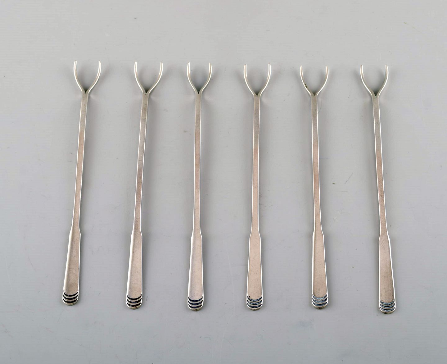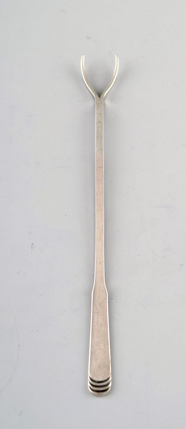 Hans Hansen sølvtøj Arvesølv nr. 15. Sæt på 6 cocktailspyd / nøddespyd i tretårnet sølv. 1930/40'erne Måler : 11,5 cm. I flot stand stand. Stemplet.