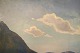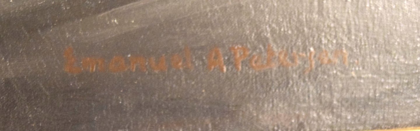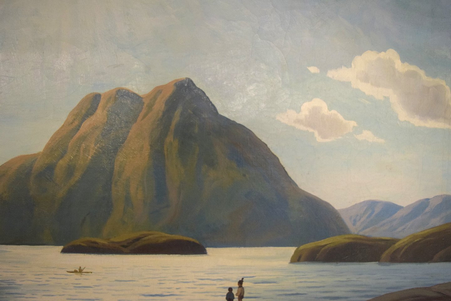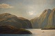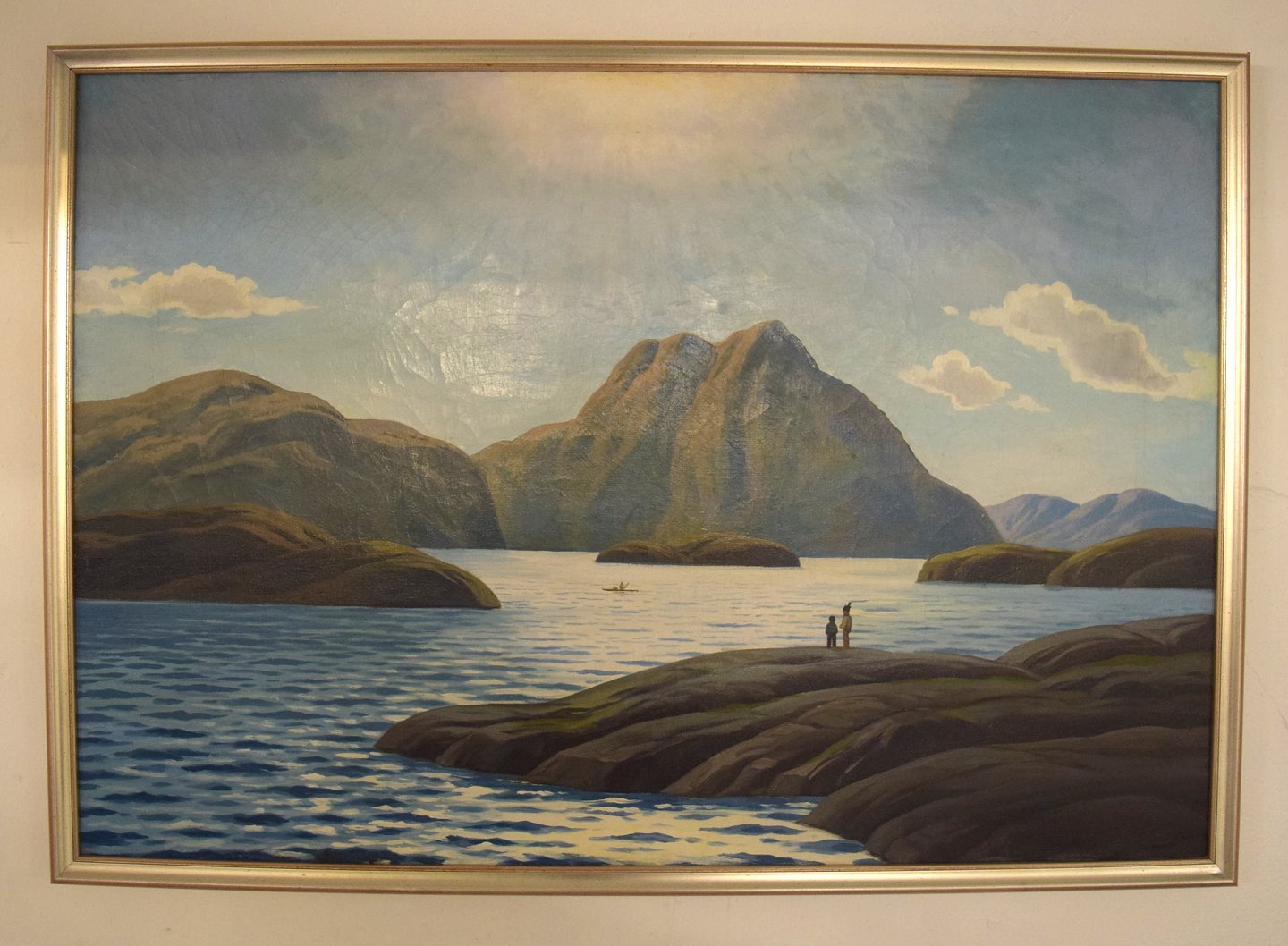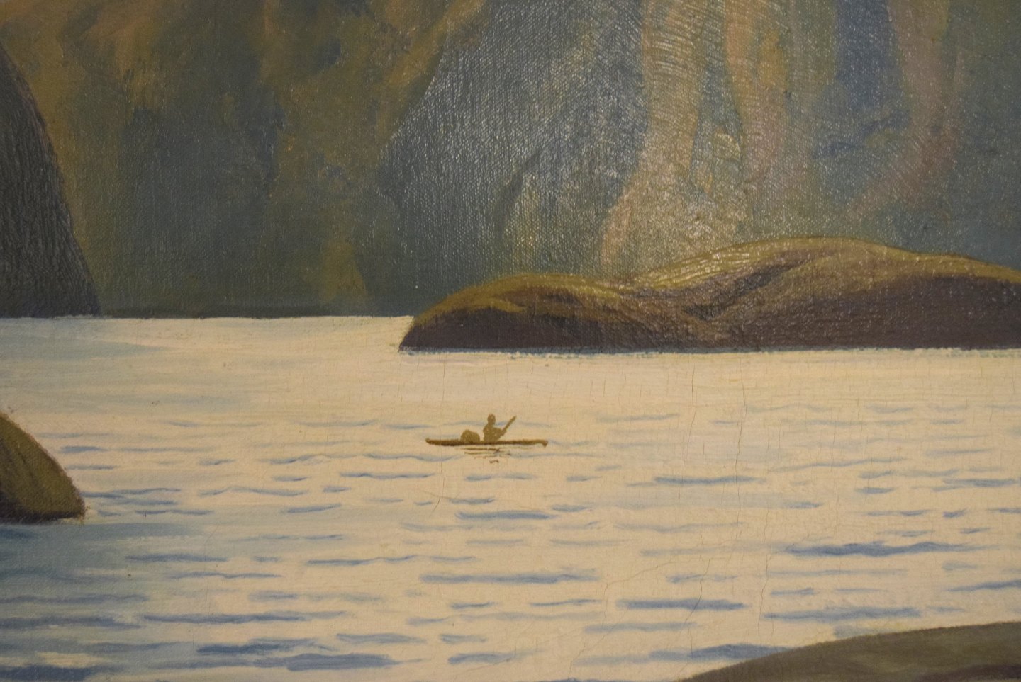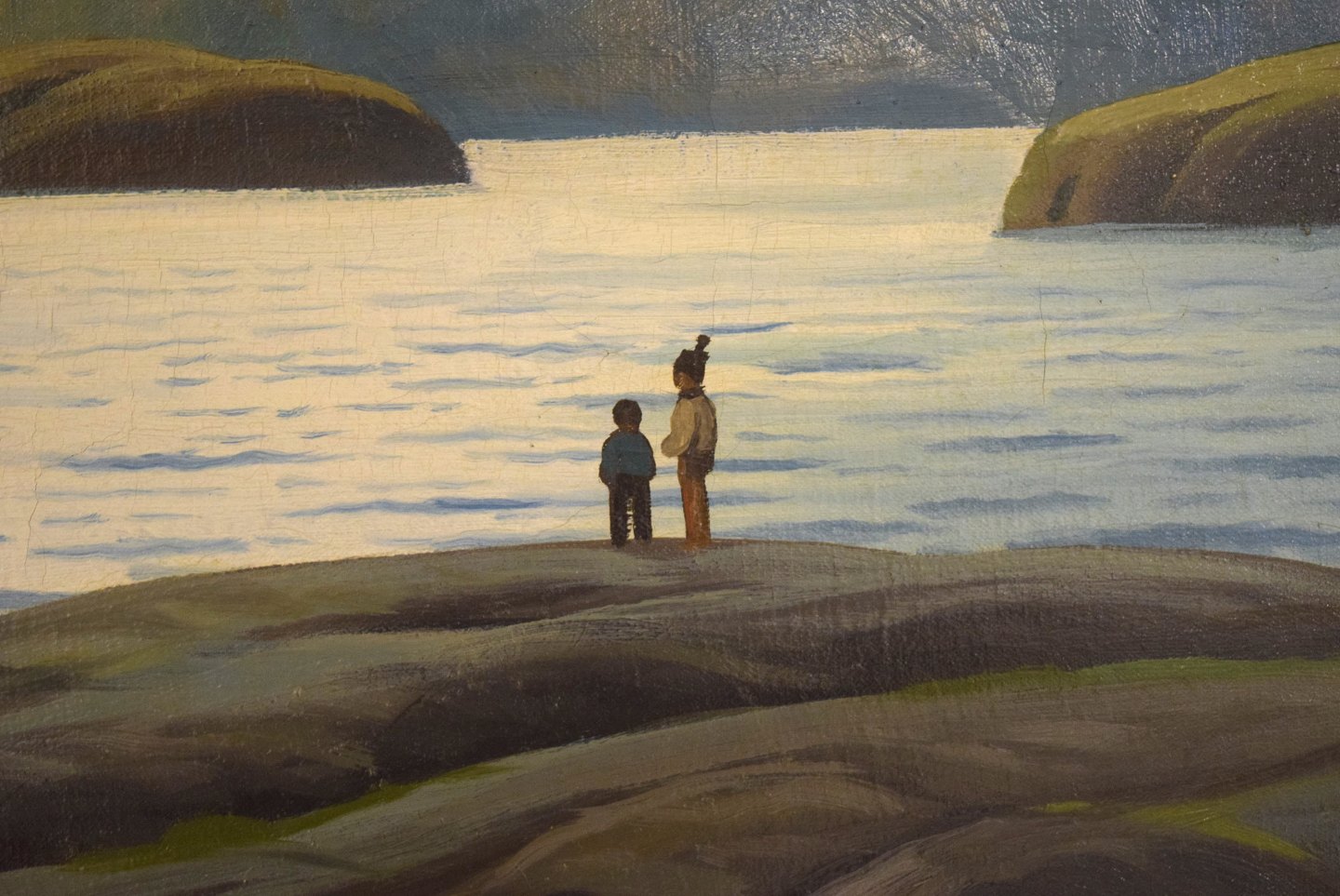 Emanuel A. Petersen (f. 1894, d. 1948). Upernavik, Grønland. Olie på lærred. Solnedgang over bugten.