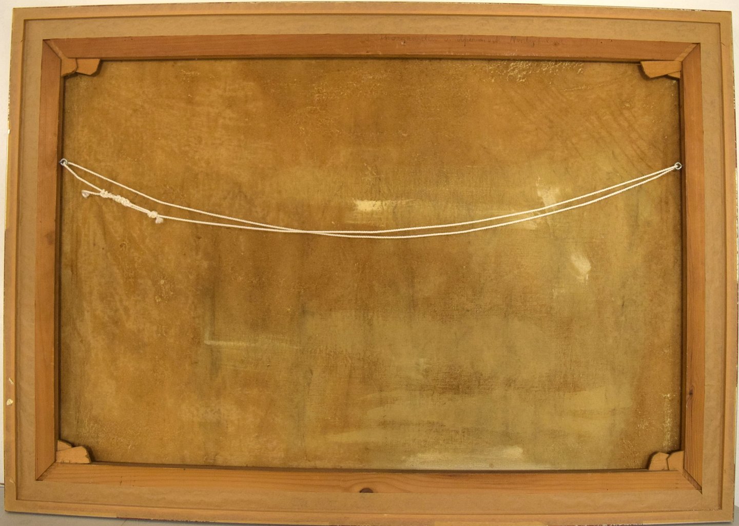 Lærredet måler: 100 cm x 69 cm. Rammen måler: 3 cm.