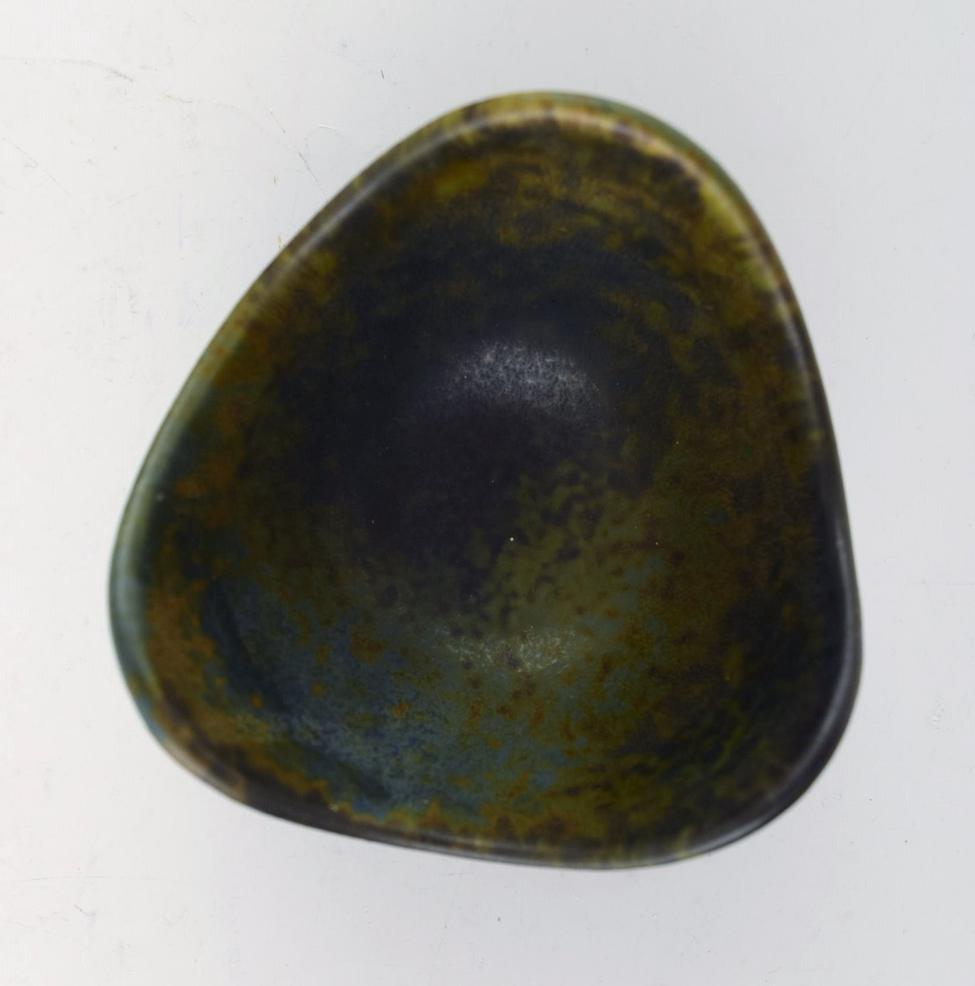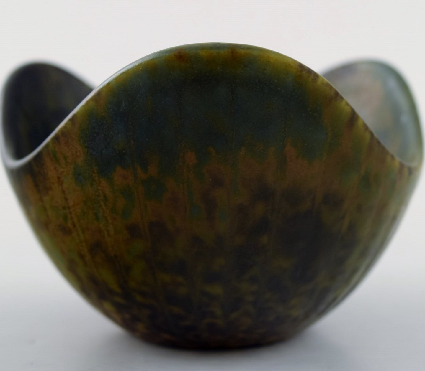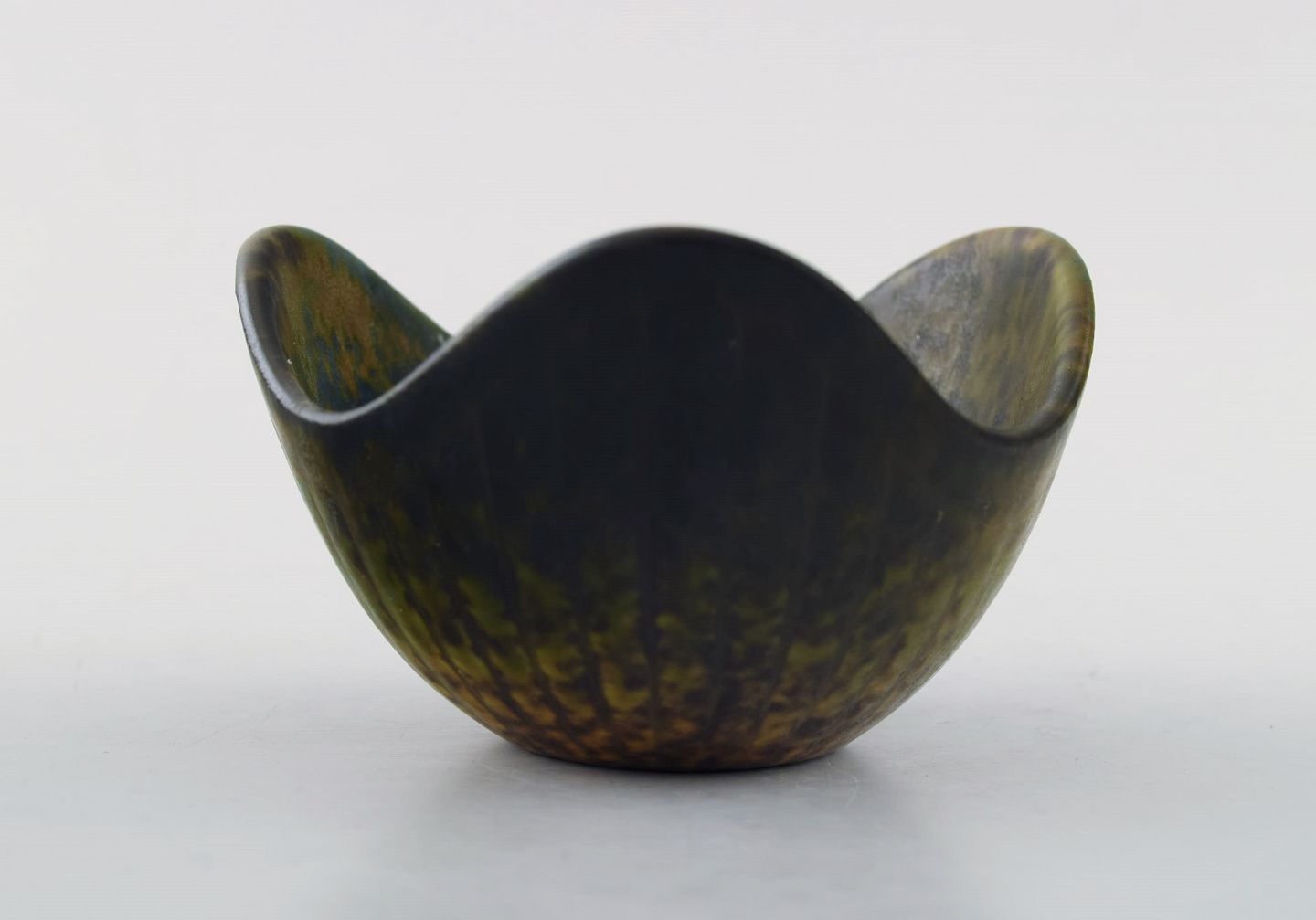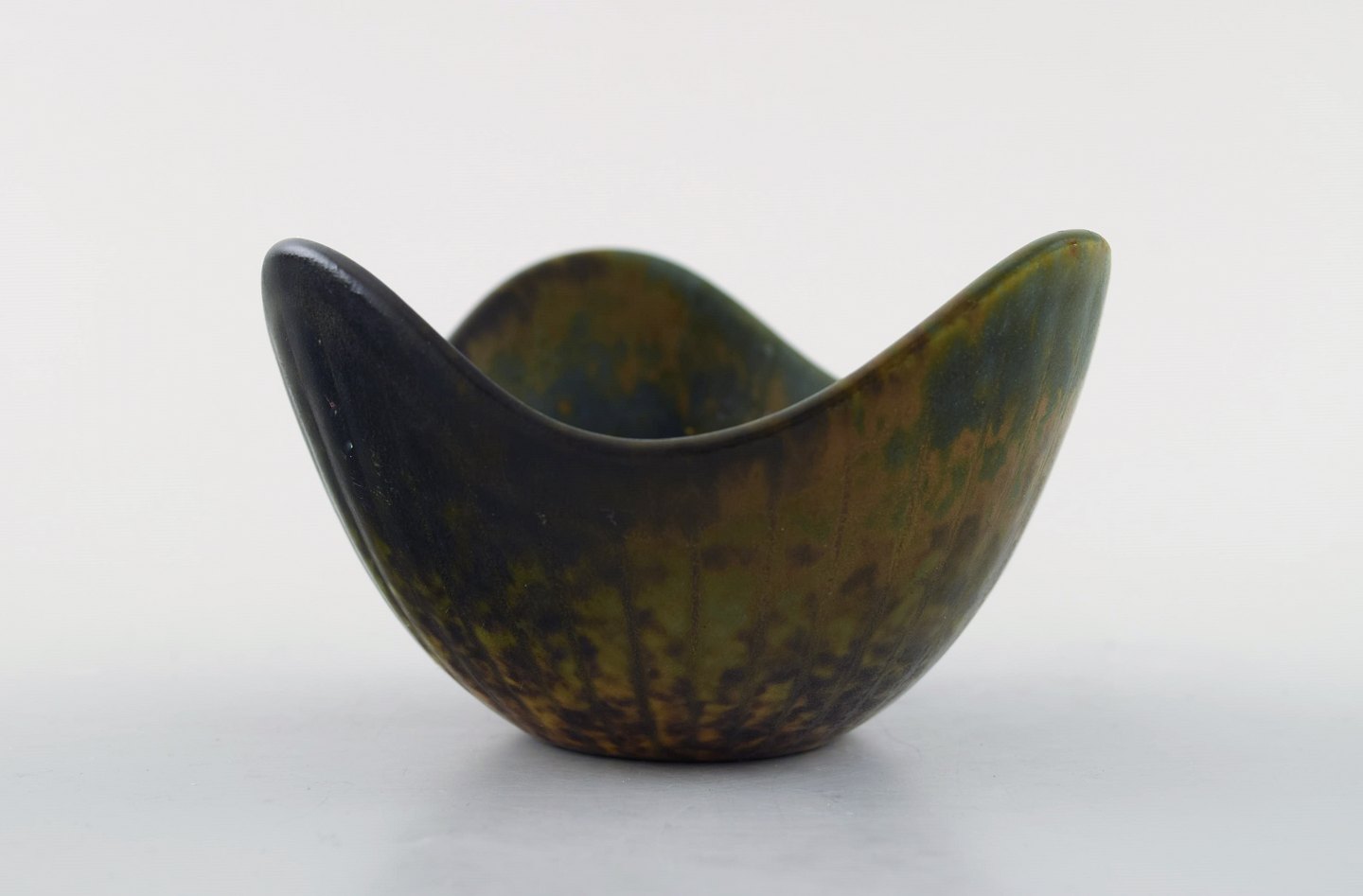 Rørstrand/Rörstrand stentøjsskål af Gunnar Nylund. Måler: 8,5 x 5 cm. I perfekt stand. Flot glasur i sorte og grønne nuancer. 1. sortering. Stemplet.