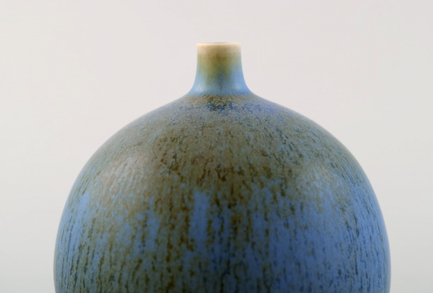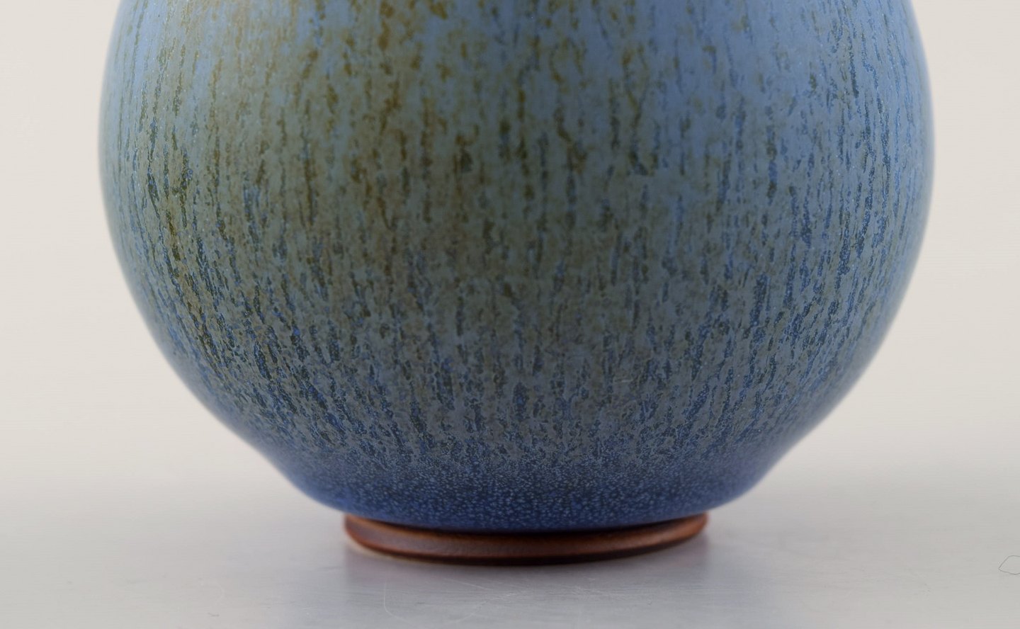 Tomas Anagrius (b.1939), Swedish ceramist. Unique ceramic vase in beautiful blue glaze. Rare spherical shape with narrow neck.