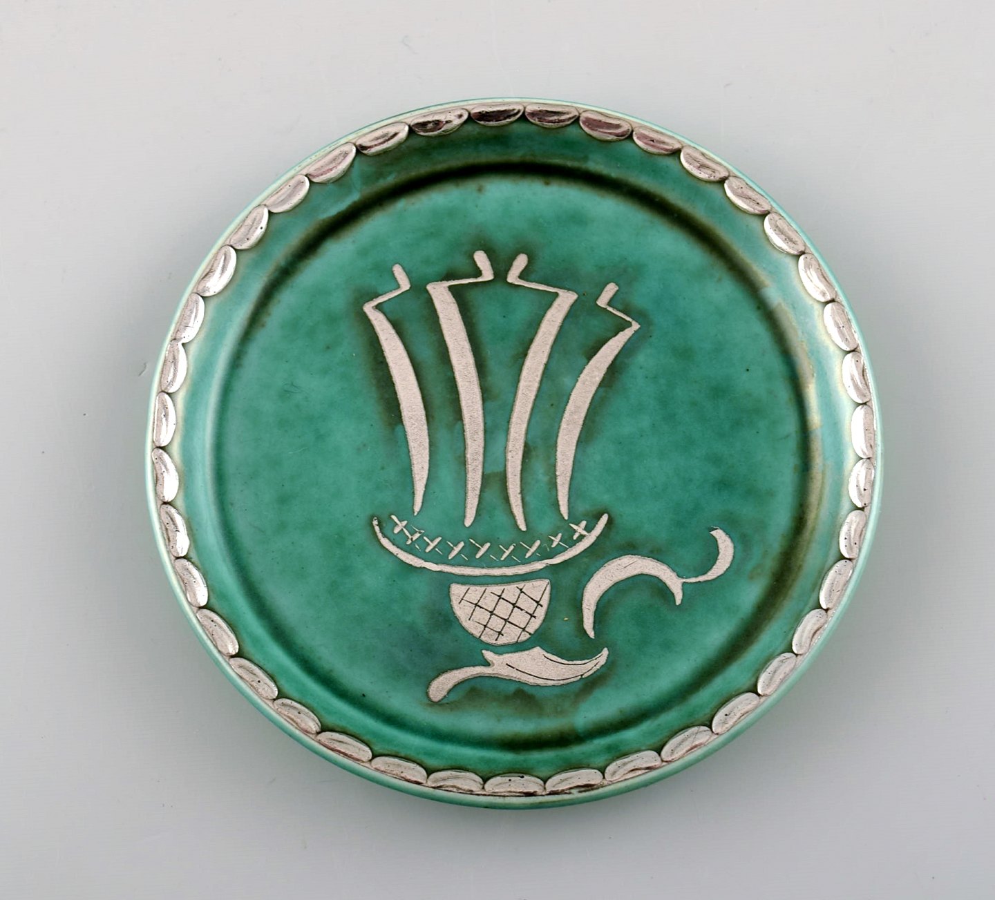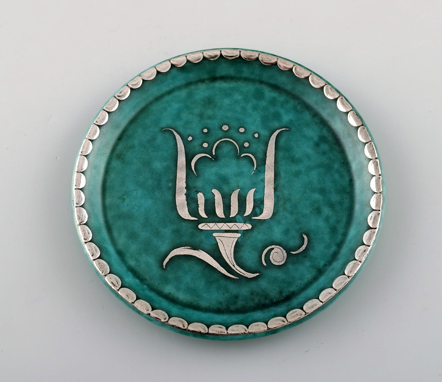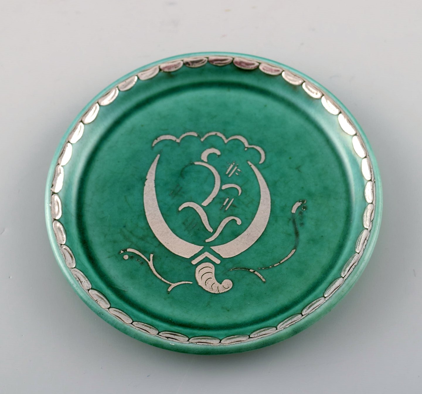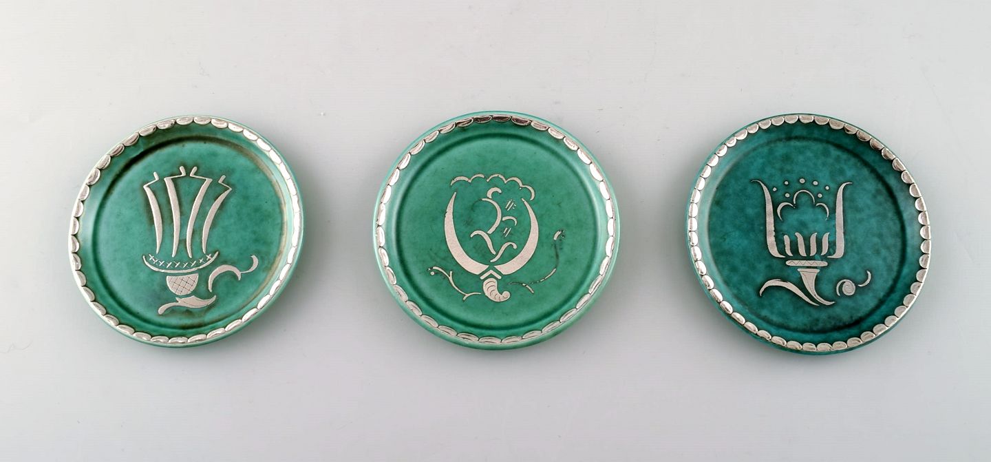Wilhelm Kåge, Gustavsberg, set of 3 coasters decorated with silver inlaid. Sweden 1940s. diameter: 9 cm. Stamped Gustavsberg, Kåge. In perfect condition.