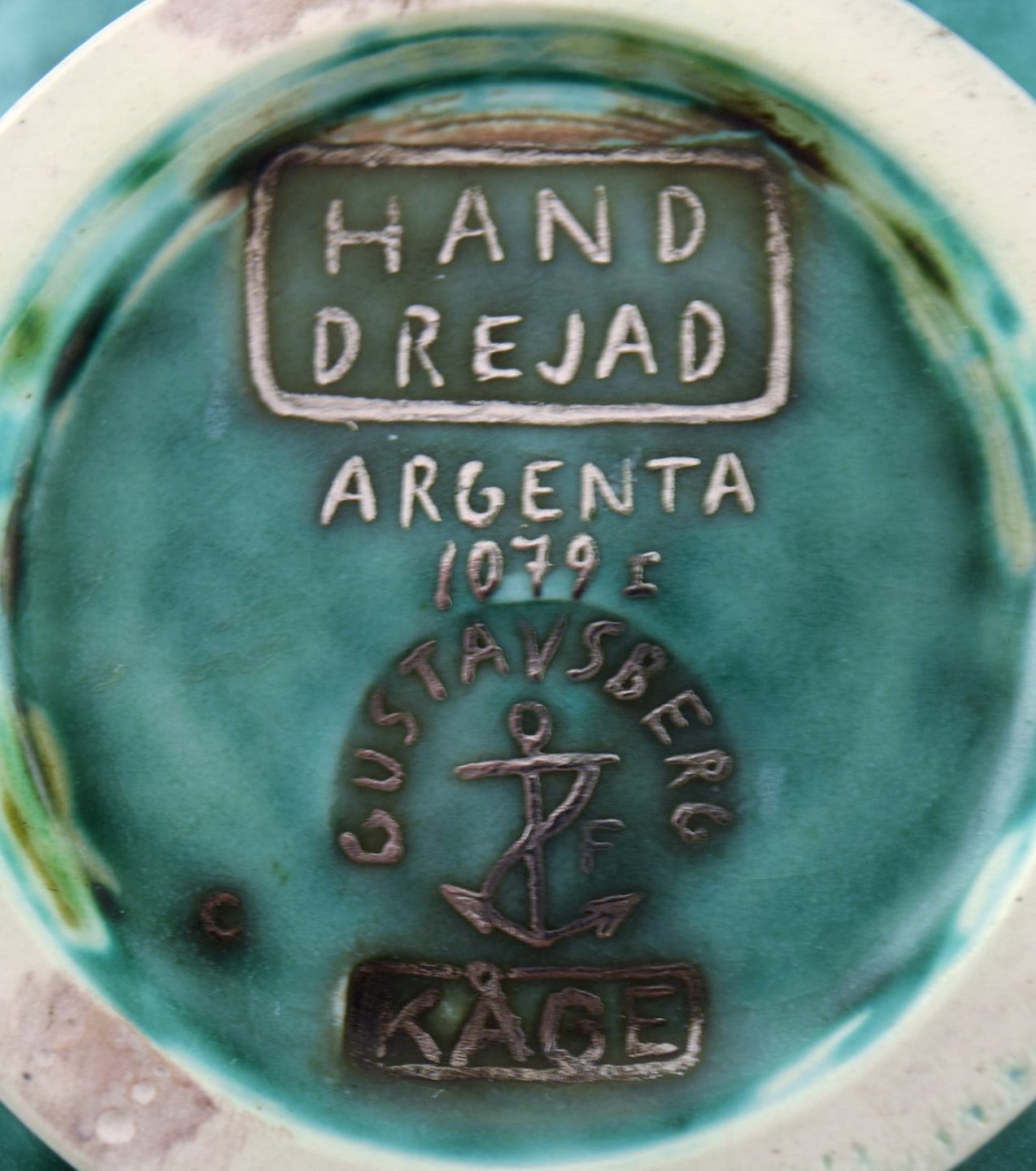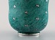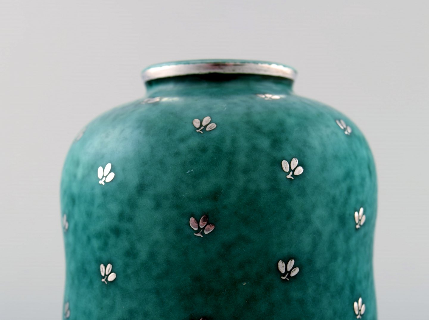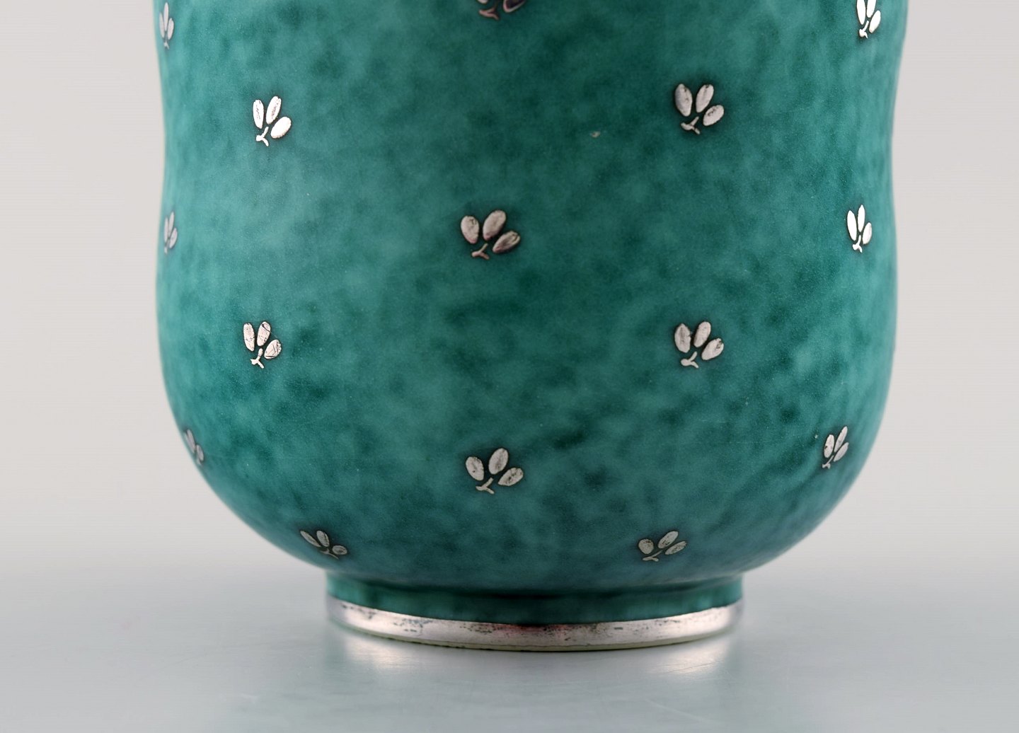 Wilhelm Kåge, Gustavsberg, Argenta Art deco ceramic vase decorated with leaves in silver inlaid. Sweden 1940s. Measures 12 x 10 cm. Marked Gustavsberg, Kåge. In perfect condition.