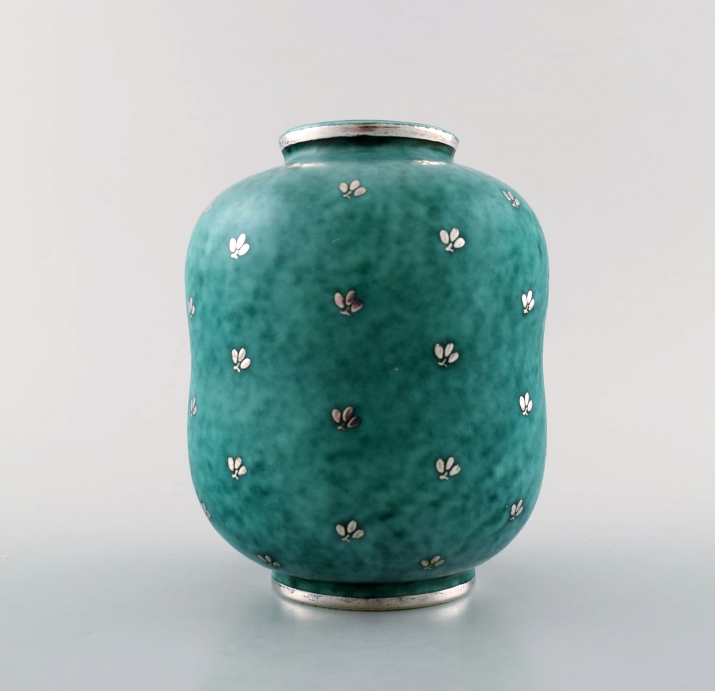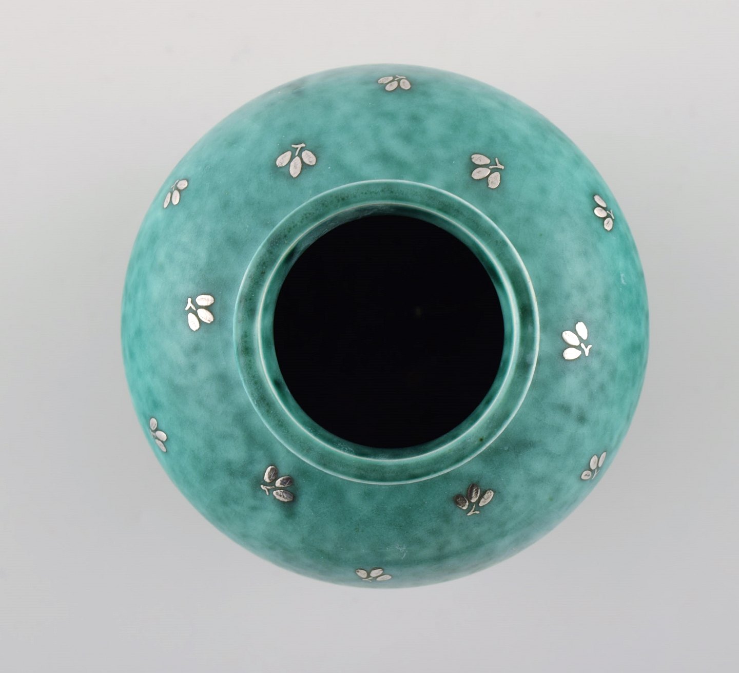 Wilhelm Kåge, Gustavsberg, Argenta Art deco ceramic vase decorated with leaves in silver inlaid.