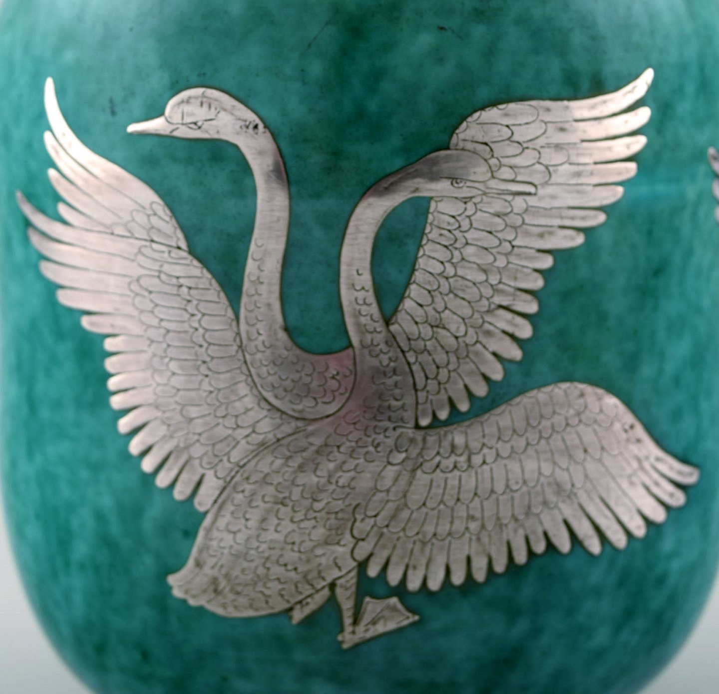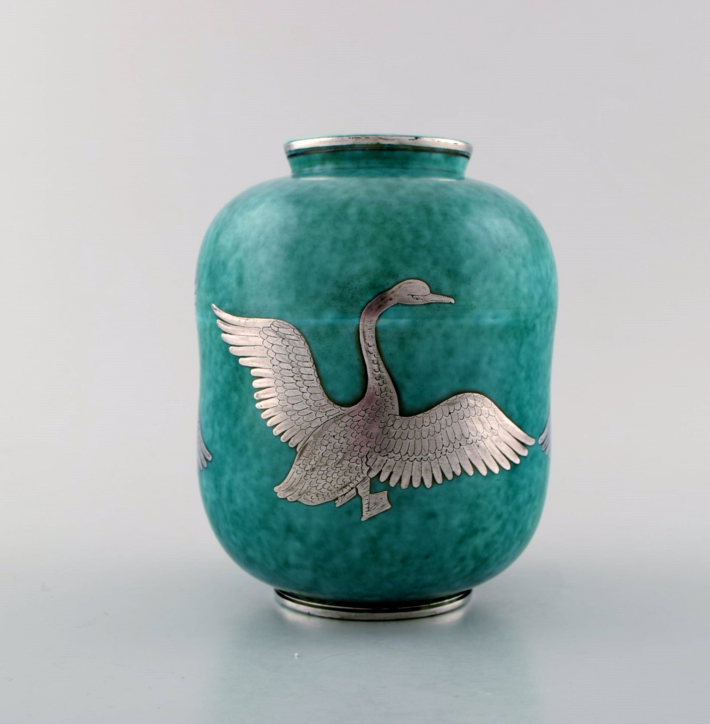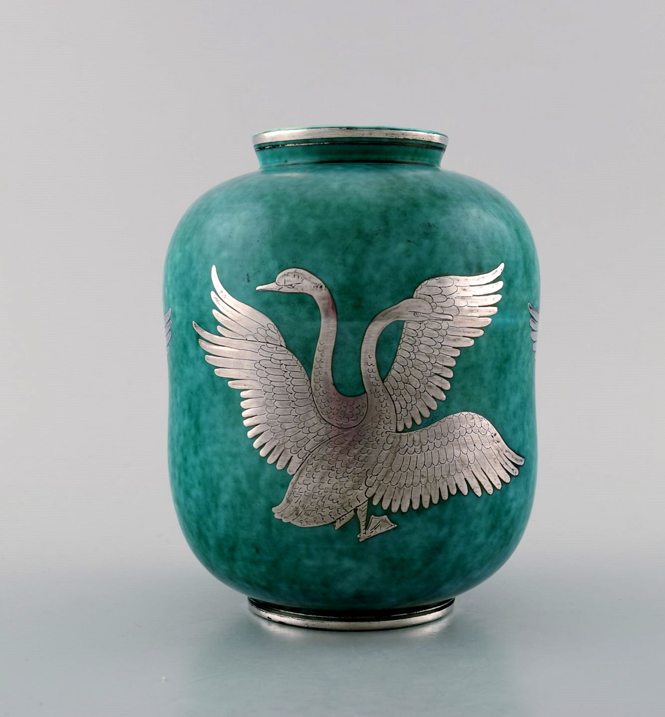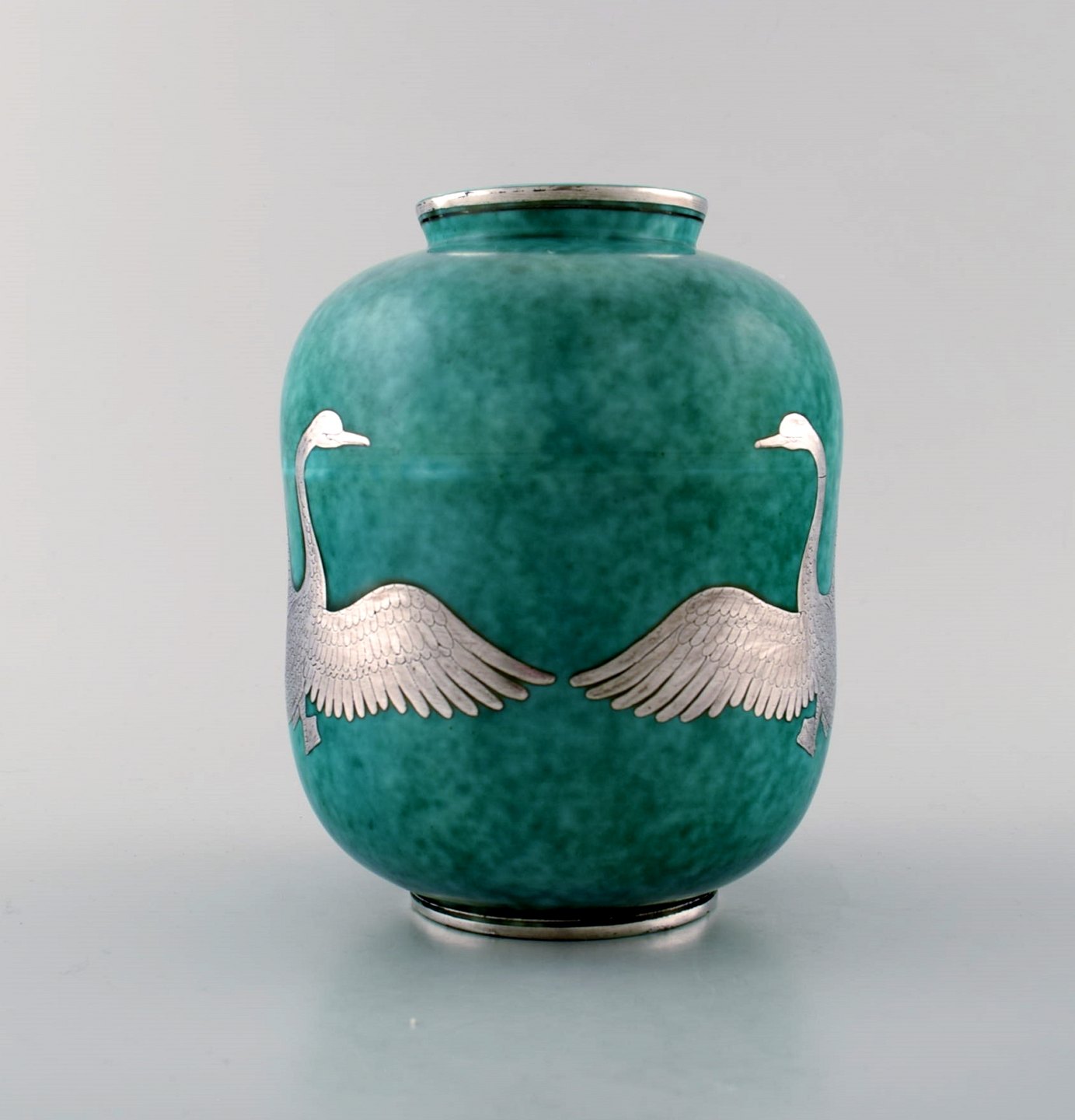 Wilhelm Kåge, Gustavsberg, Argenta Art deco keramikvase dekoreret med svaner. Sverige 1940´erne. Måler 15 x 12 cm. Stemplet Gustavsberg, Kåge. I perfekt stand.