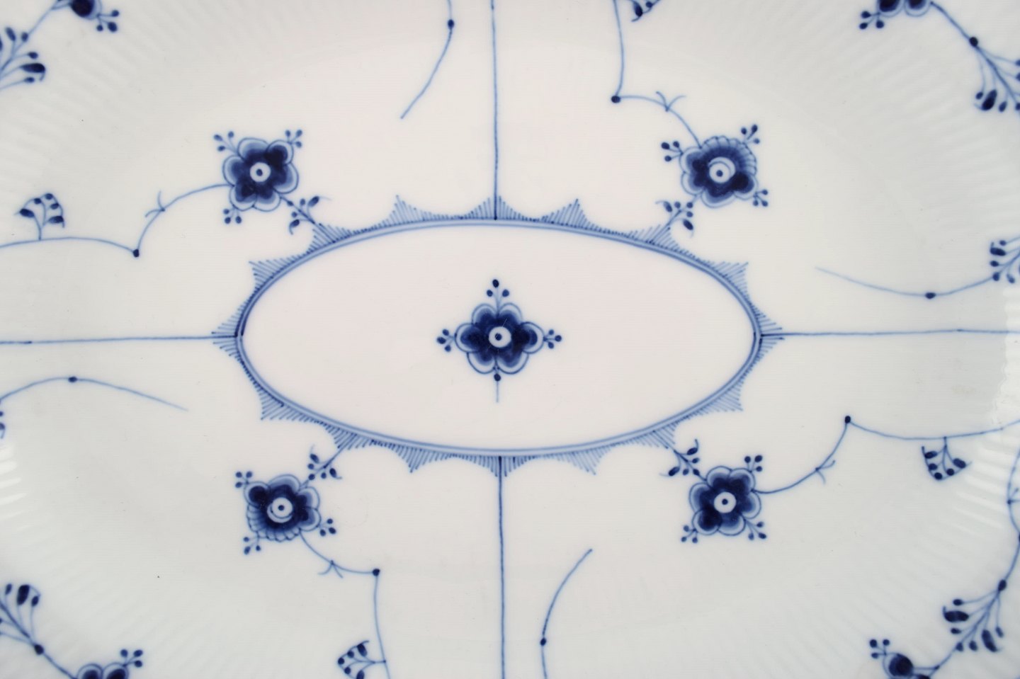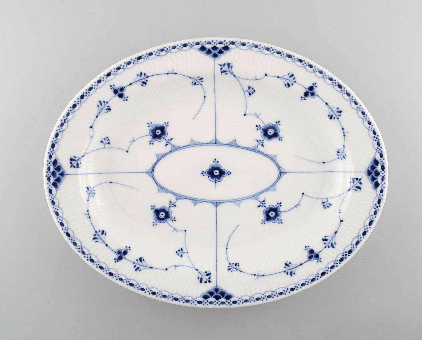 Royal Copenhagen Blue Fluted Half Lace serving dish # 1/533 Measures: 37.5 x 29 x 5 cm. 1st factory quality. In very good condition. Hairline crack on the underside.