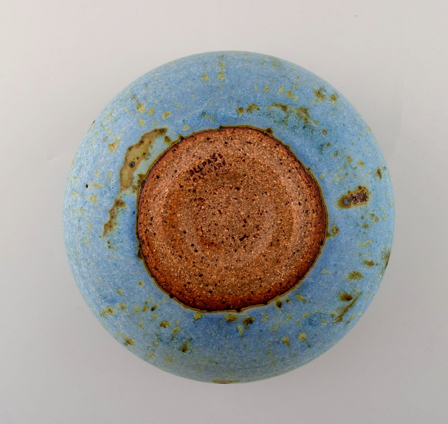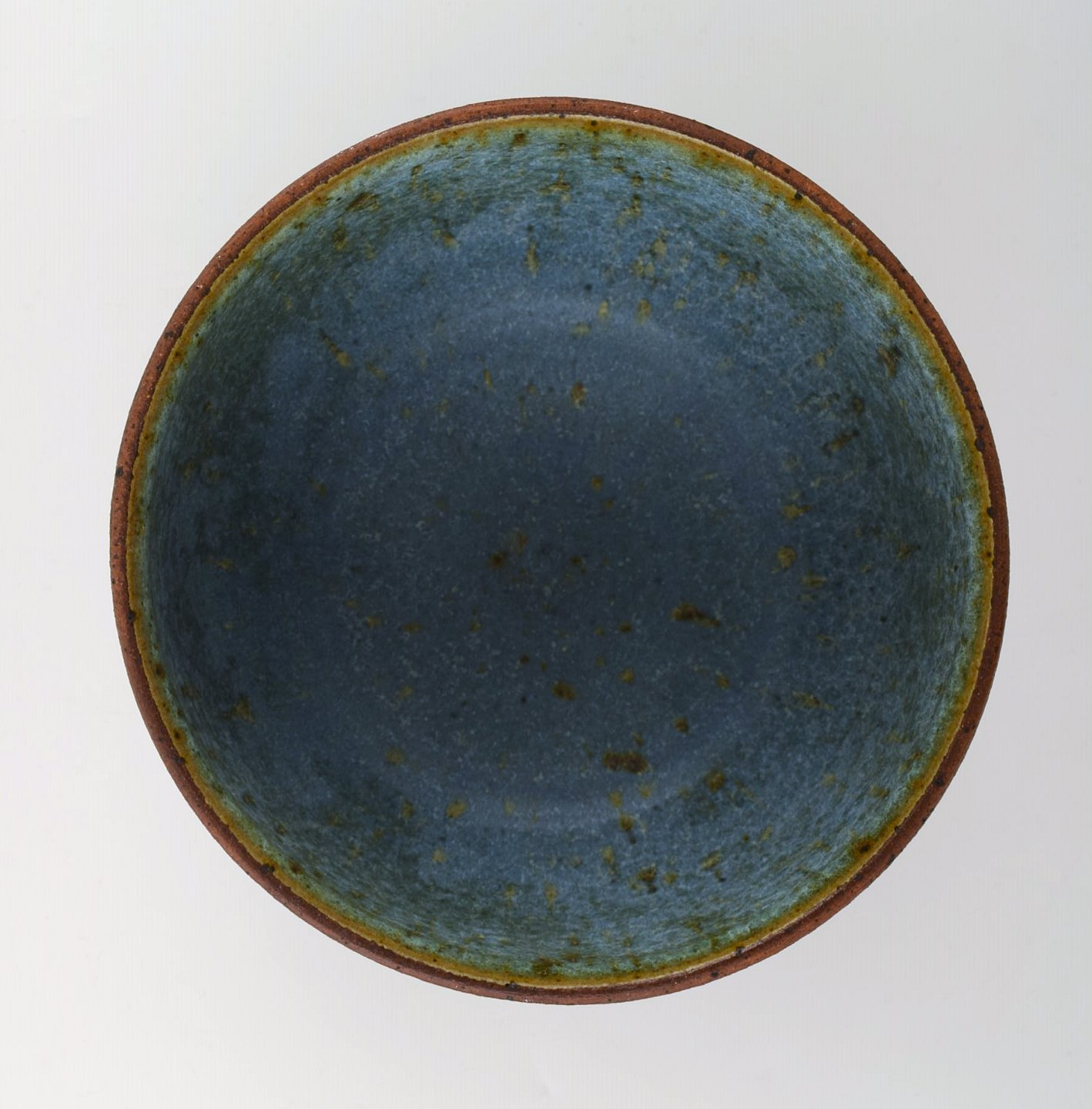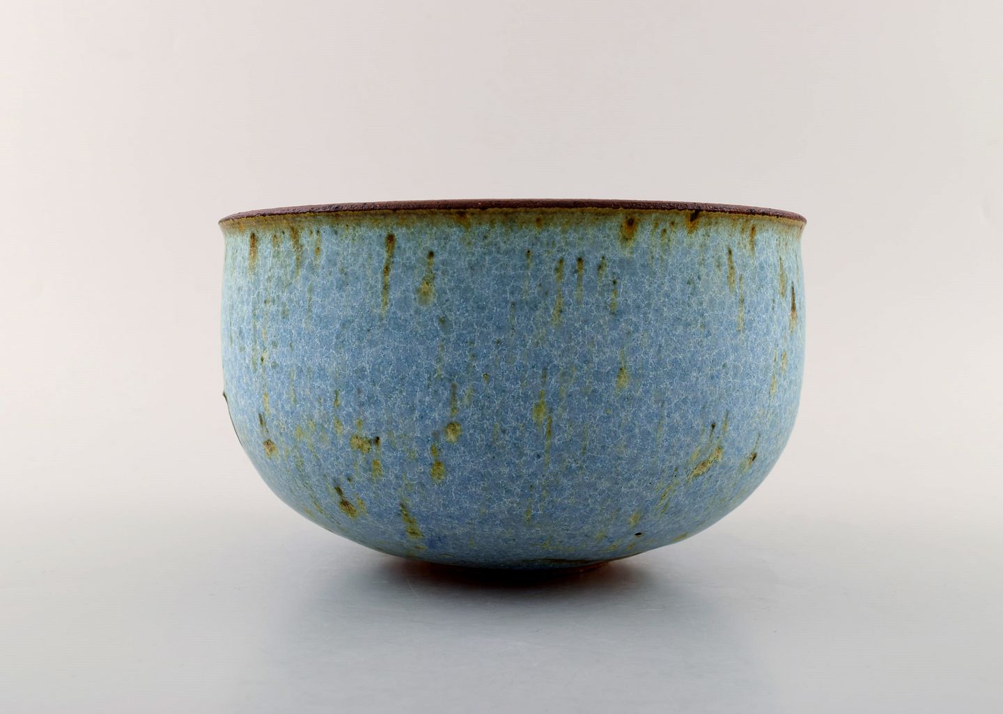 Helle Allpass (1932-2000). Stor skål af glaseret stentøj i smuk turkis glasur med jernpletter. 1960/70'erne.