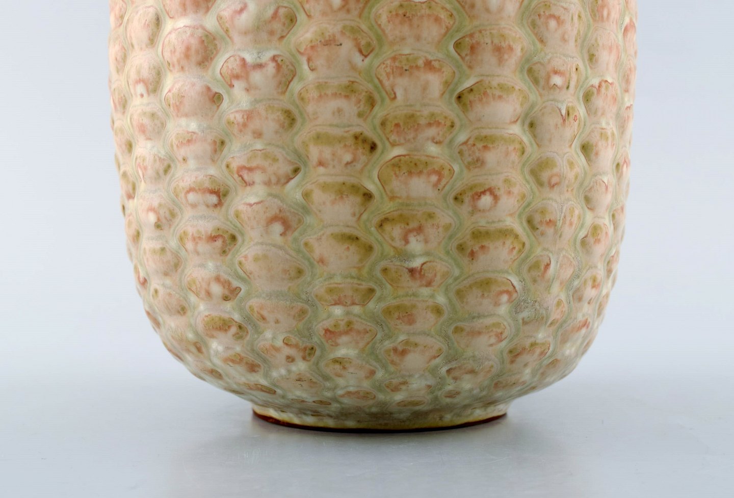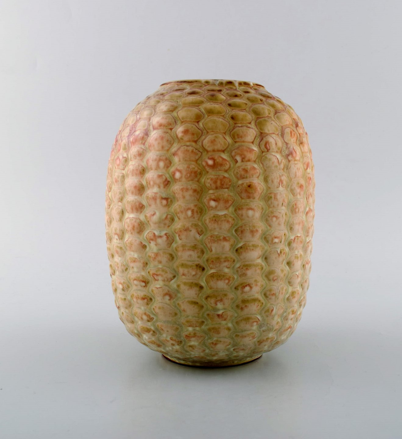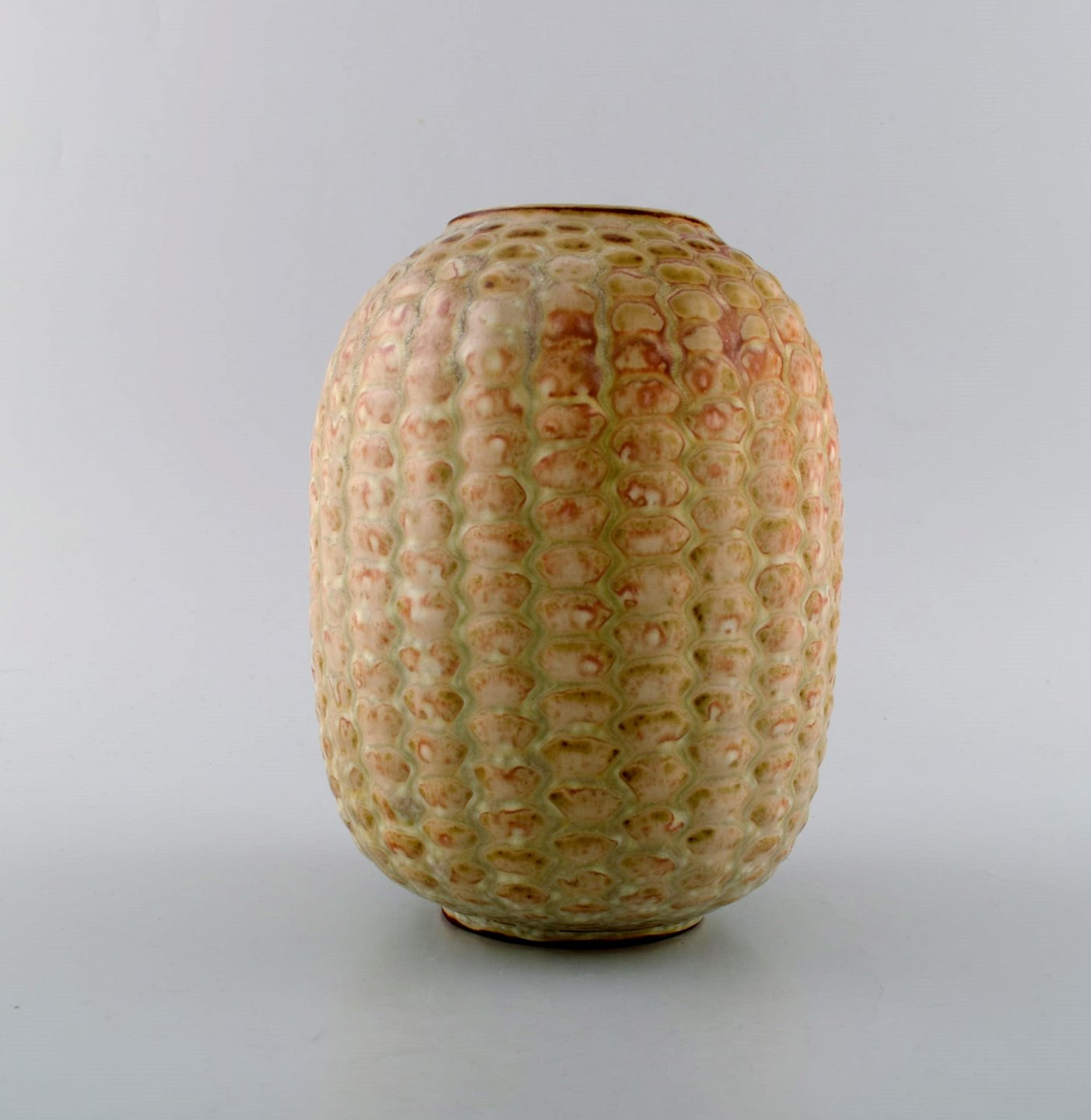 Axel Salto for Royal Copenhagen: Stor vase af stentøj modelleret med knopper i relief, dekoreret med glasur i lyse jordtoner. Knoppet stil. 1940'erne