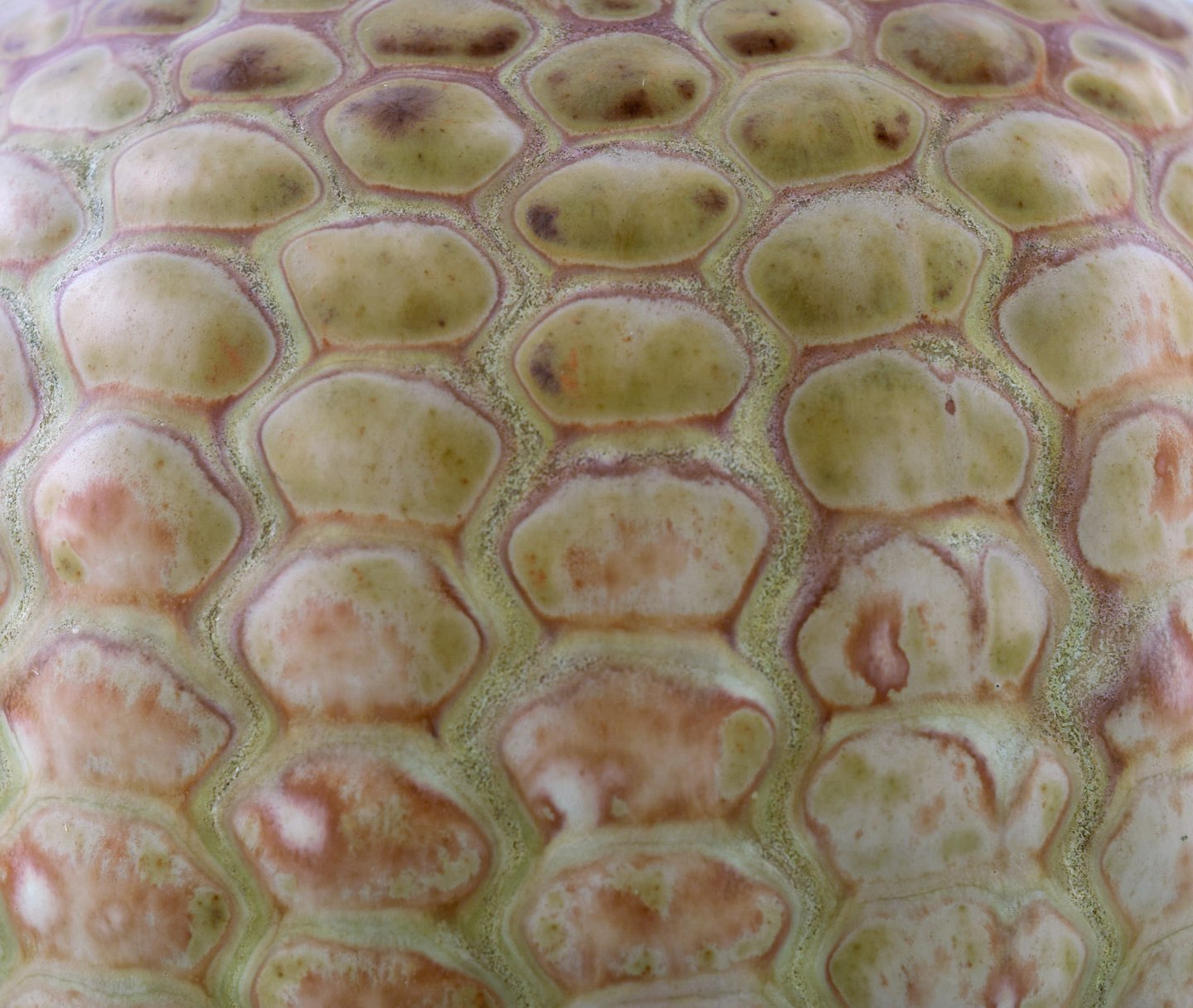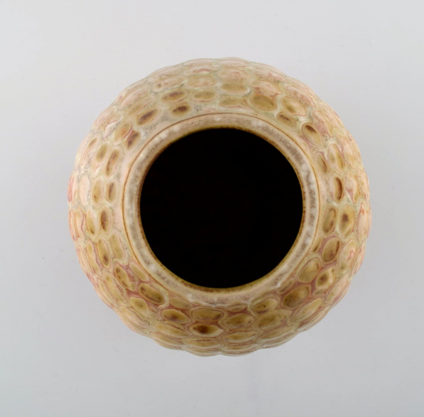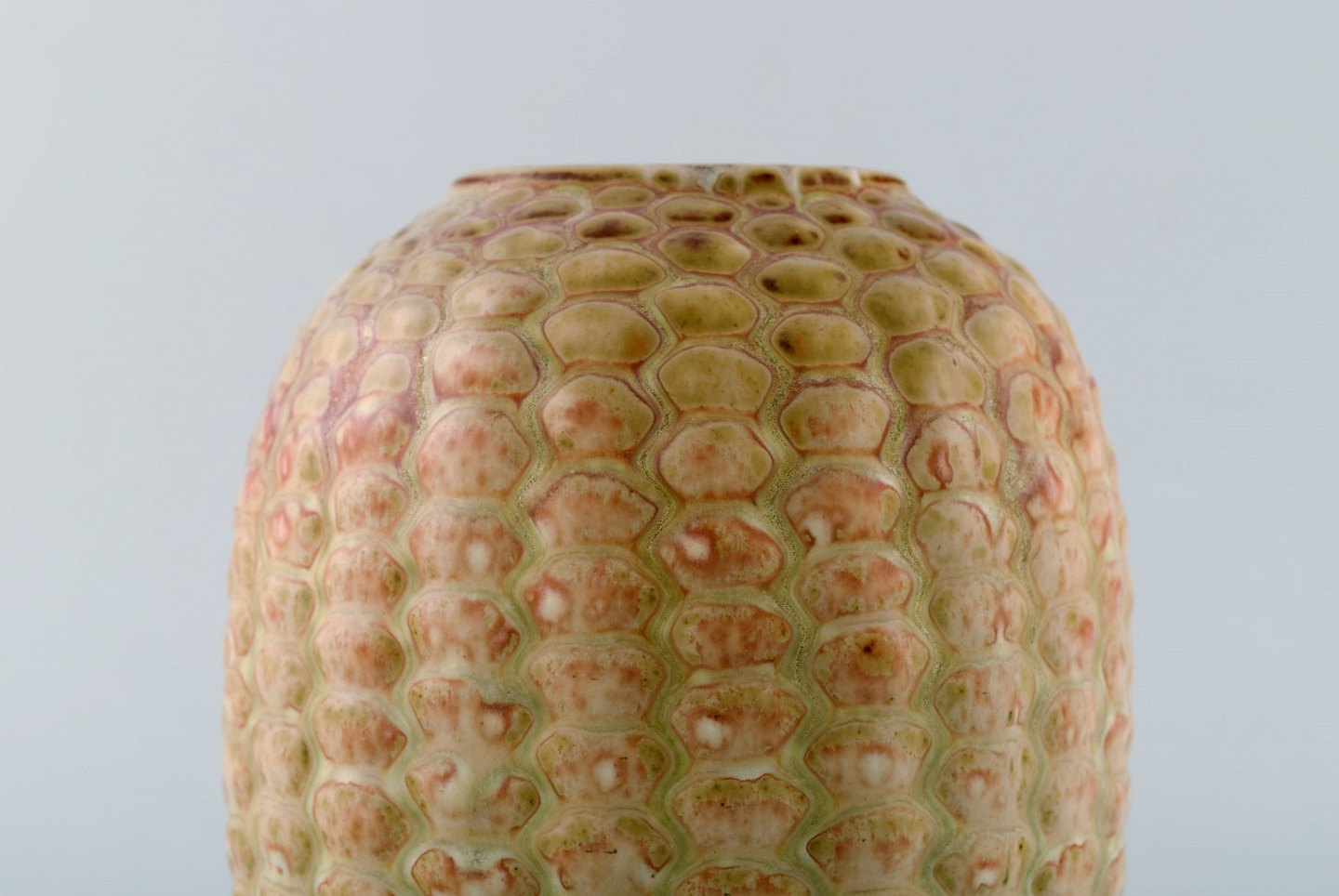 Axel Salto for Royal Copenhagen: Stor vase af stentøj modelleret med knopper i relief, dekoreret med glasur i lyse jordtoner. Knoppet stil. 1940'erne