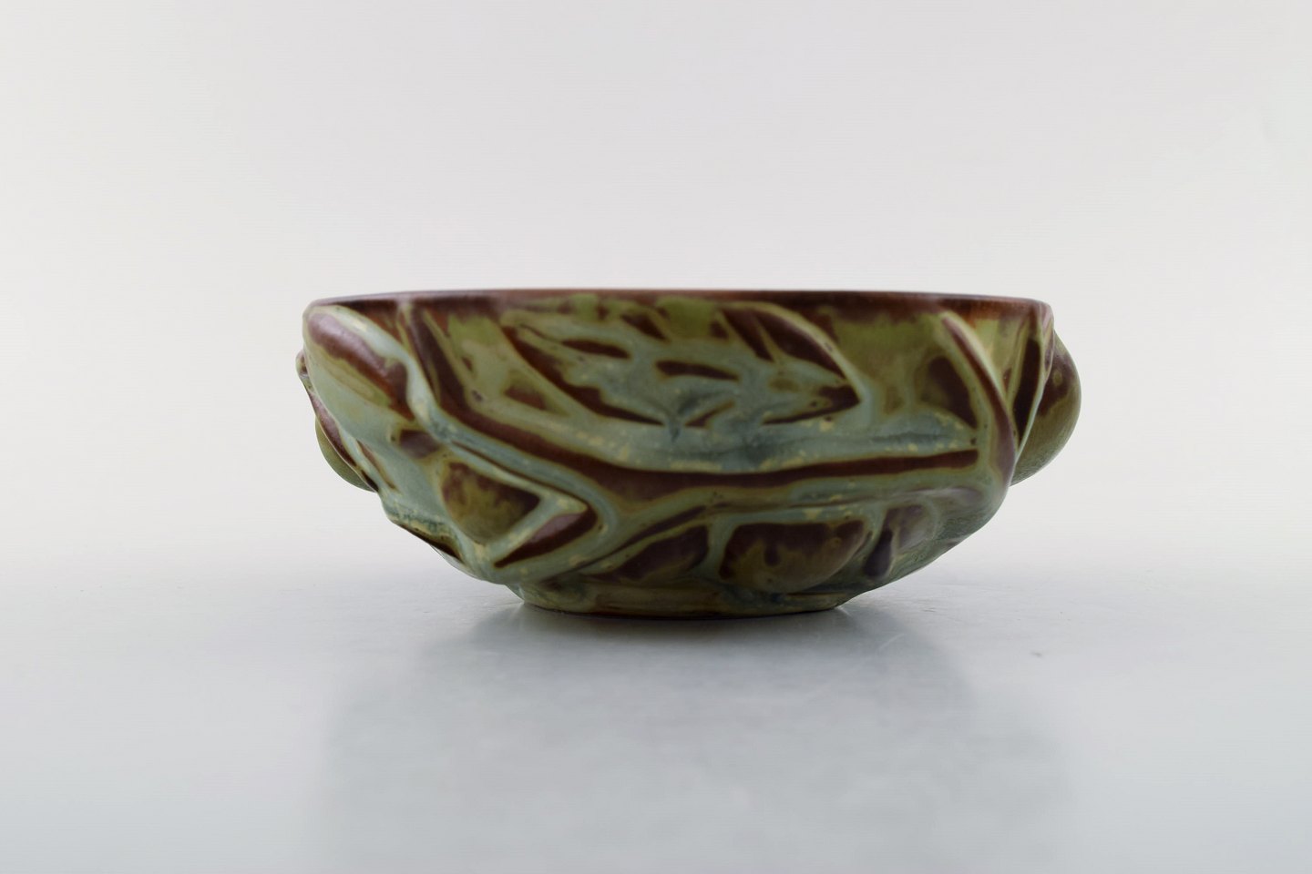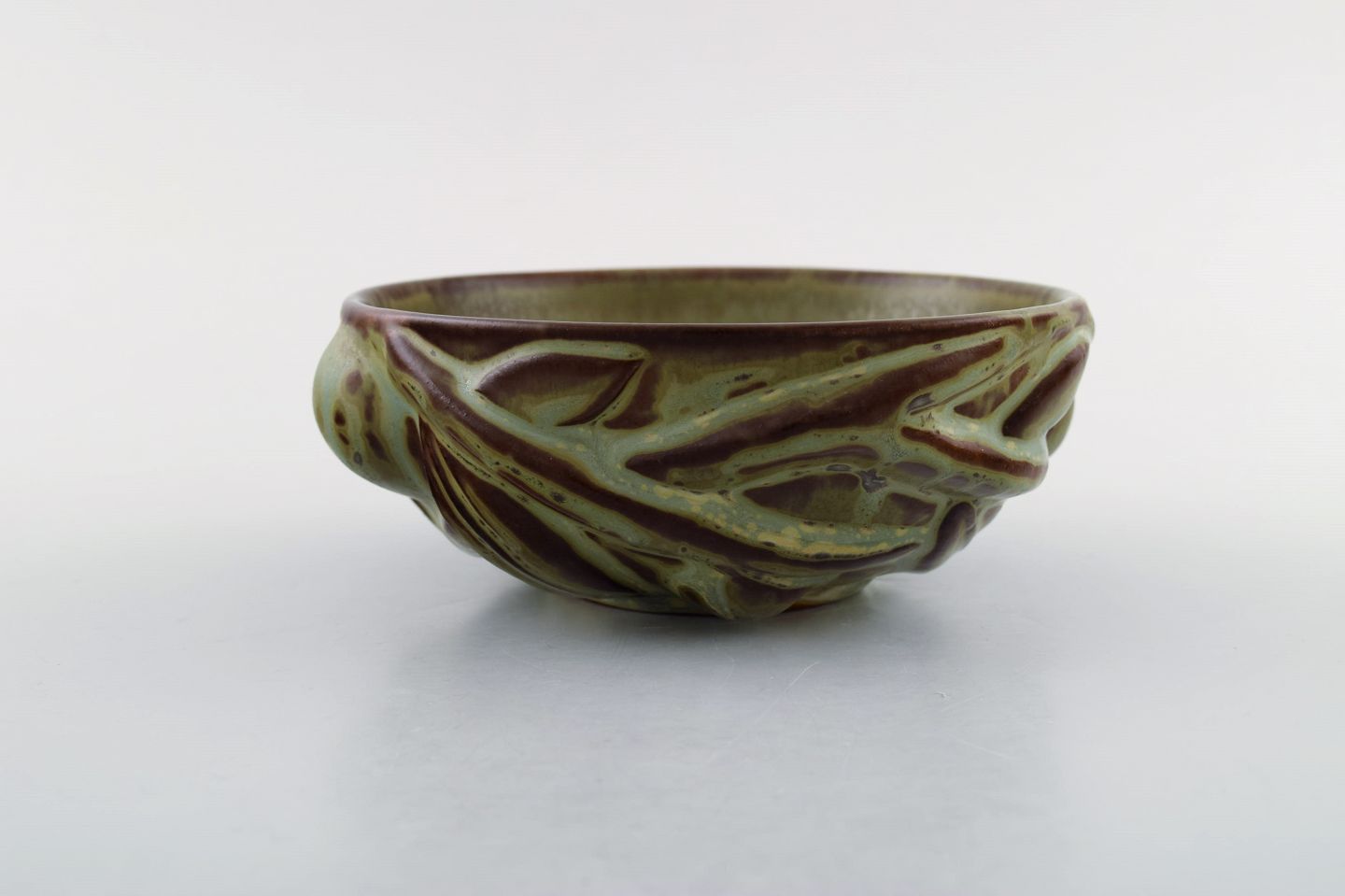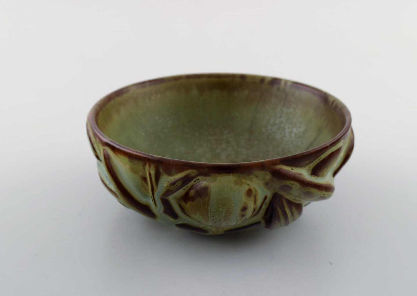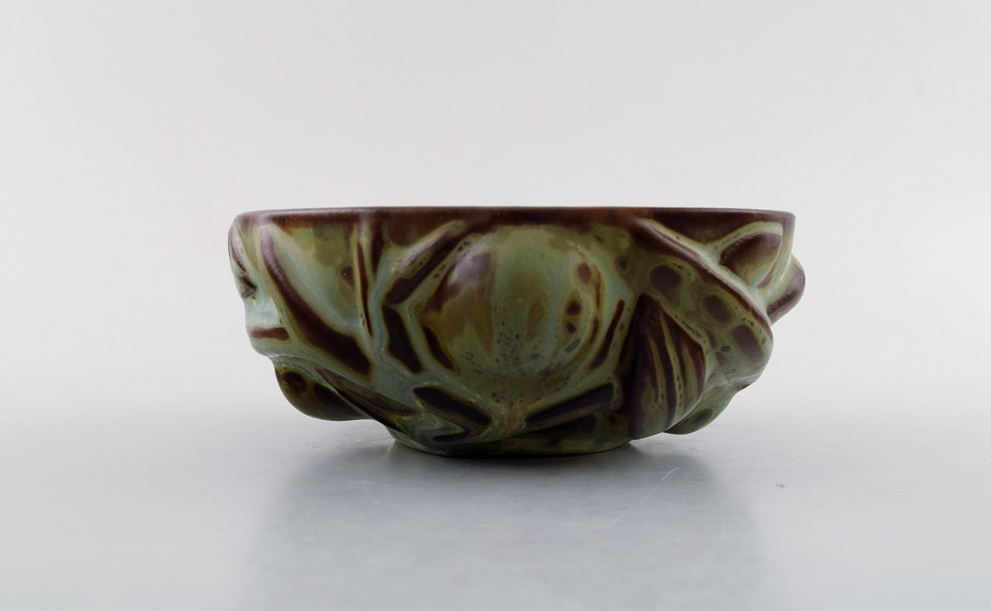 Axel Salto for Royal Copenhagen: Skål af stentøj modelleret i organisk form, dekoreret med glasur i jordnuancer. 1940'erne. Signeret: Salto, 20677. I perfekt stand. 1. sortering. Måler 13,5 cm. x 5,5 cm.
