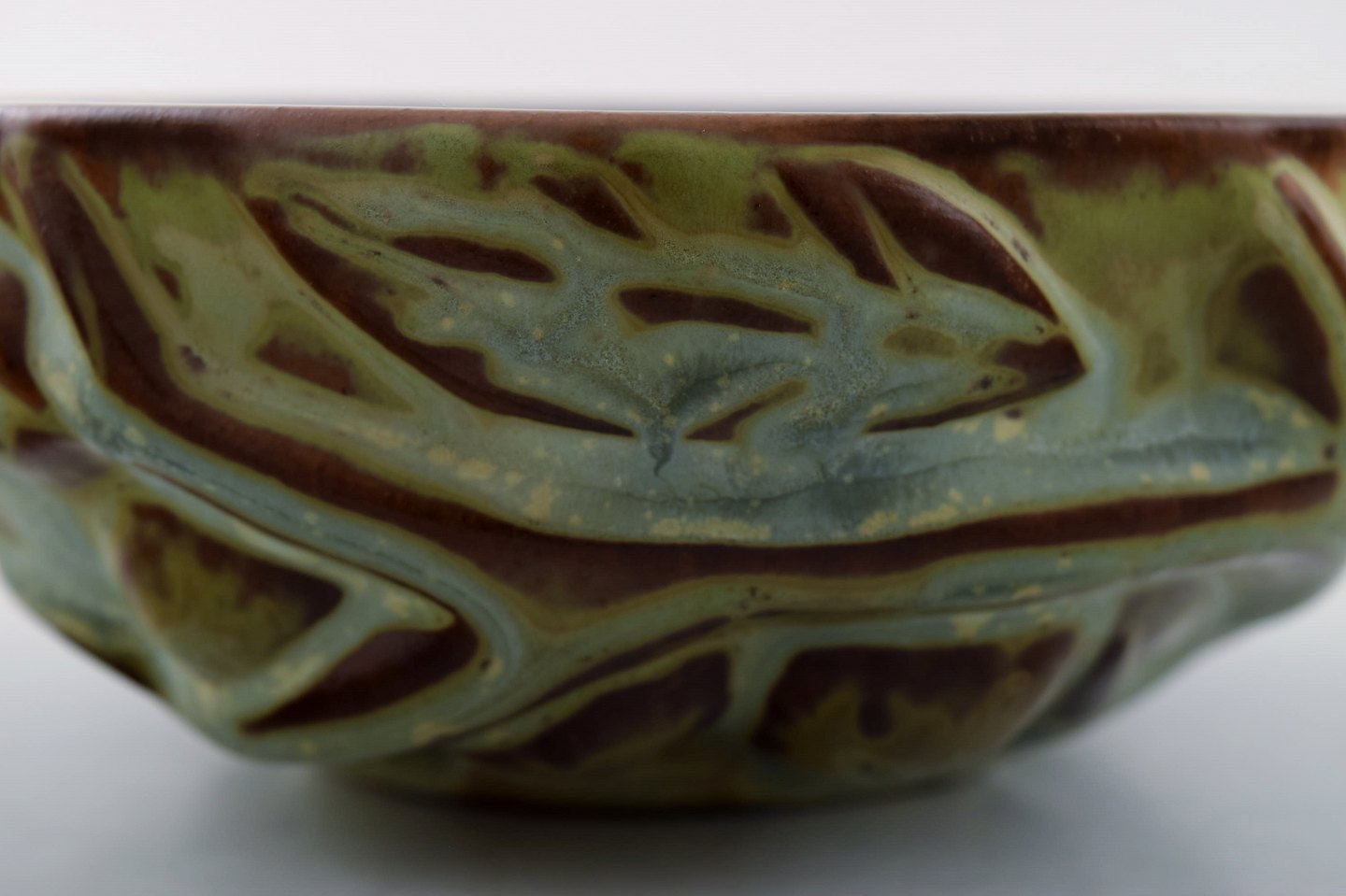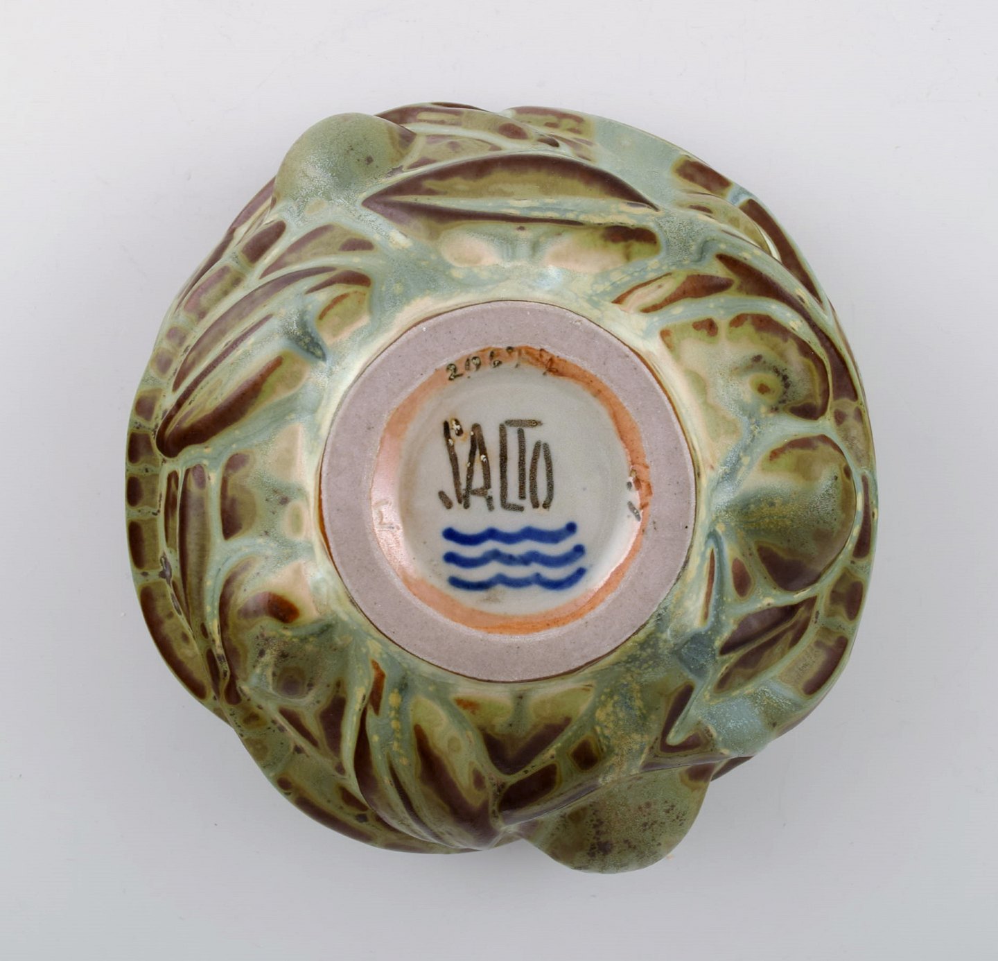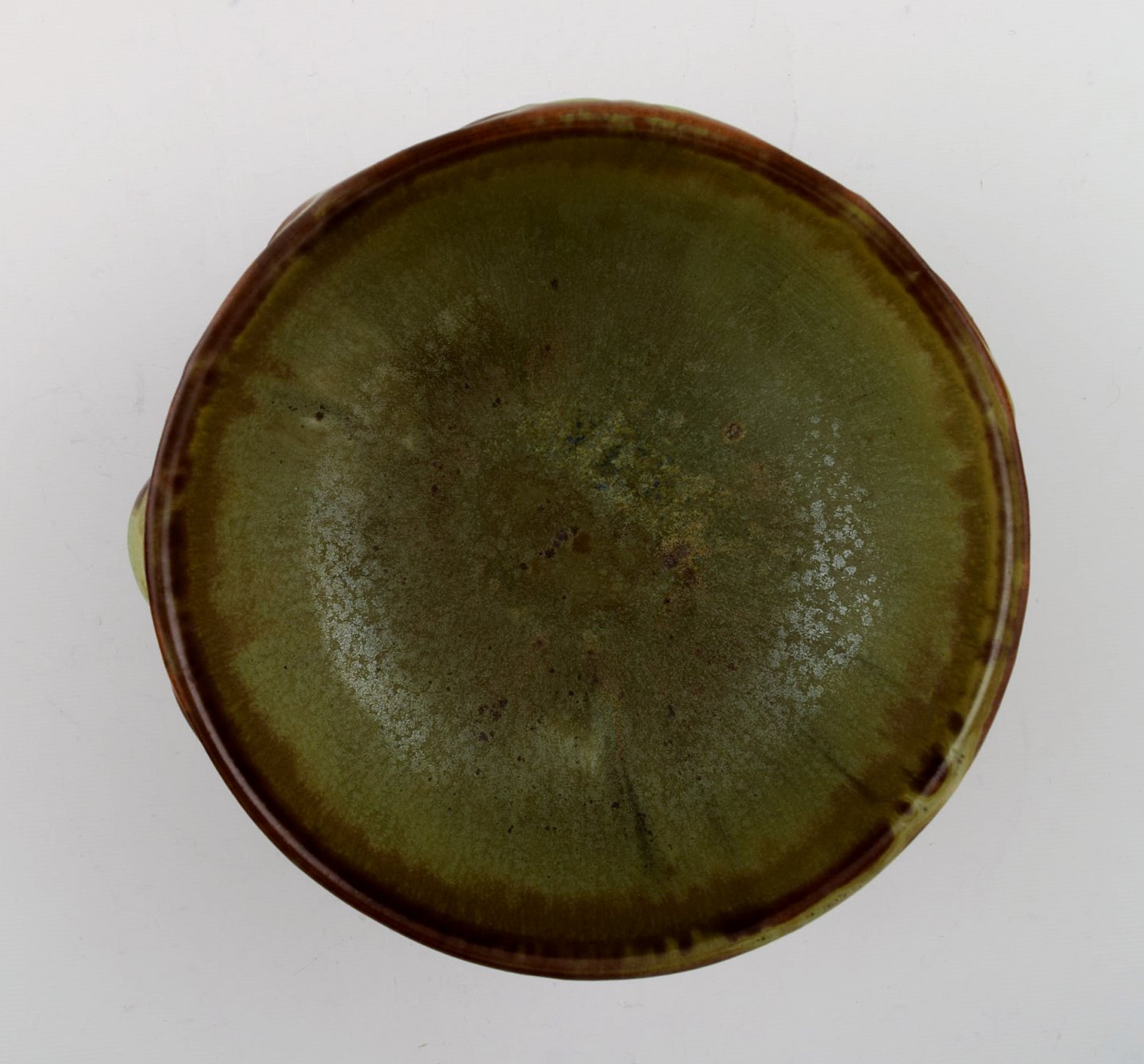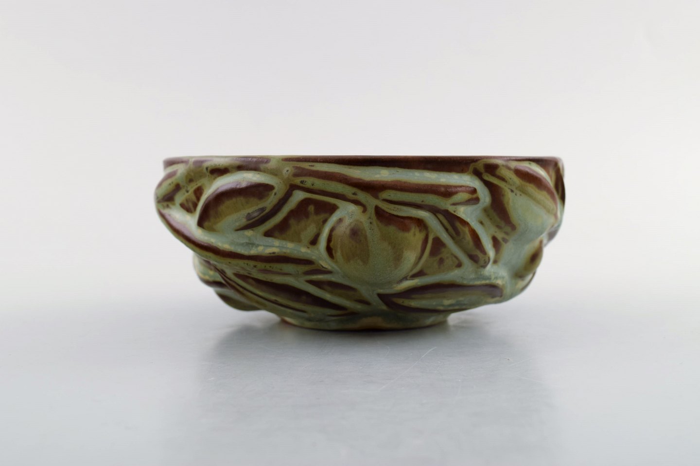 Axel Salto for Royal Copenhagen: Skål af stentøj modelleret i organisk form, dekoreret med glasur i jordnuancer. 1940'erne. Signeret: Salto, 20677. I perfekt stand. 1. sortering. Måler 13,5 cm. x 5,5 cm.
