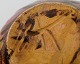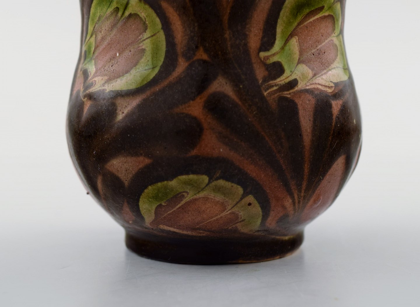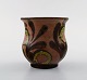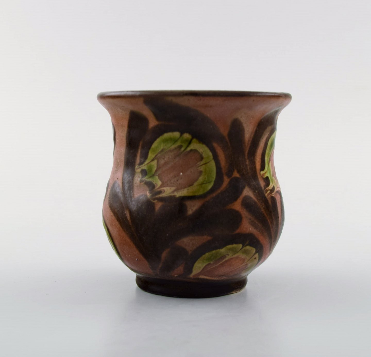 Kähler, HAK, glazed stoneware vase in modern design. 1930 / 40's. Cow horn technique. Flowers on brown background. Stamped. Measures: 8 x 8 cm. In perfect condition.