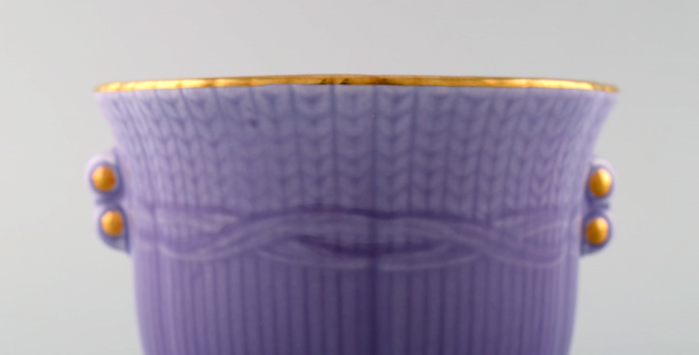 Louise Adelborg ( f.1885, d. 1971) for Rörstrand / Rørstrand. Sæt på fire Swedish Grace urtepotteskjulere i lilla med gulddekoration. 1930/40'erne.