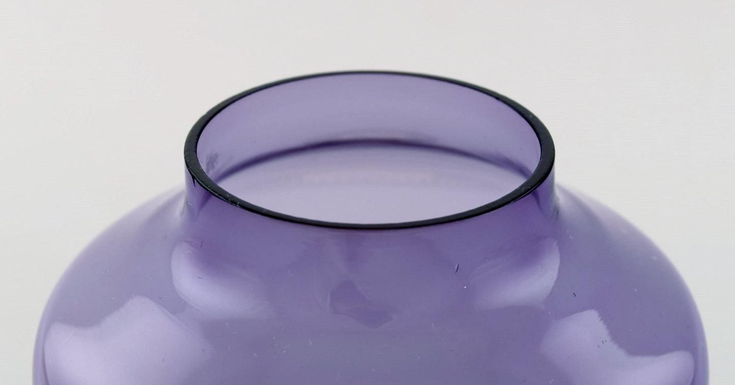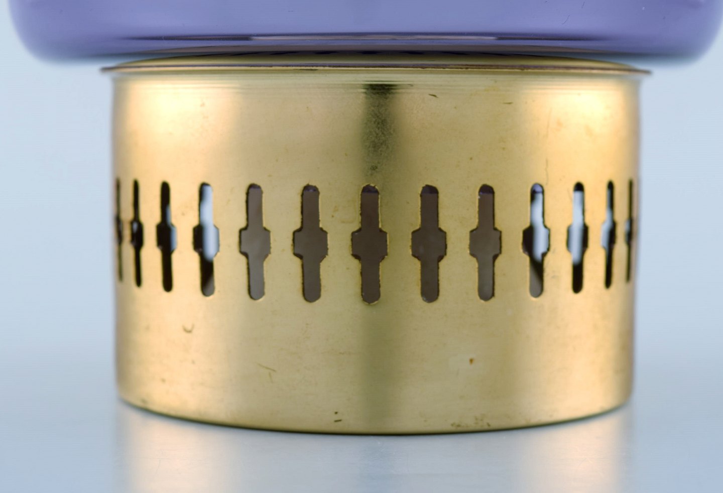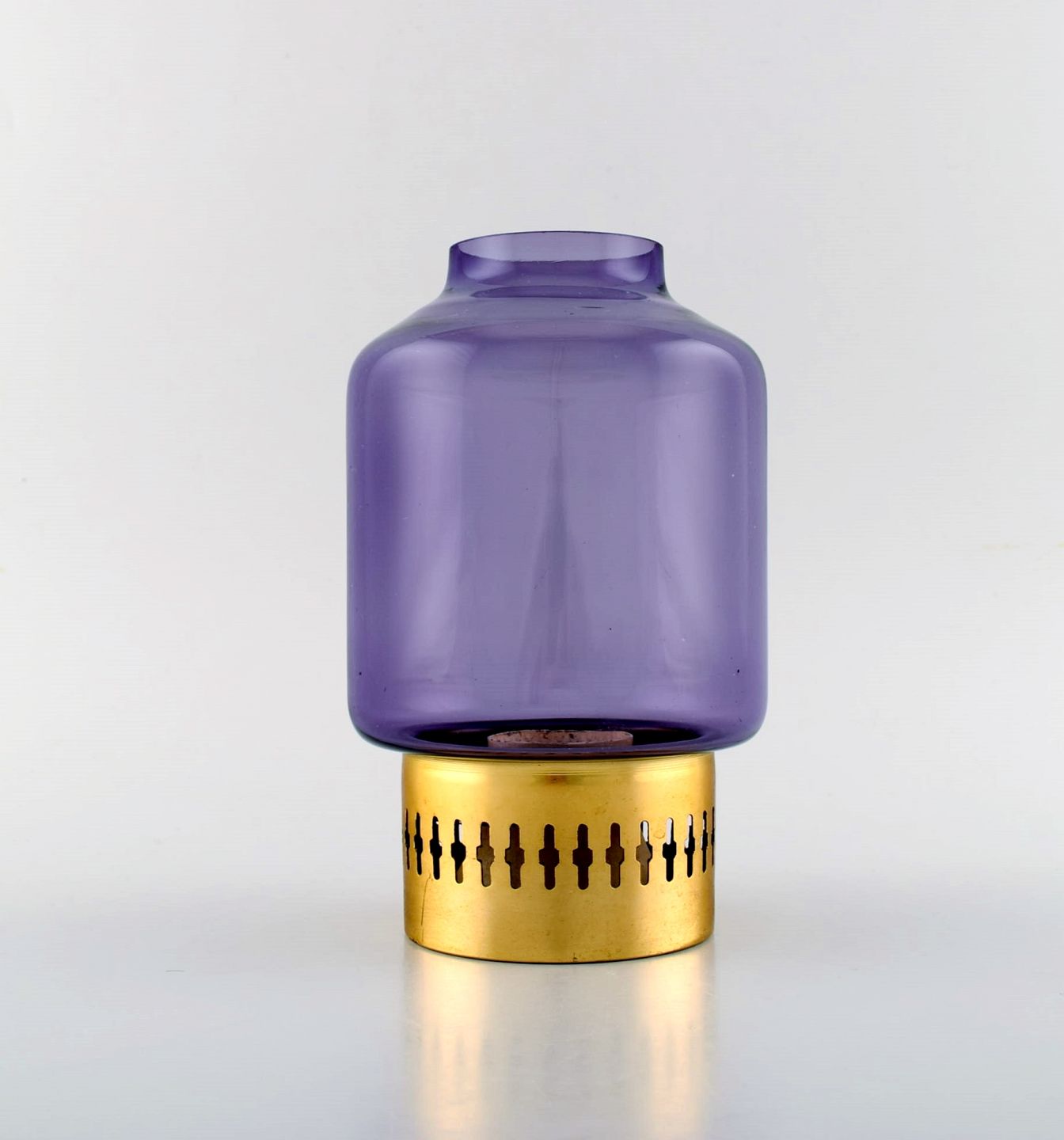 HANS-AGNE JAKOBSSON for A/B MARKARYD. Lysestage i messing og lilla kunstglas. Ca. 1970. Måler: 19 x 12 cm. I perfekt stand. Mærkat.