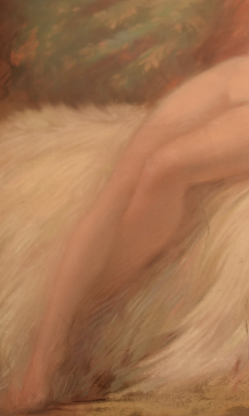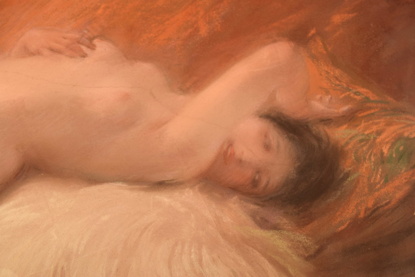 Naked young beauty on lambskin, French Art Deco, pastel.