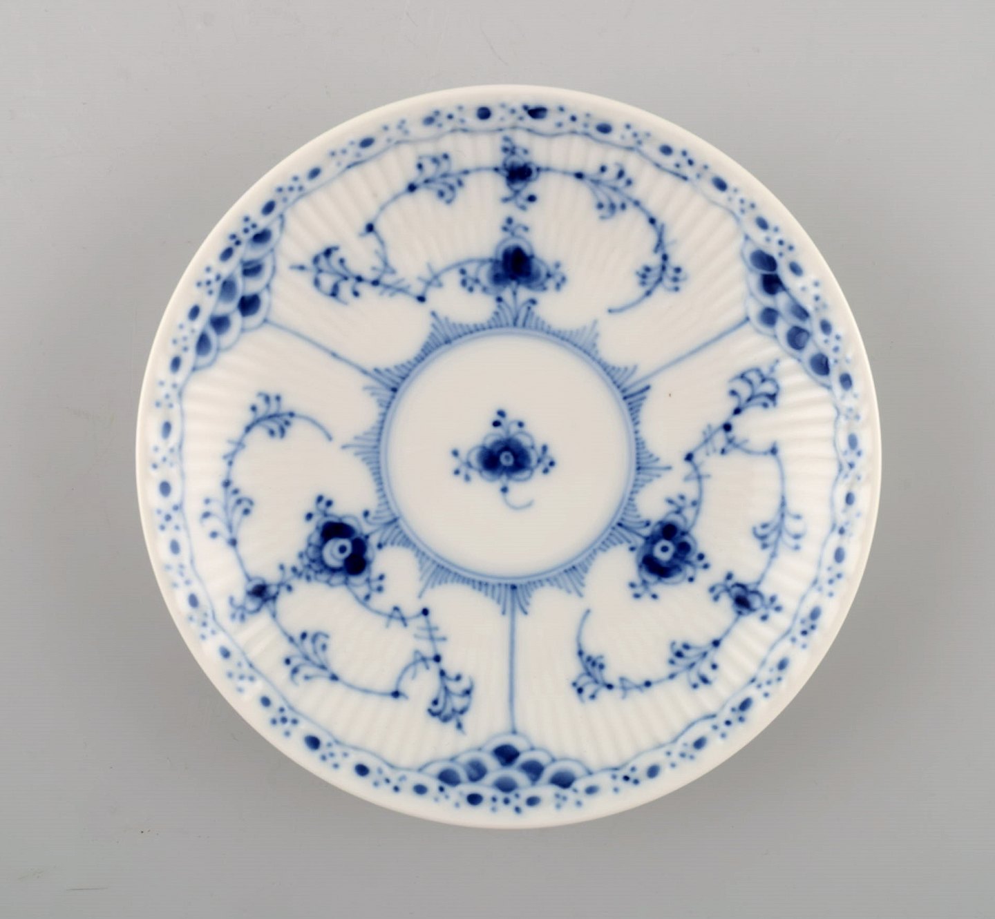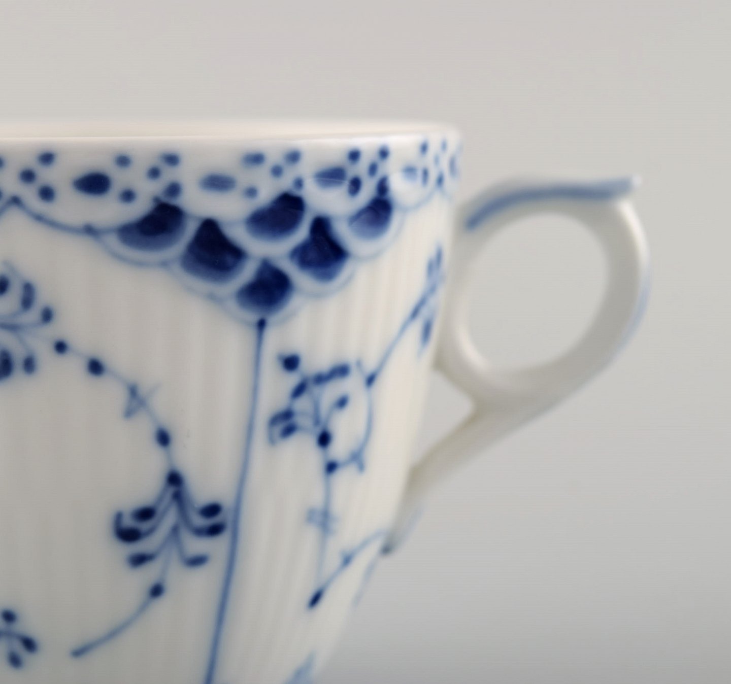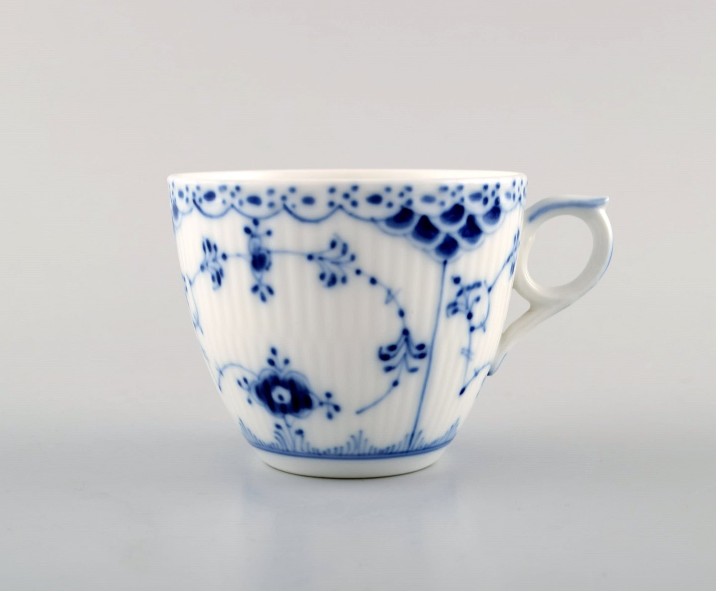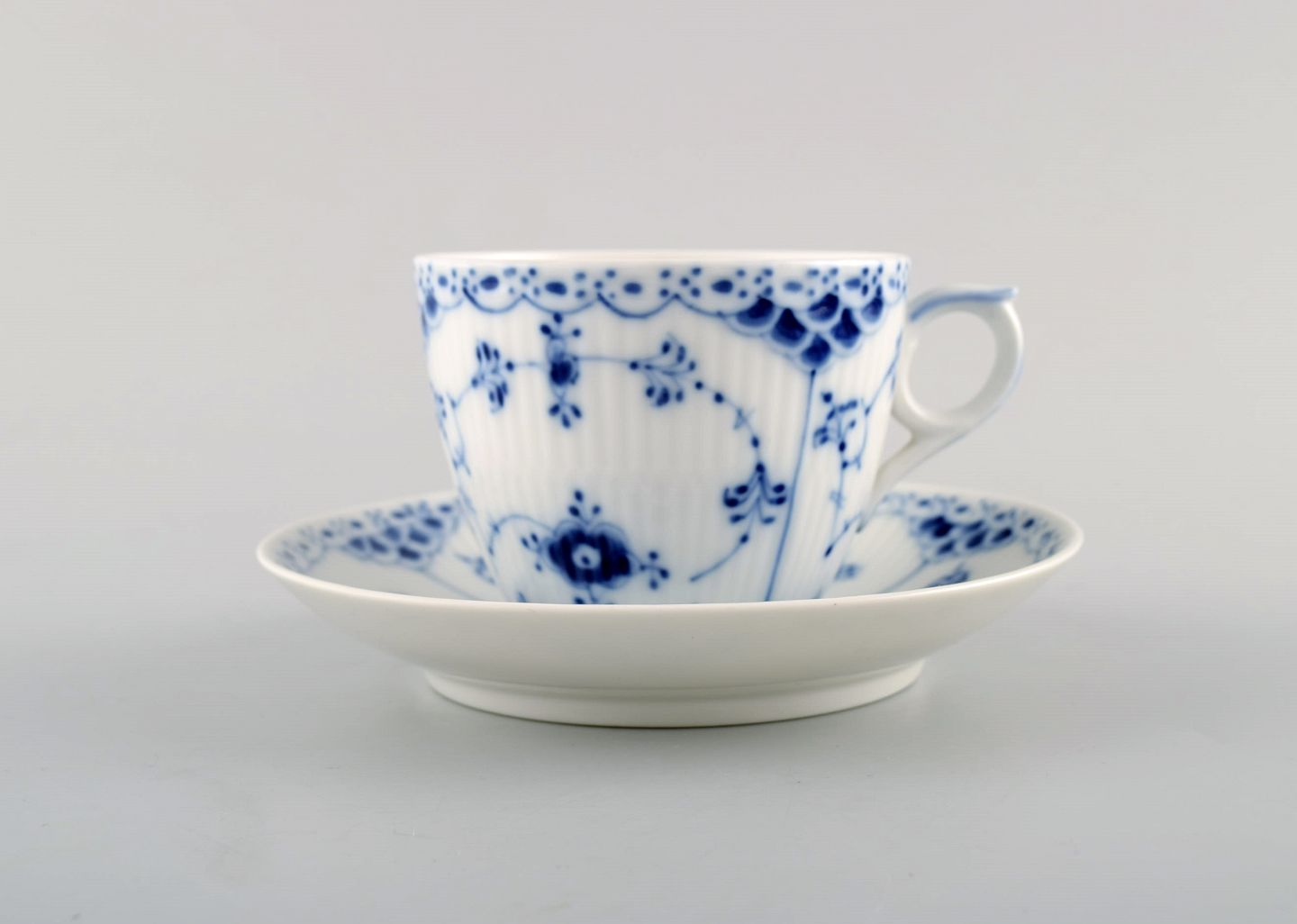Royal Copenhagen Blue Fluted Half Lace Coffee cup and saucer. Number 1/756. In very good condition. Cup measures: 8,5 cm x 6,5 cm. Saucer measures: 13 cm. Stamped. 1st factory quality.