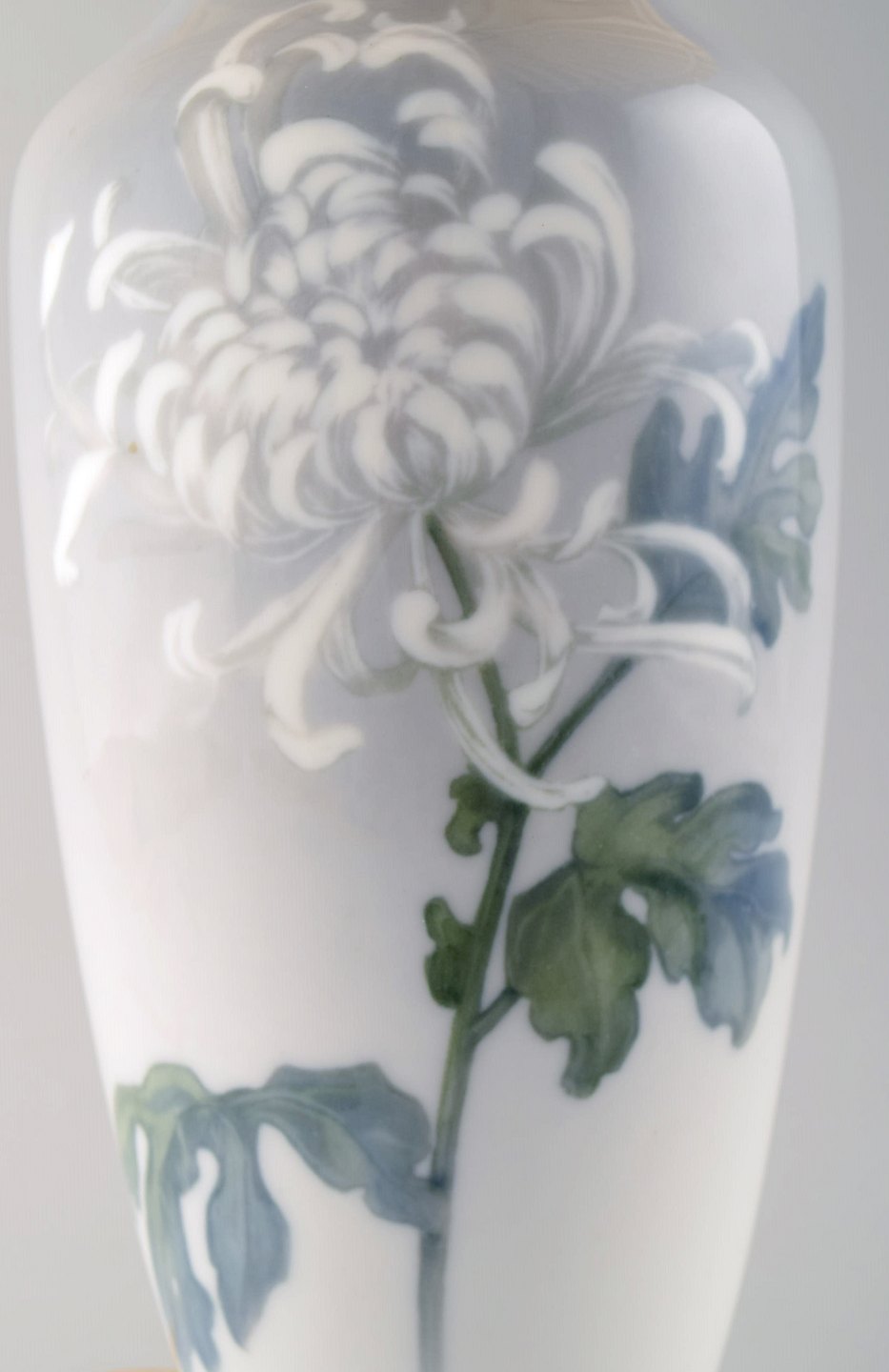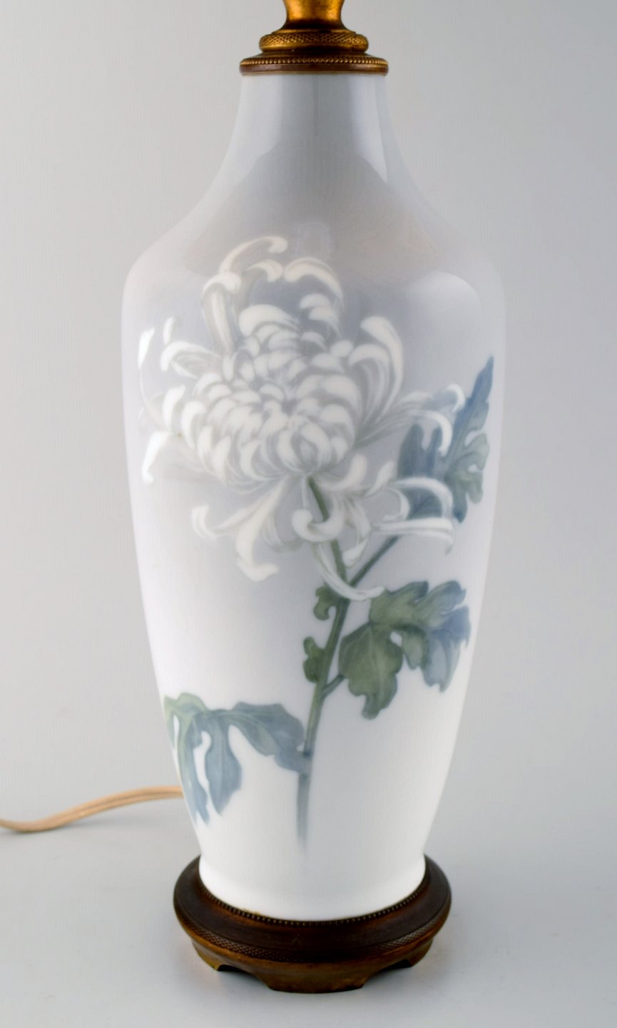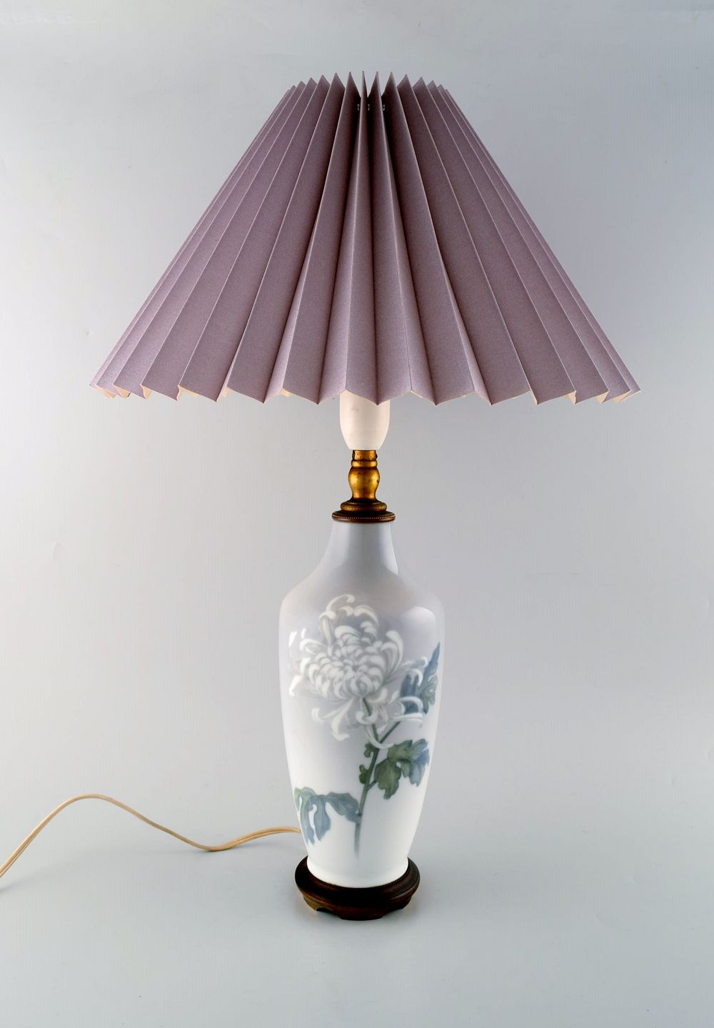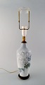 Royal Copenhagen stor bordlampe på messingstand dekoreret med blomster. 1930'erne. Le Klint skærm. I flot stand. Stemplet. 1. Sortering. Total højde 55 cm. Diameter på lampe: 14 cm.