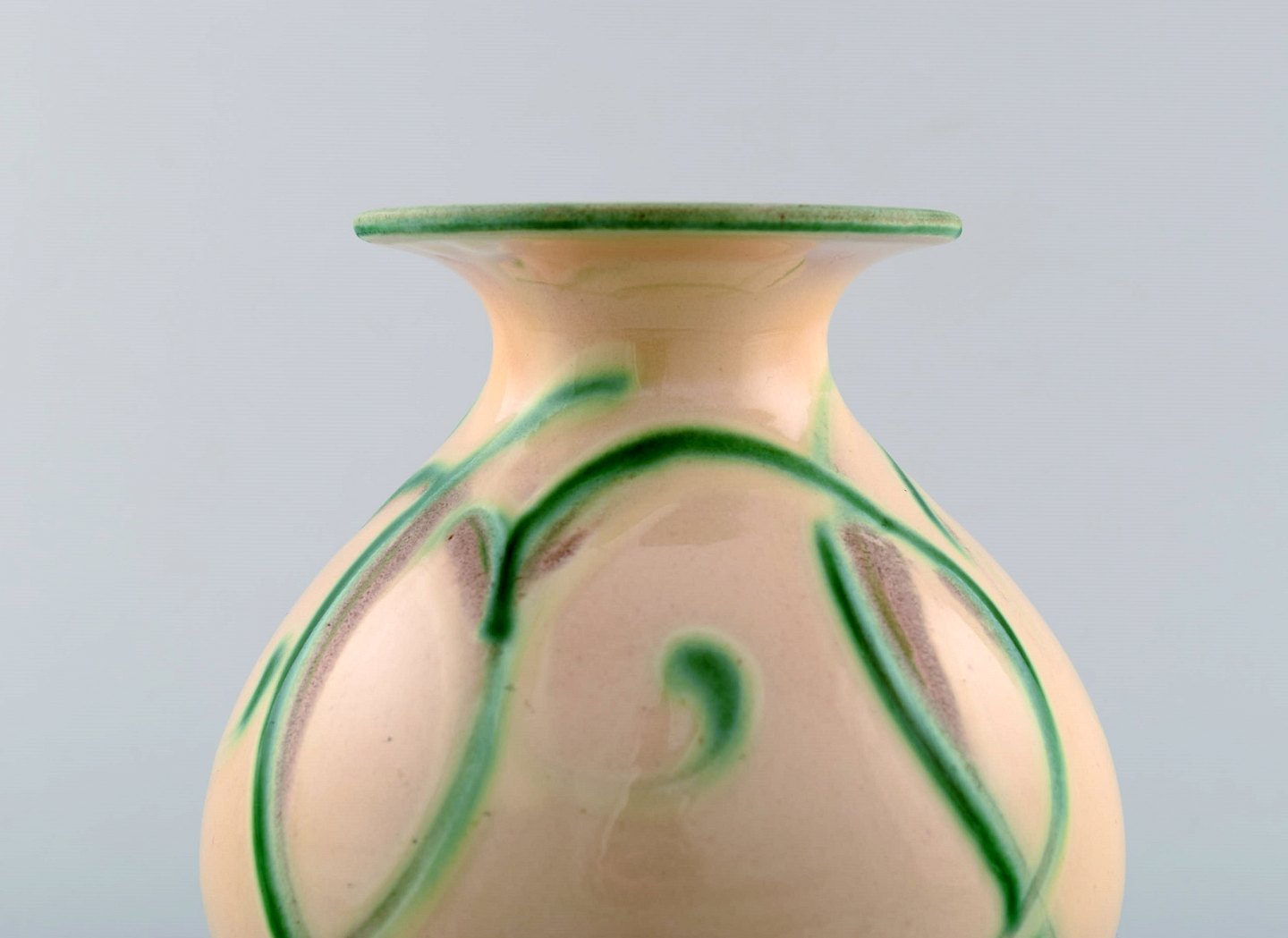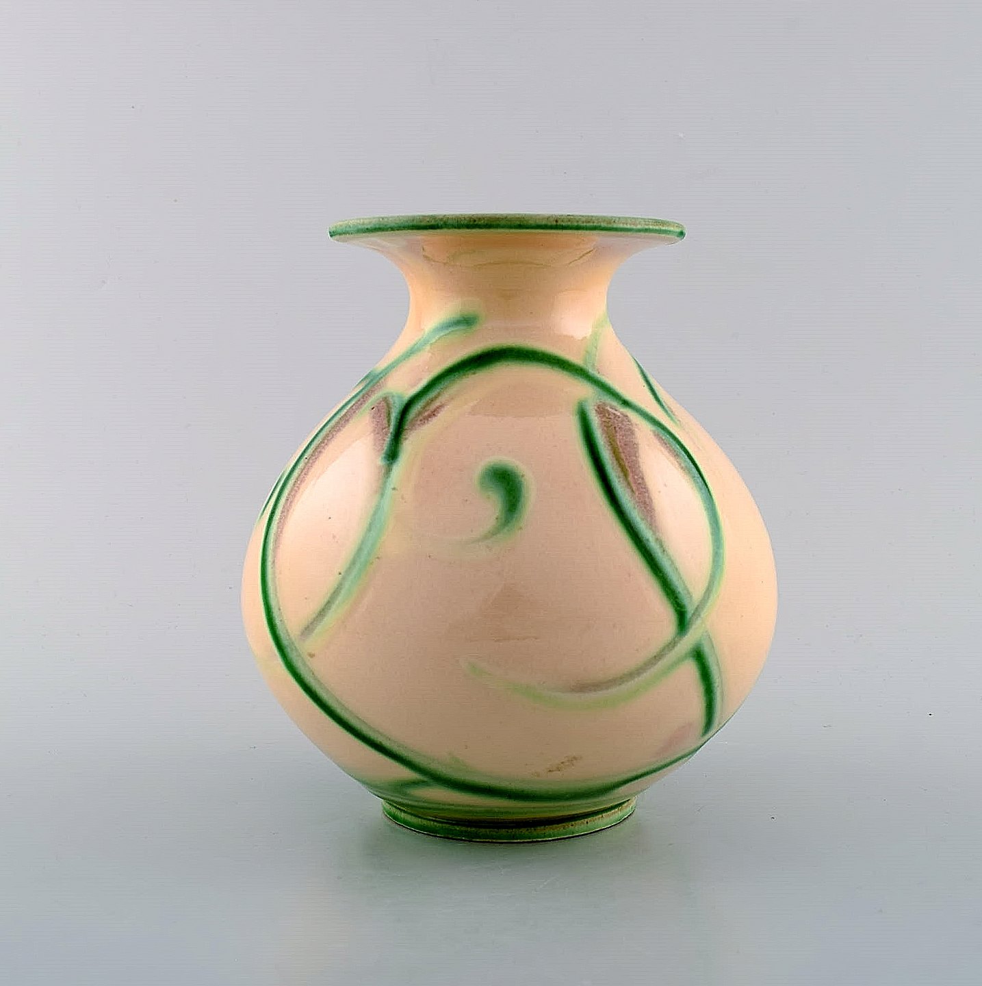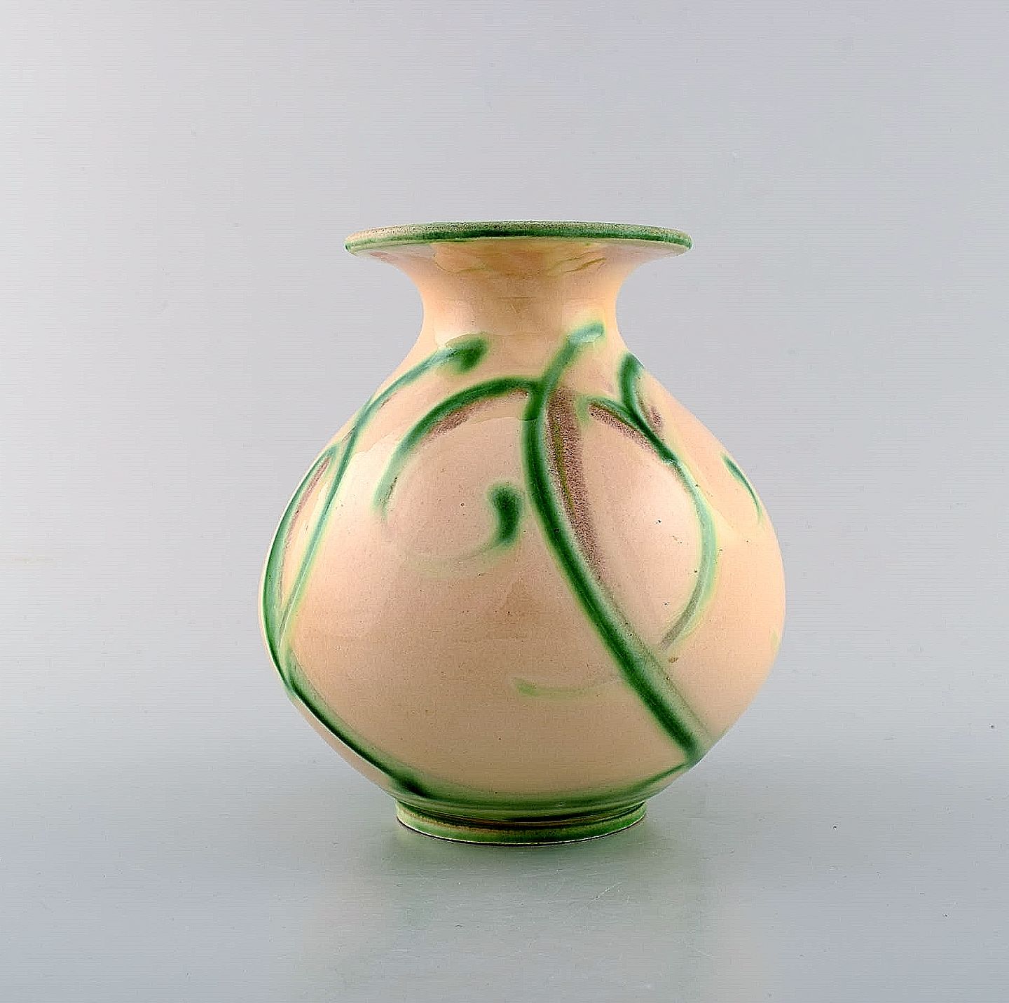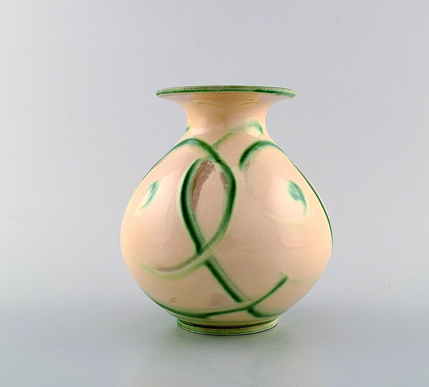 Kähler, Denmark, glazed stoneware vase in modern design. 1930 / 40's. Green pattern on light base. Cow horn technique. Stamped. Measures: 15 x 15 cm. In perfect condition.
