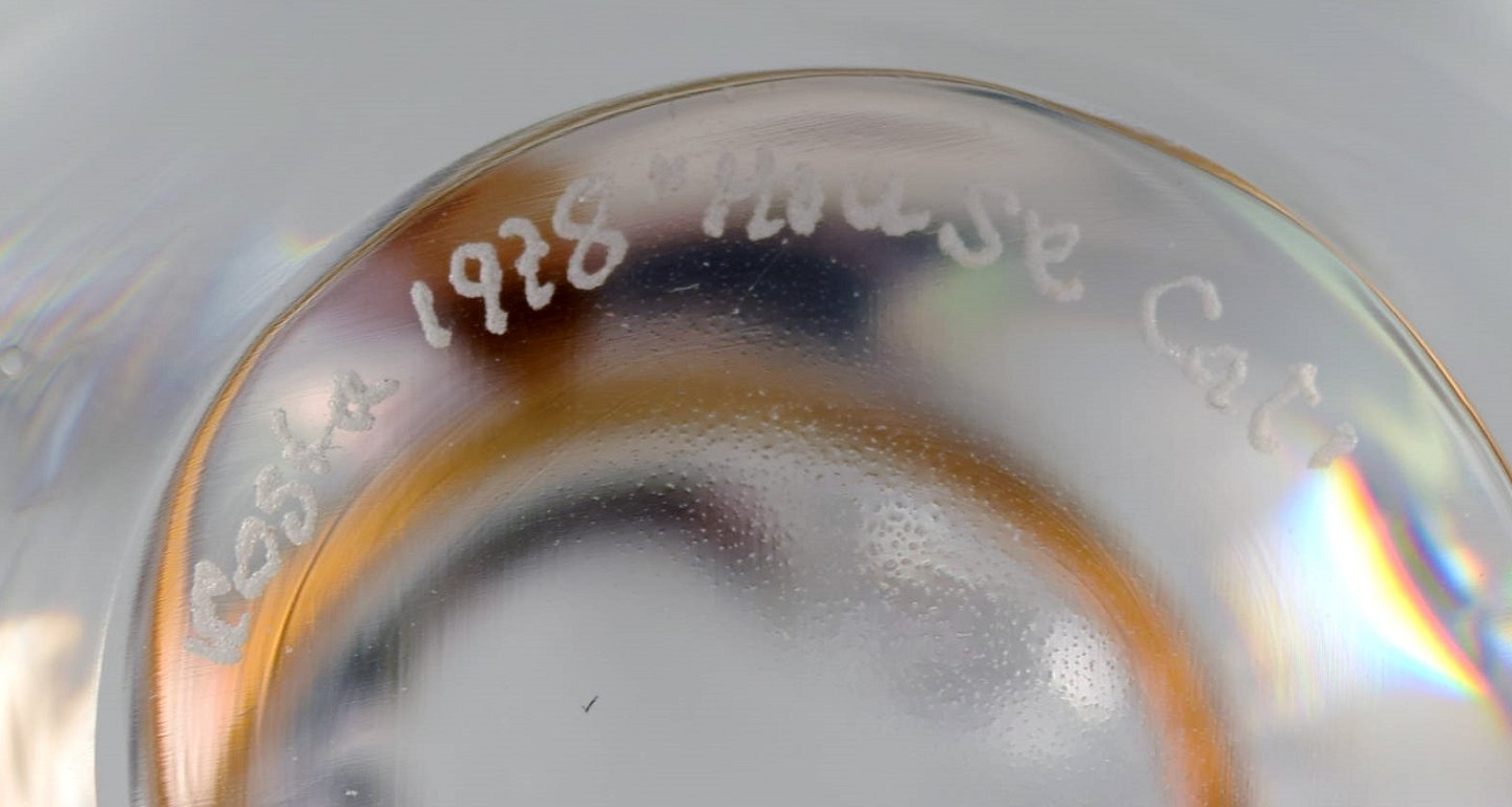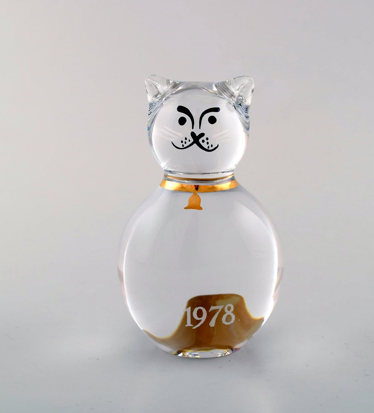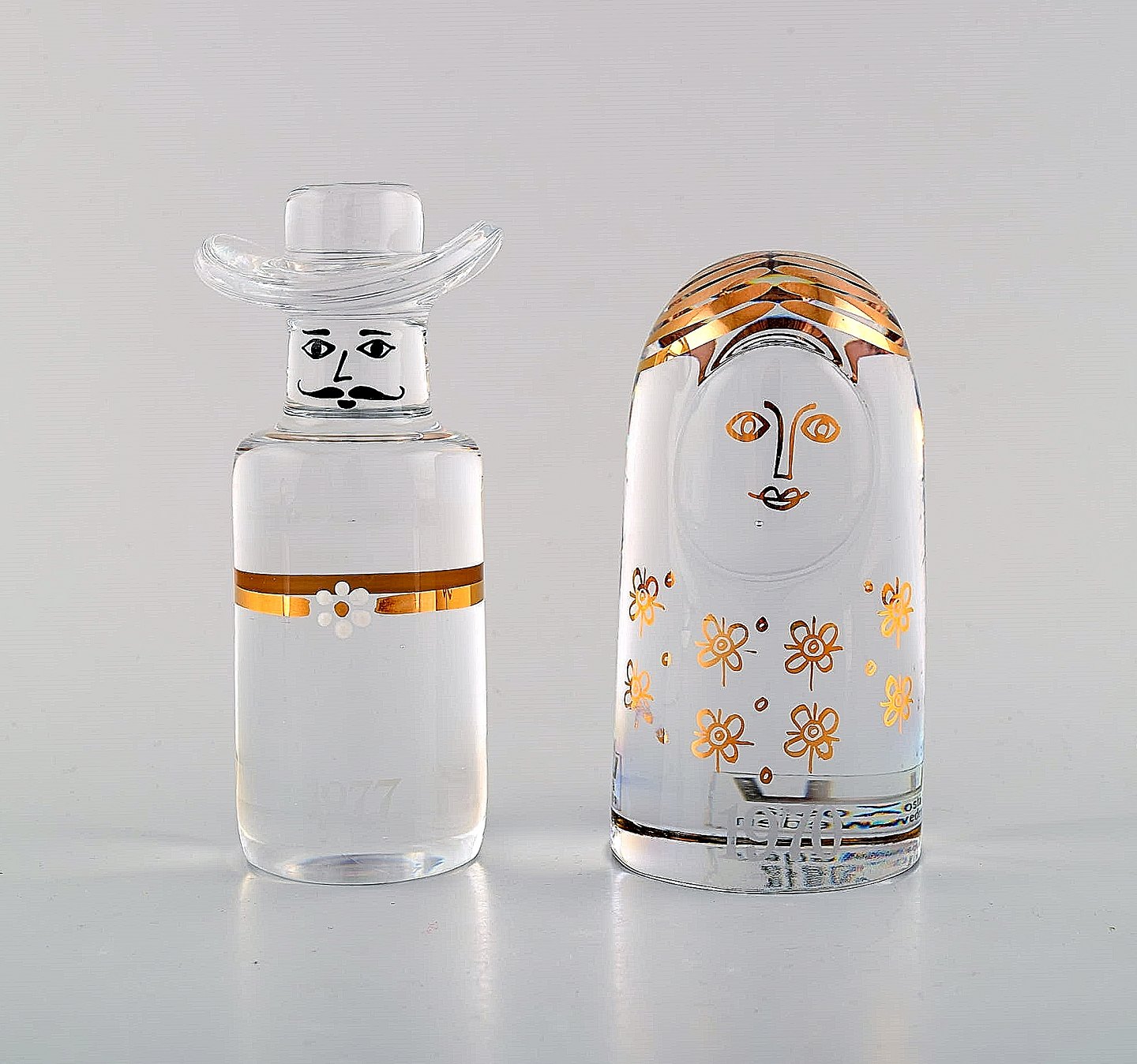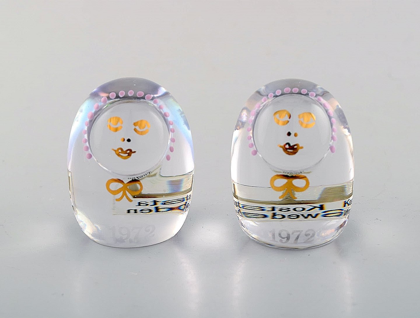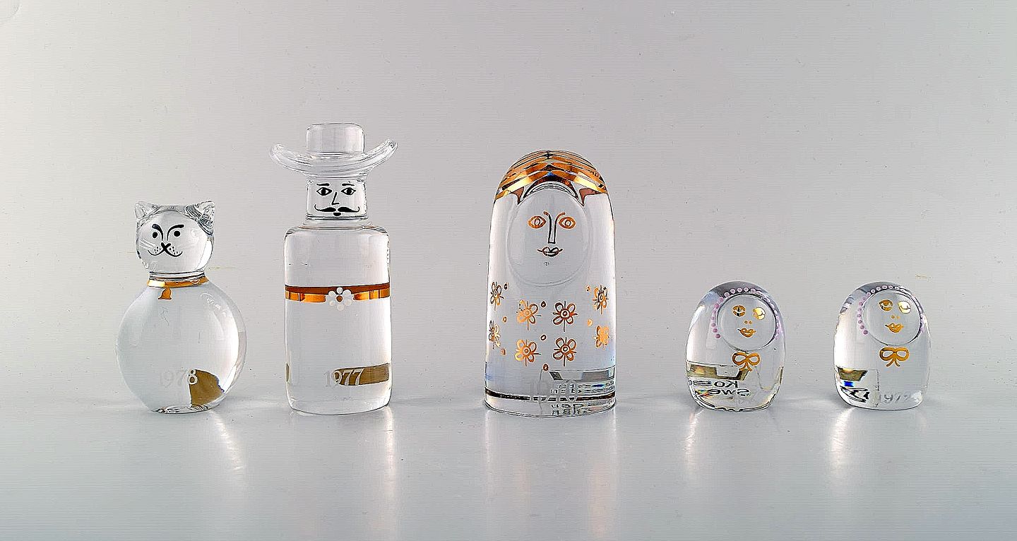 Collection of art glass figures 'family', Kosta Boda, Sweden. Engraved and hand painted decoration. Marked with year. Largest measures: 15,5 x 5,5 cm. In perfect condition.
