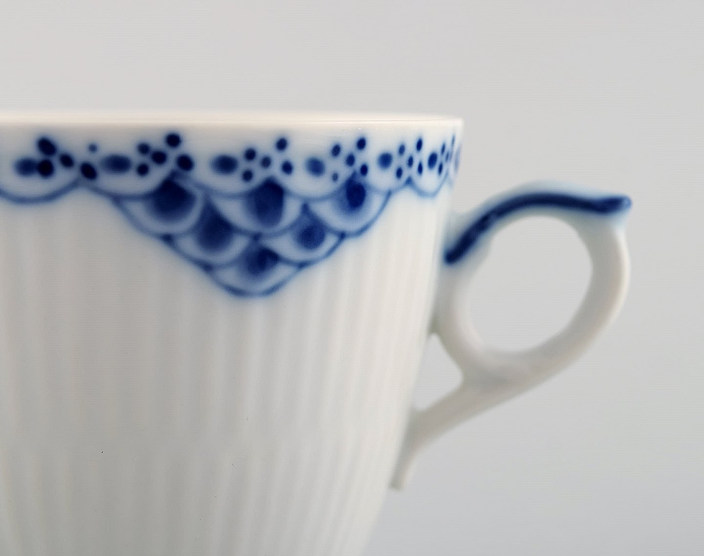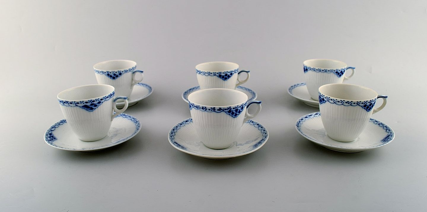 Royal Copenhagen blåmalet Prinsesse kaffekop med underkop i porcelæn. Sæt på 6 stk. Modelnummer 719. 2. sortering. I perfekt stand. Koppen måler: 7 x 6,5 cm. Underkoppen: 12,5 cm.
